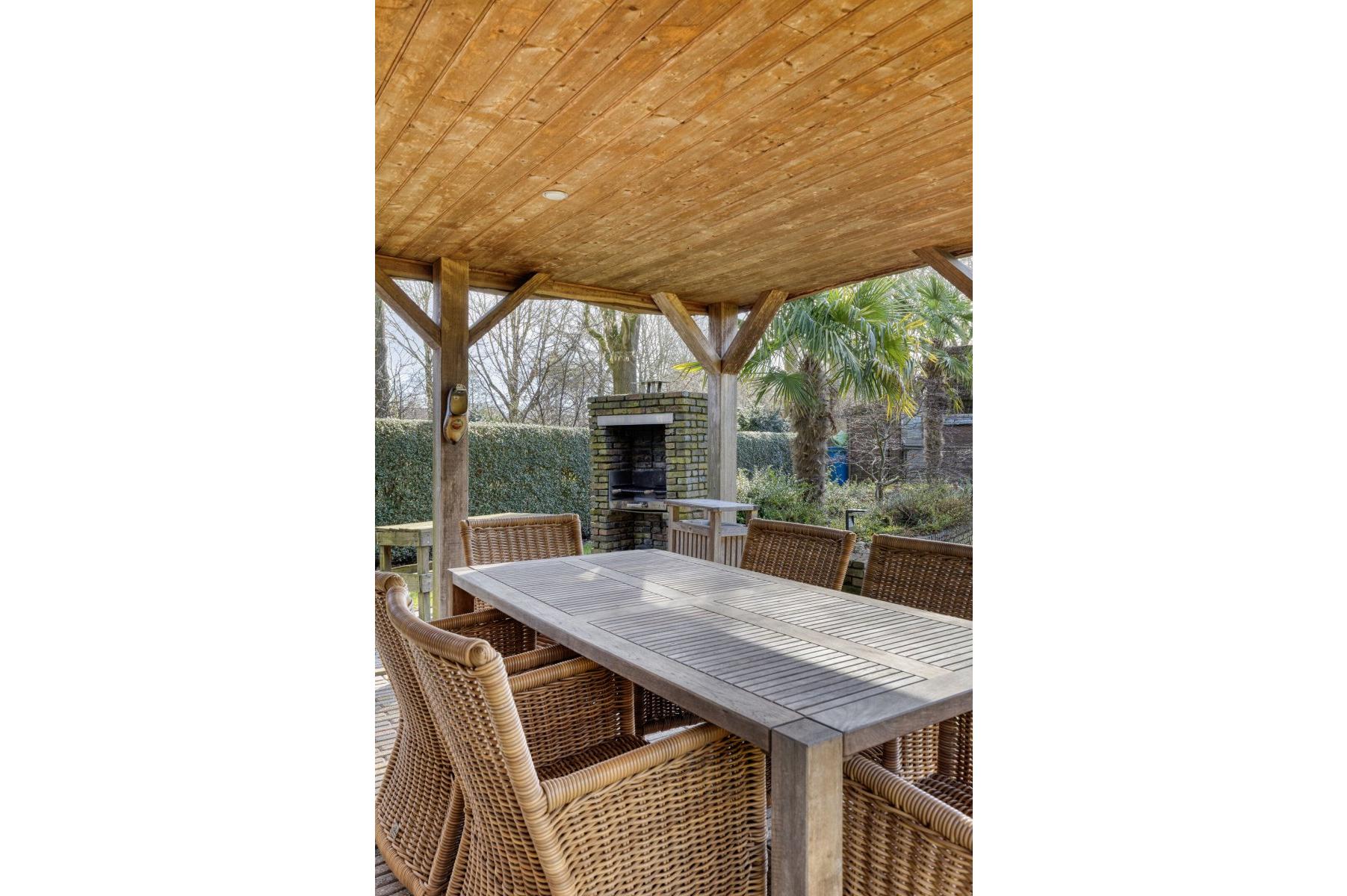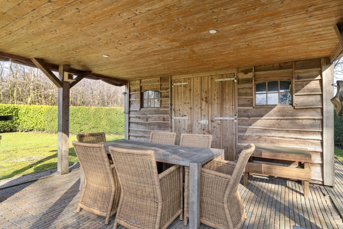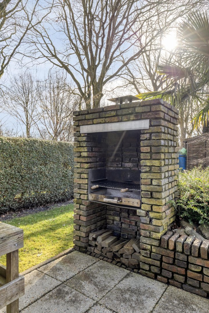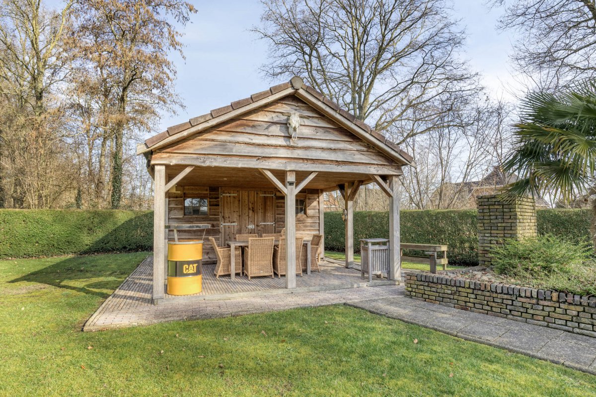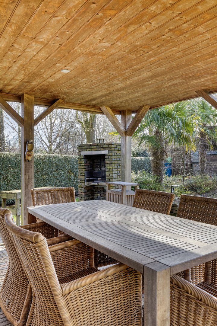 De tuin is voorzien van een houten chalet ca.4.45x3.00m met een terrasoverkapping van 4.75x3.95m en een buiten bbq, het chalet is voorzien van een keukenblok, verder is er een overkapping voor houtopslag aanwezig.