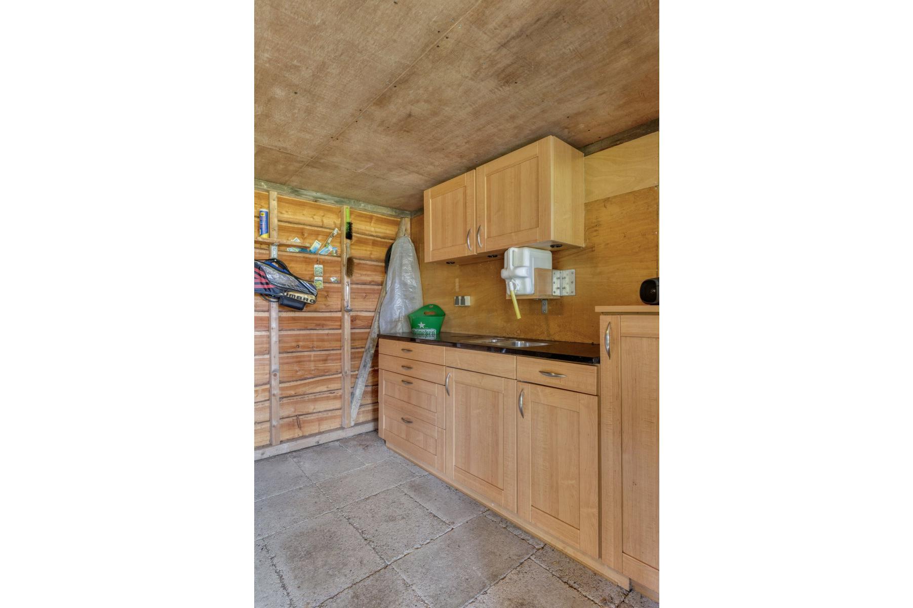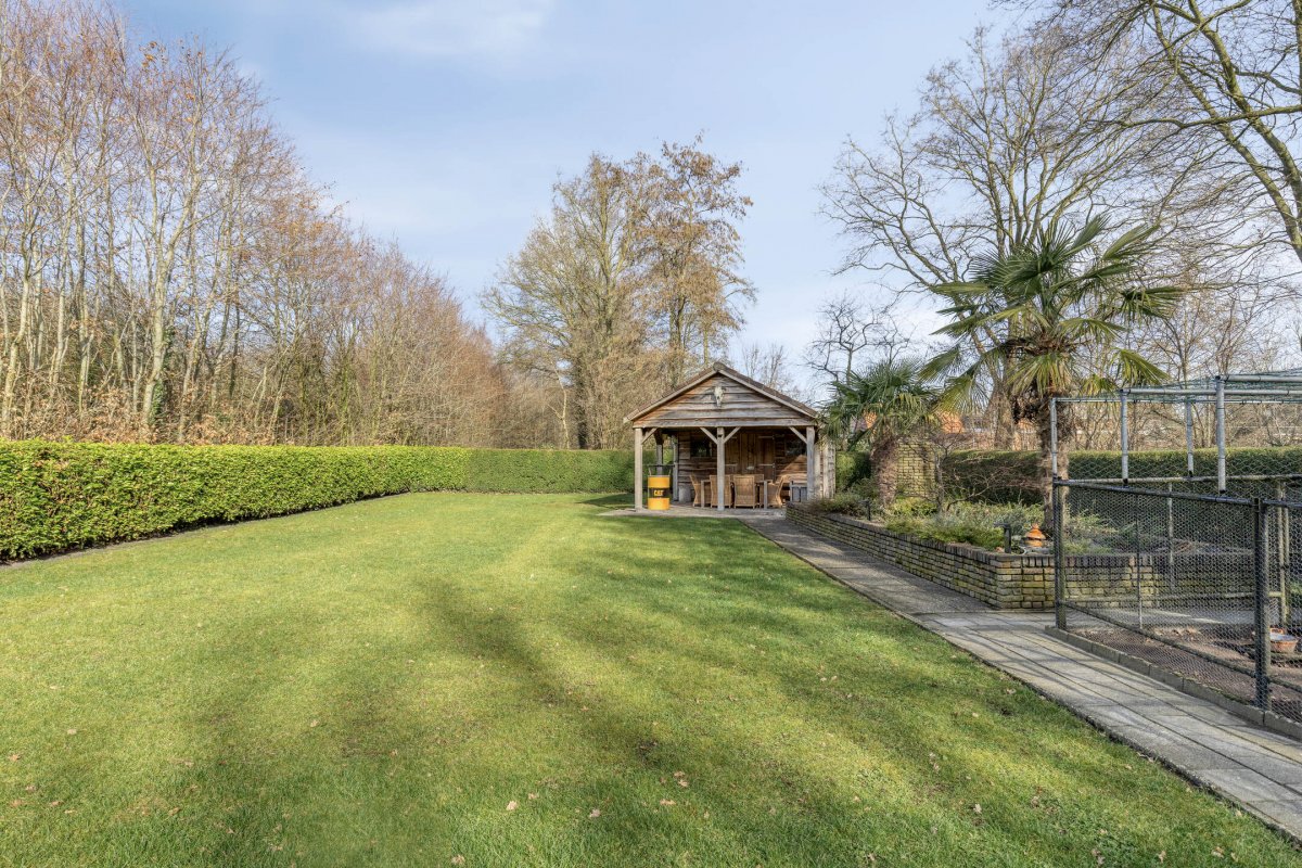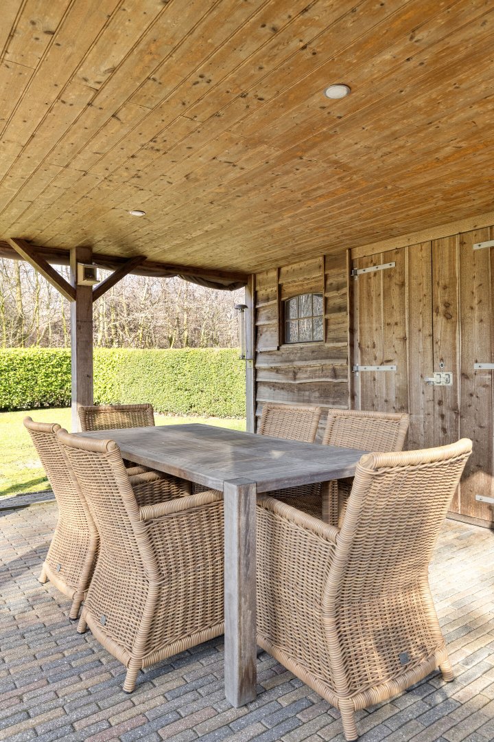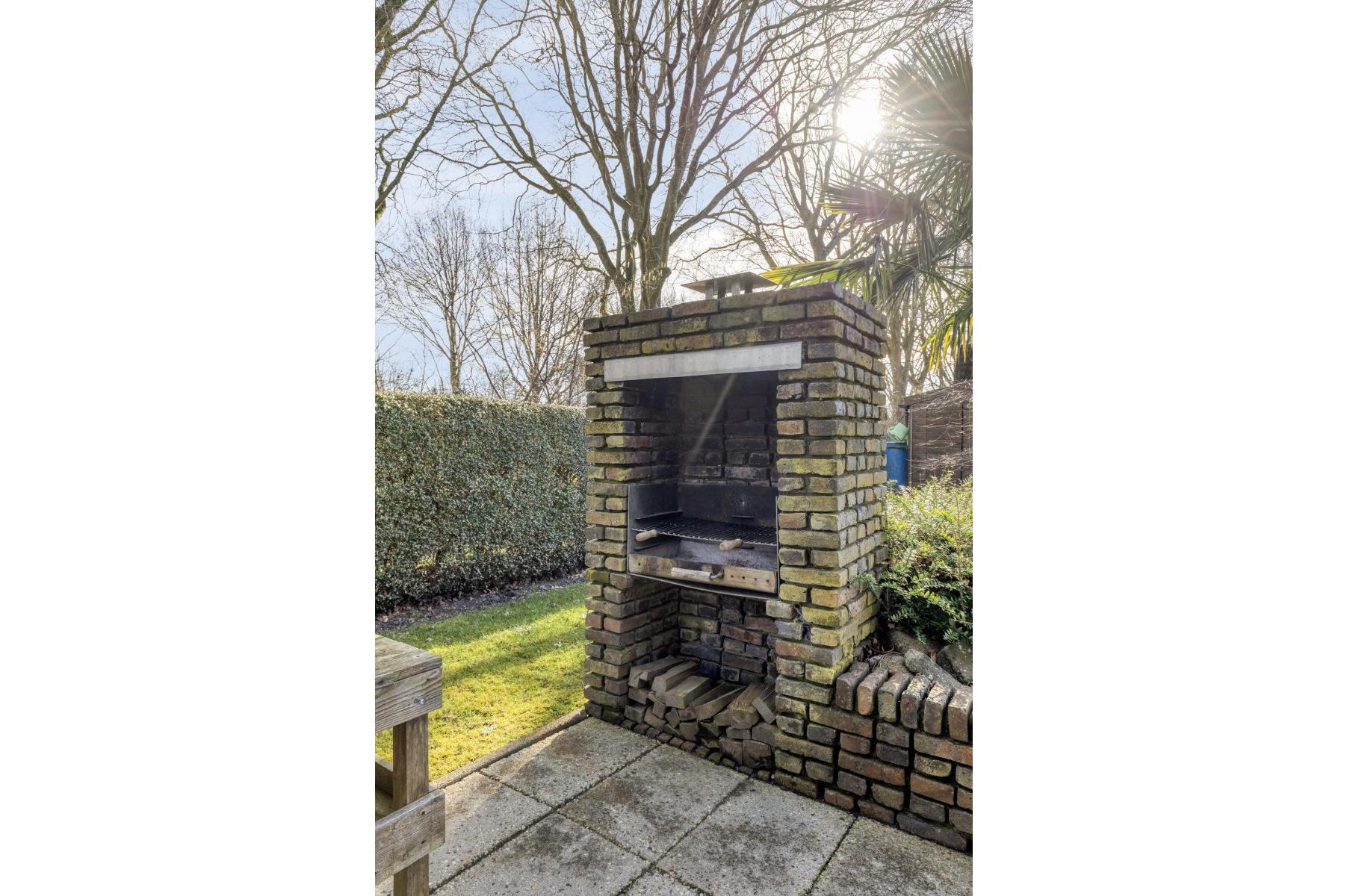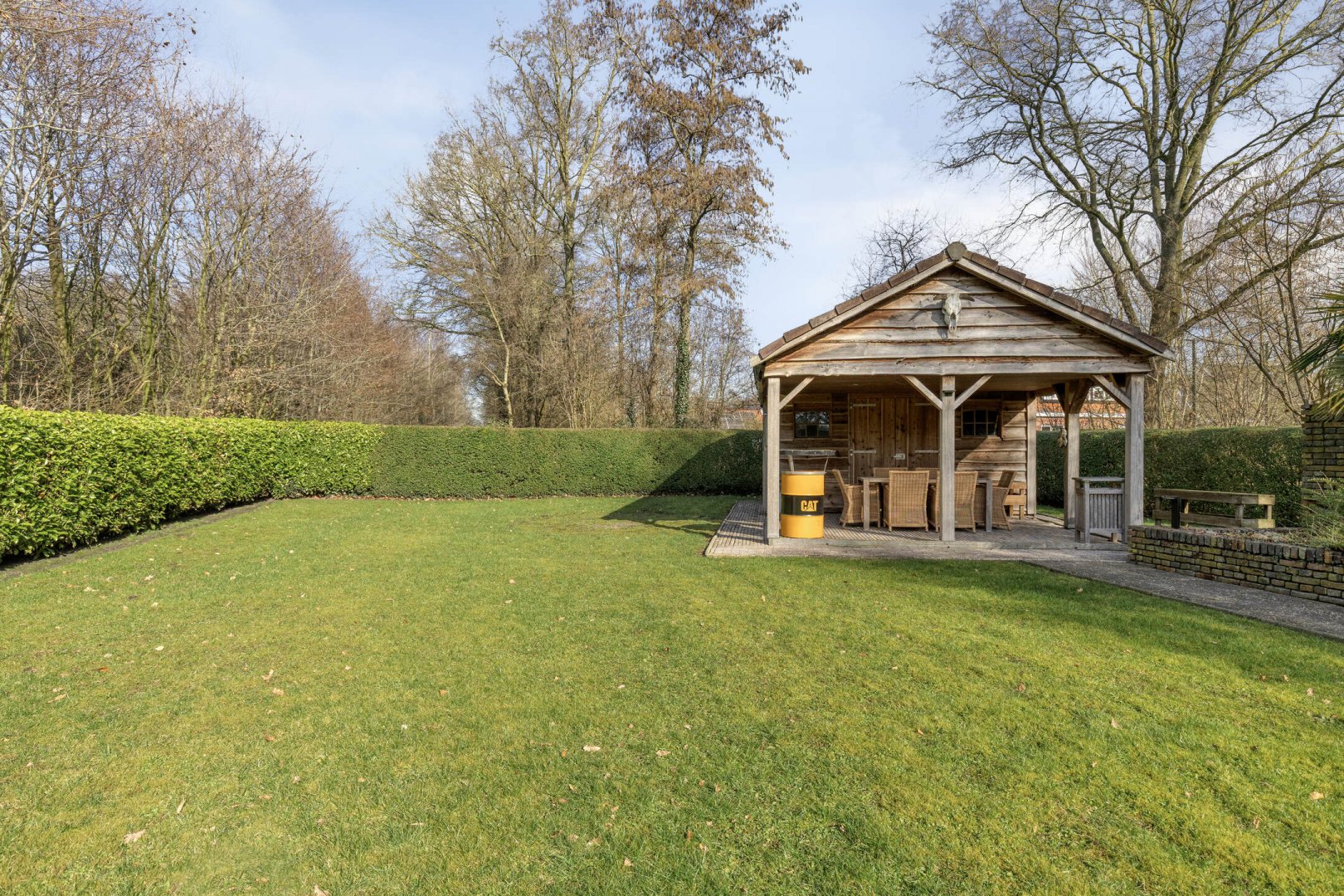 De tuin is voorzien van een houten chalet ca.4.45x3.00m met een terrasoverkapping van 4.75x3.95m en een buiten bbq, het chalet is voorzien van een keukenblok, verder is er een overkapping voor houtopslag aanwezig.