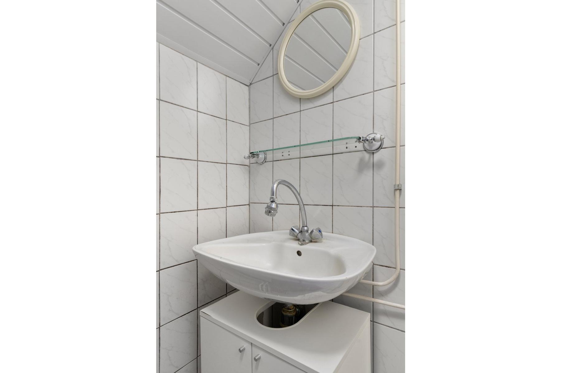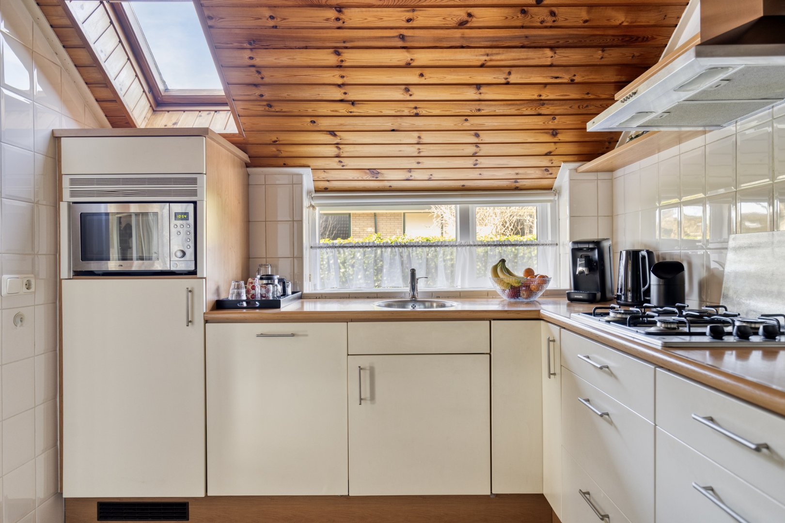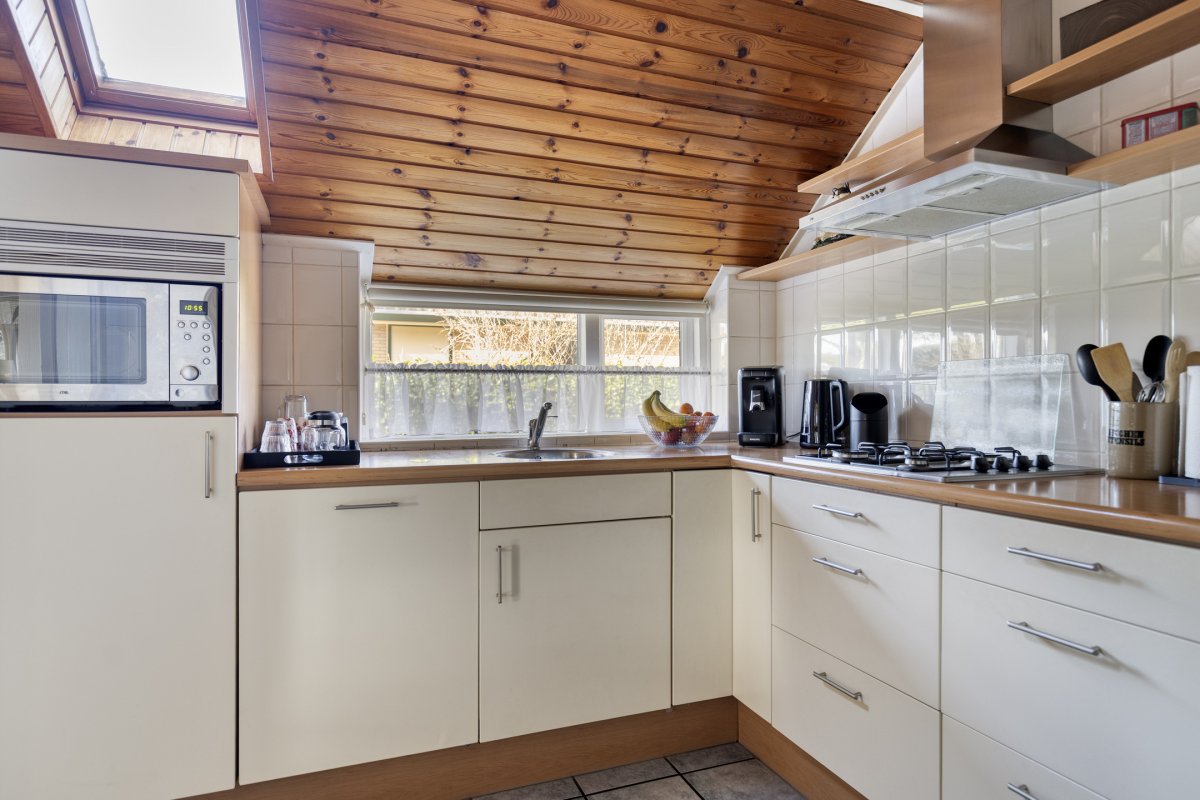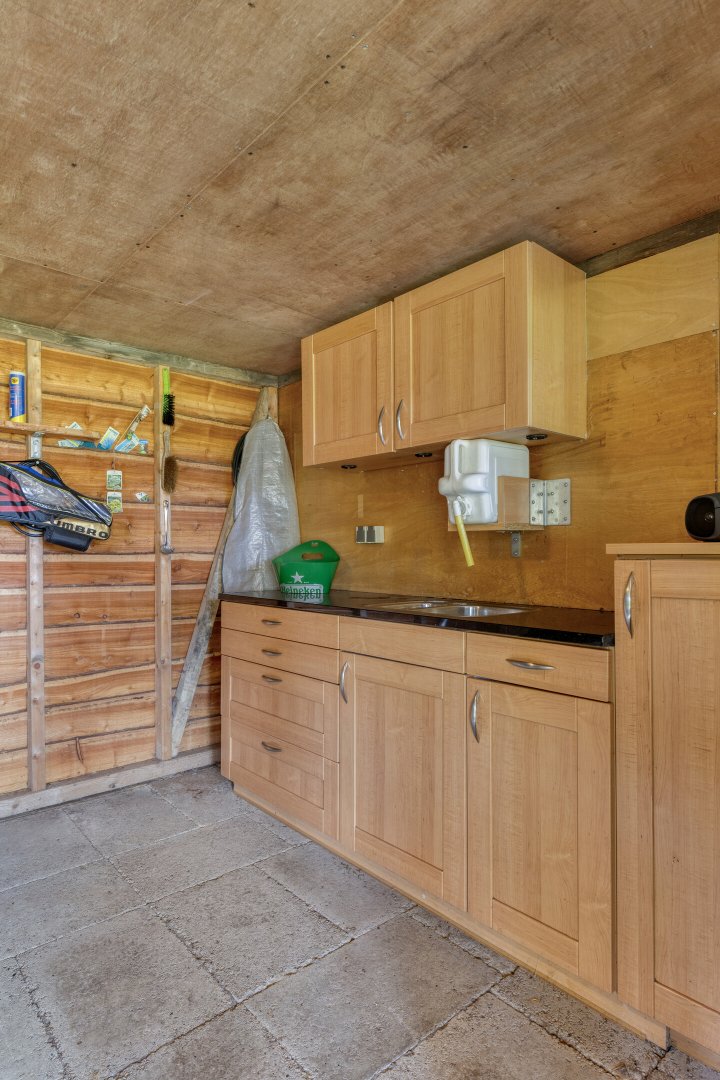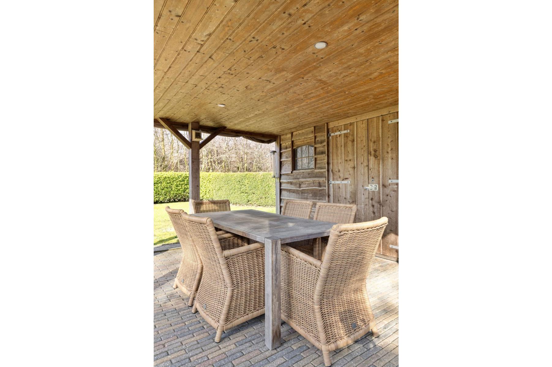 De tuin is voorzien van een houten chalet ca.4.45x3.00m met een terrasoverkapping van 4.75x3.95m en een buiten bbq, het chalet is voorzien van een keukenblok, verder is er een overkapping voor houtopslag aanwezig.