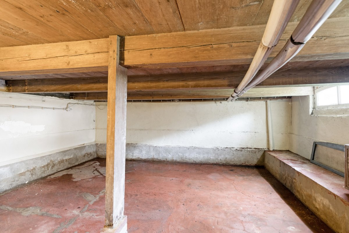 Zijentree/hal, provisiekelder ca.27m², toilet met fontein en douche (mechanische ventilatie), L-vormige woonkamer ca.39m² met schouw en houtkachel (plankenvloer), tussenhal, drie slaapkamers van respectievelijk ca.4.30x3,85m, ca.5.70x4.35m en ca.4.30x3.20m.