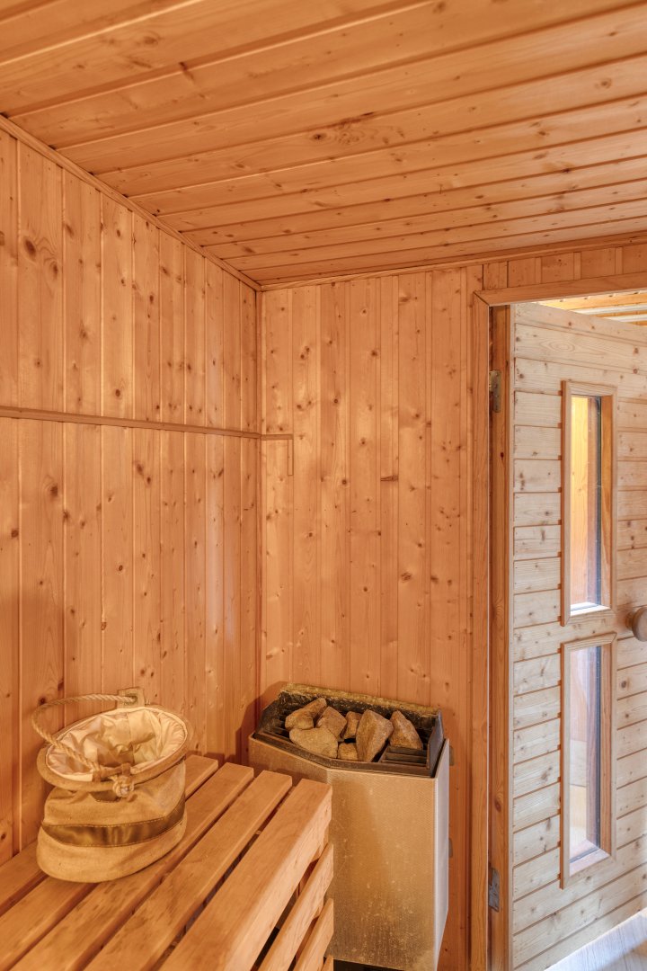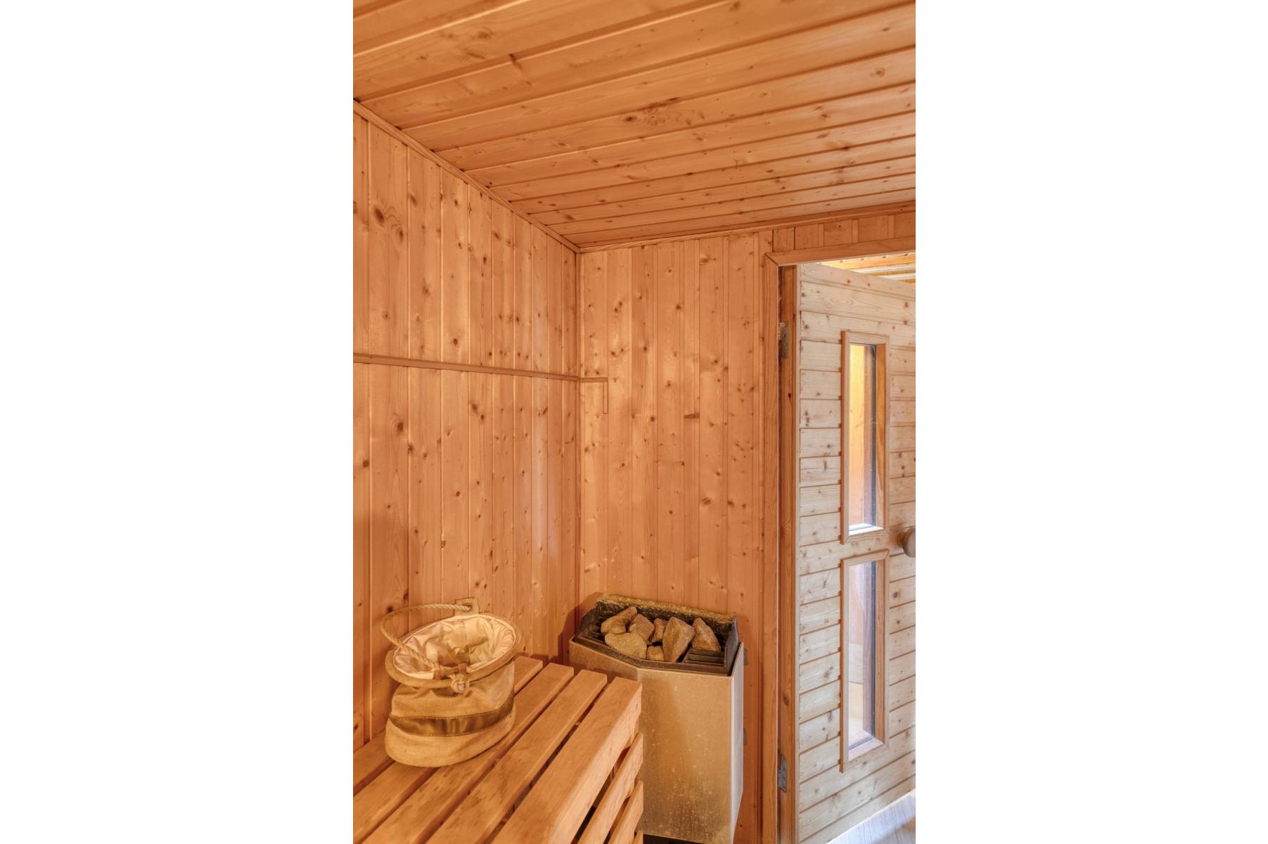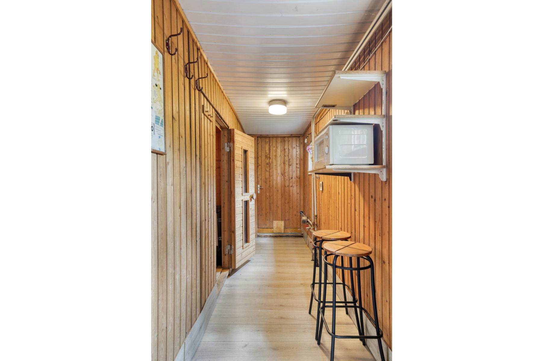 Daarnaast een sauna en een inpandige schuurruimte met betonvloer en twee baanderdeuren.