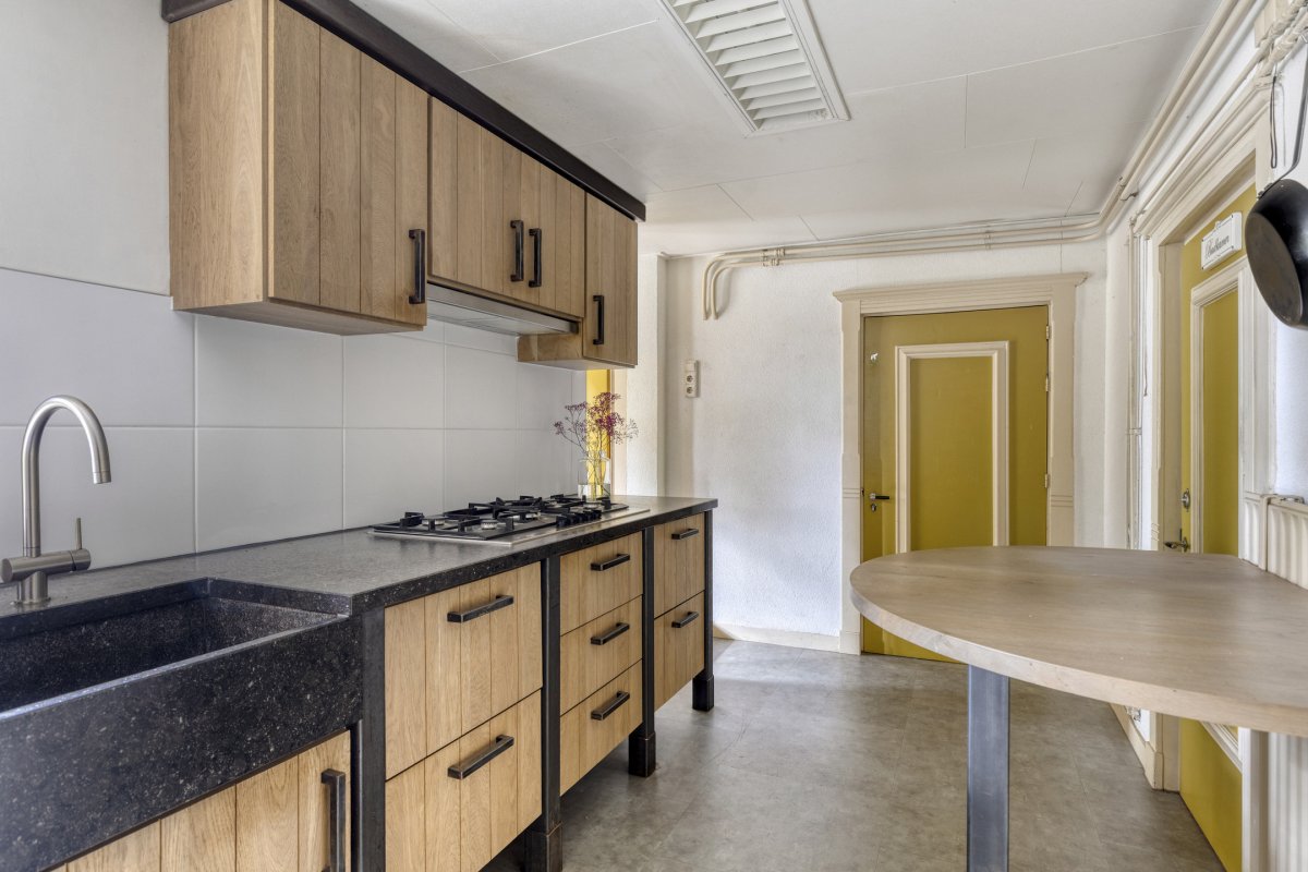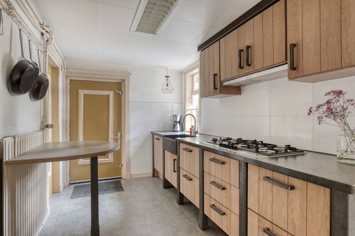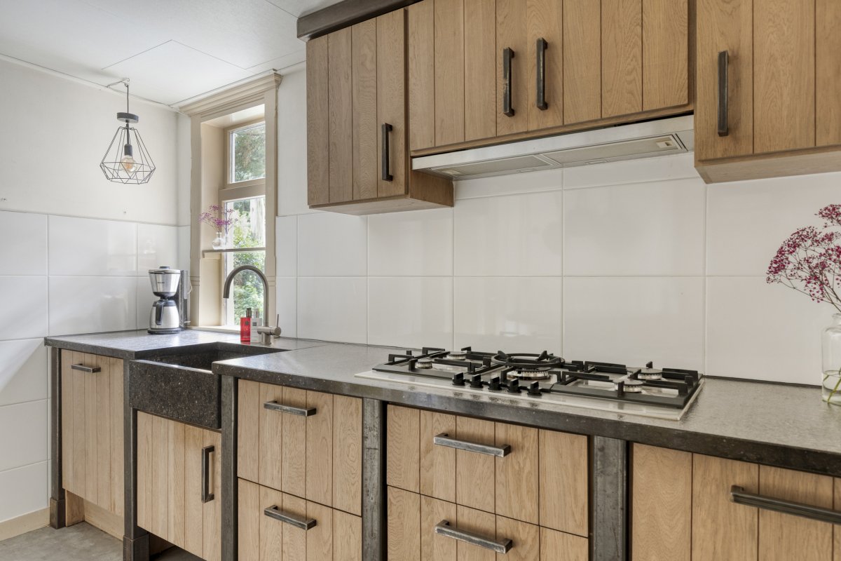De keuken (ca. 11 m²) in lichte kleurstelling is uitgerust met een 5-pits gaskookplaat, rvs-wasemkap, natuurstenen werkblad en vaatwasser (2017).