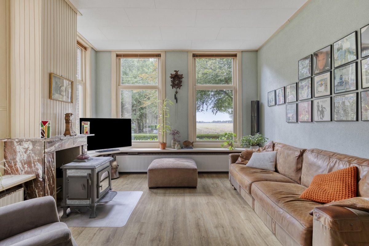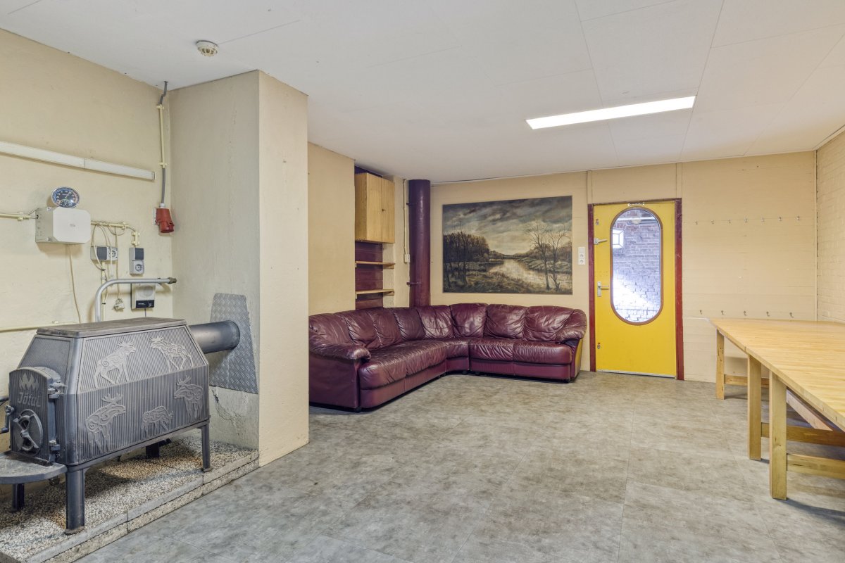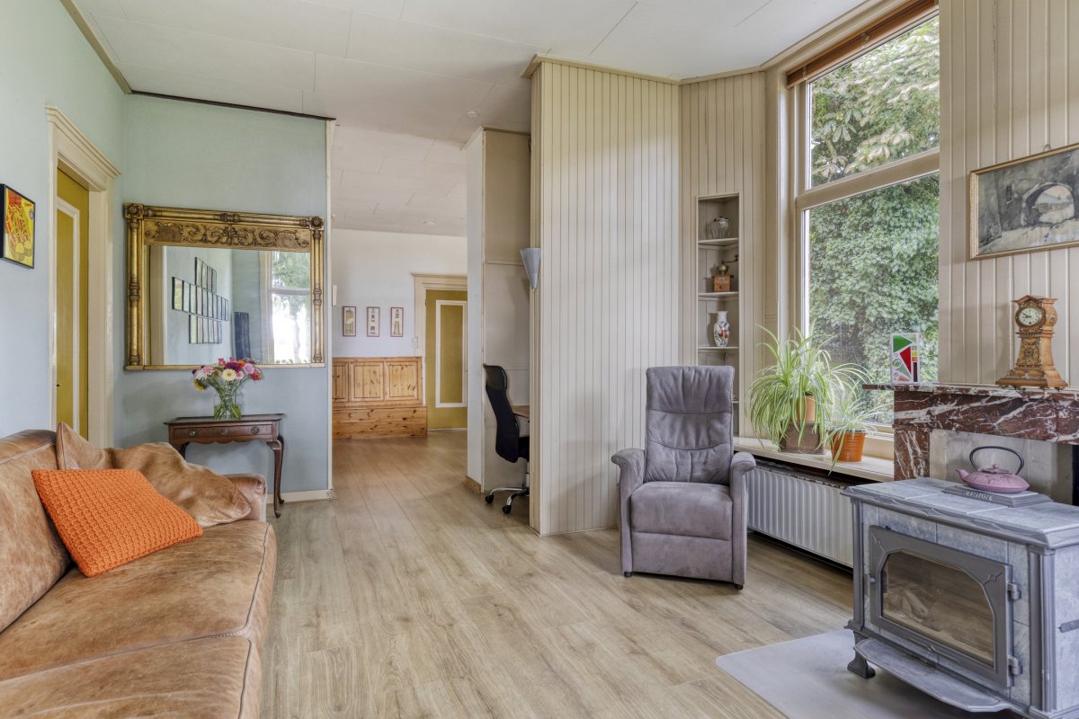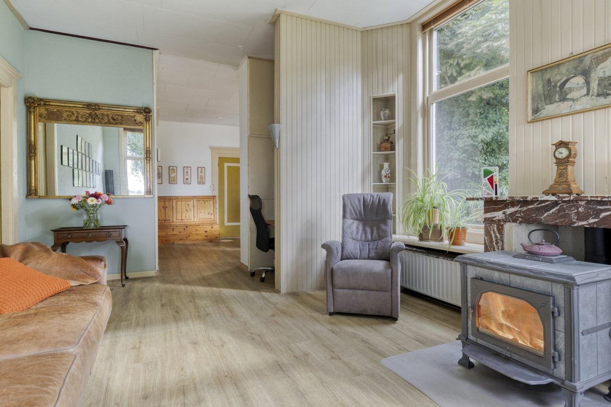 Entree/hal (ca. 5,20 x 1,40 m) met laminaatvloer en glas-in-looddetails, provisiekelder (ca. 4,20 x 2,80 m), woonkamer (ca. 43 m²) met schouw en houtkachel.