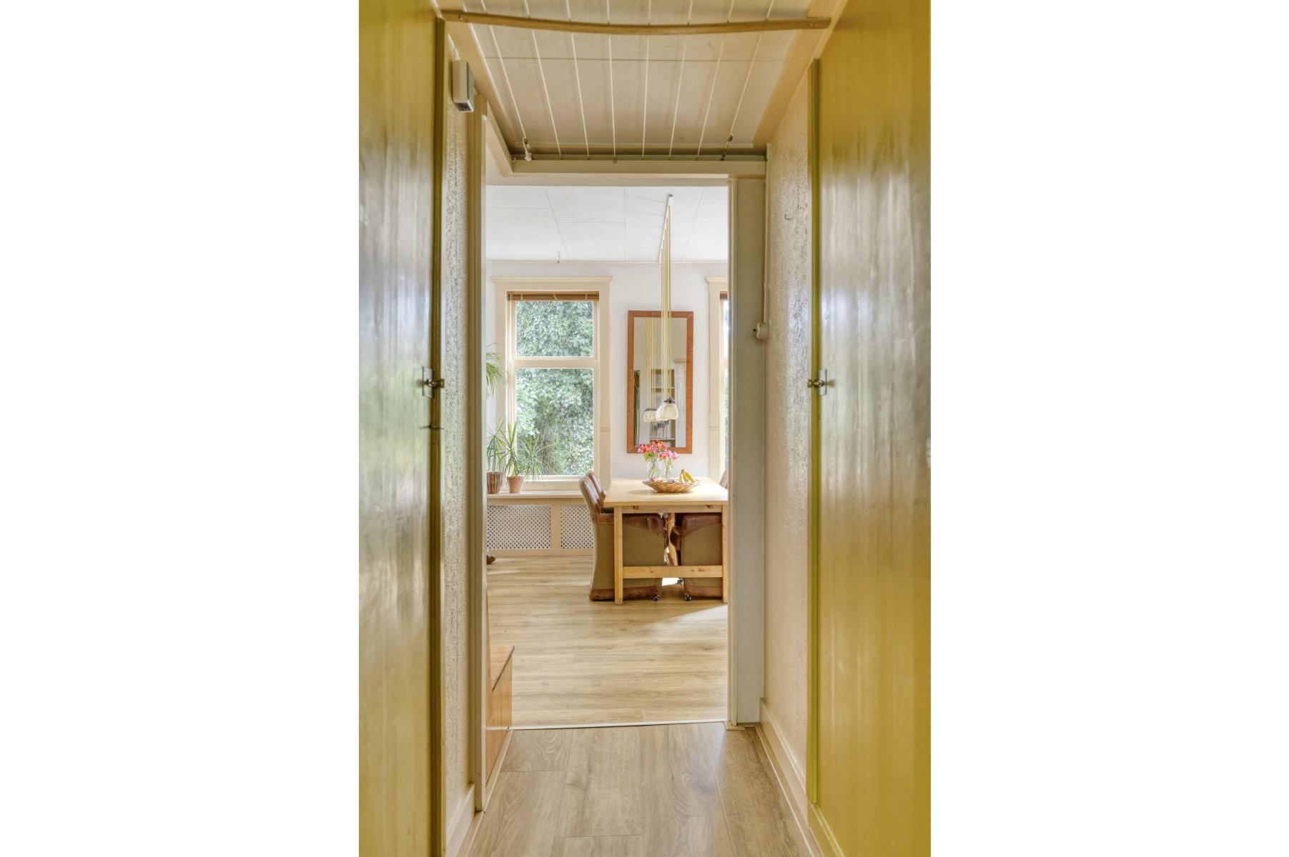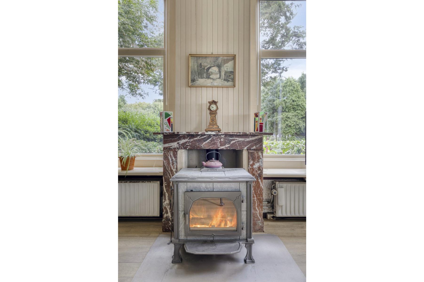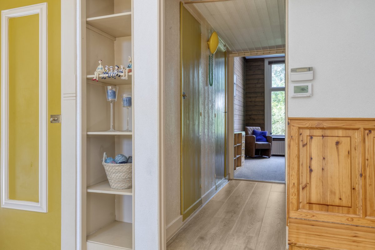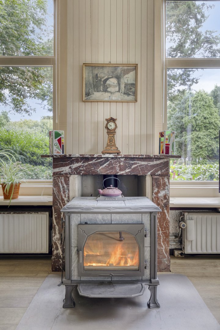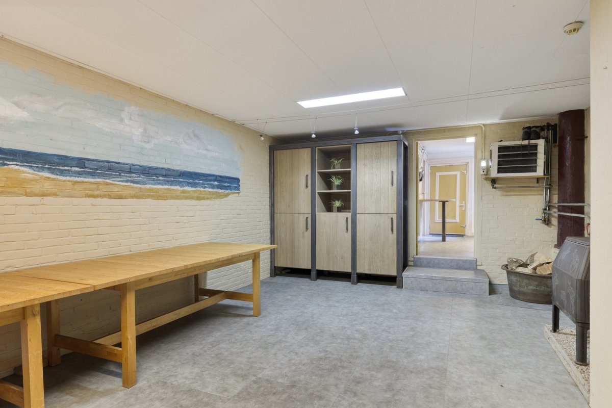 Entree/hal (ca. 5,20 x 1,40 m) met laminaatvloer en glas-in-looddetails, provisiekelder (ca. 4,20 x 2,80 m), woonkamer (ca. 43 m²) met schouw en houtkachel.