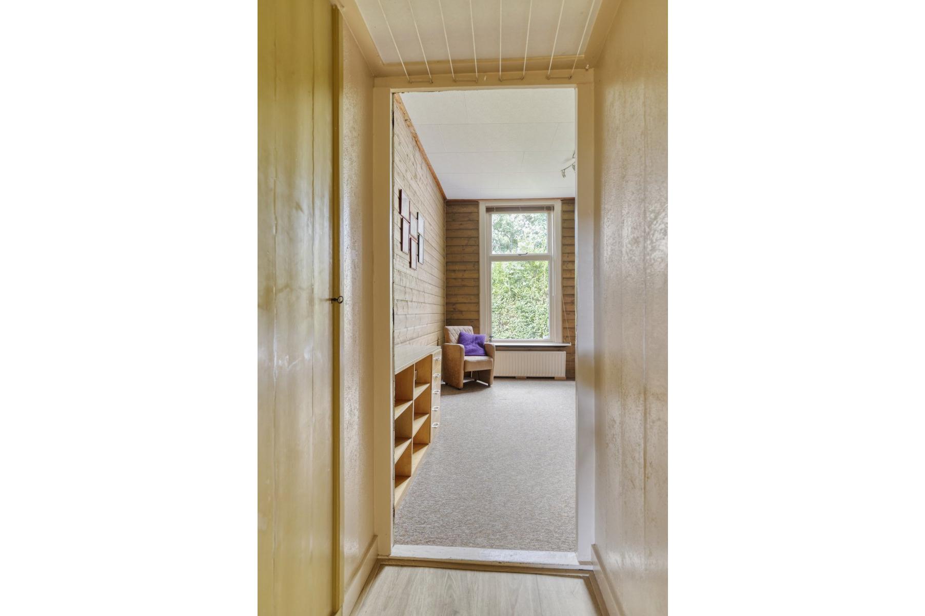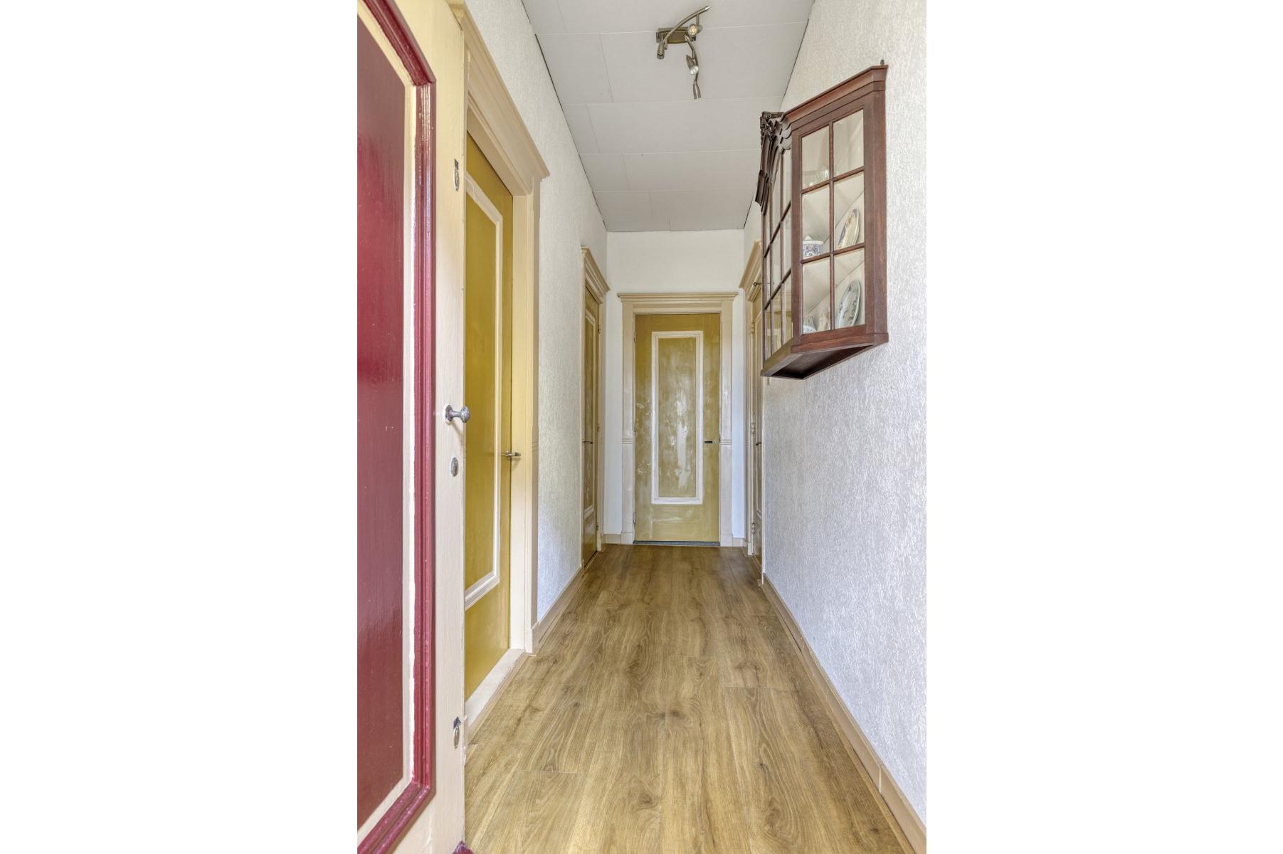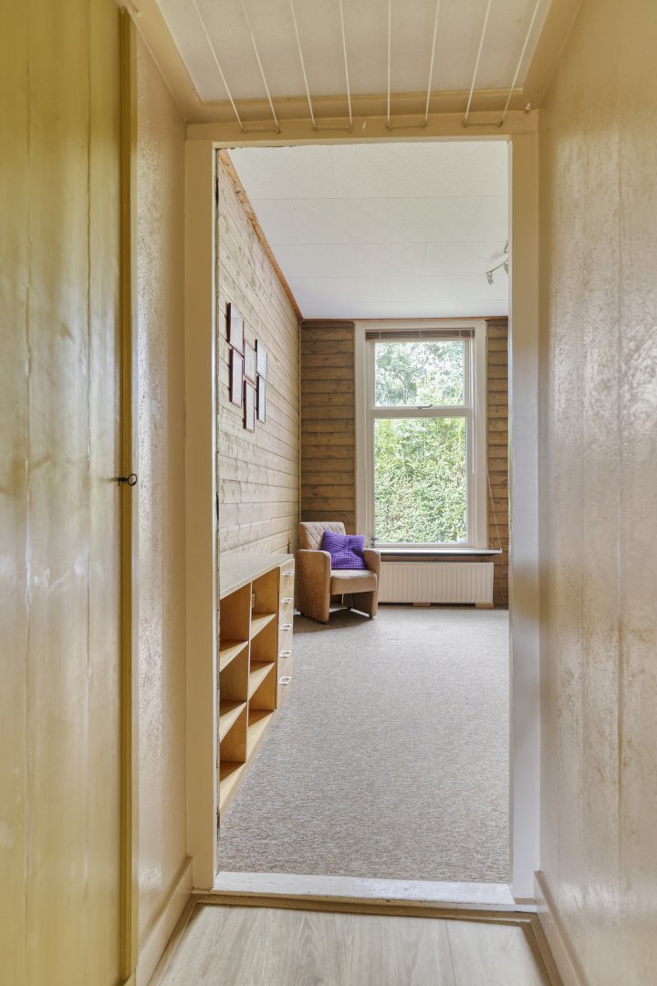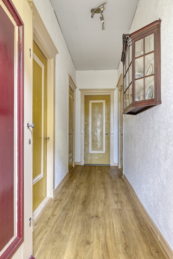 Entree/hal (ca. 5,20 x 1,40 m) met laminaatvloer en glas-in-looddetails, provisiekelder (ca. 4,20 x 2,80 m), woonkamer (ca. 43 m²) met schouw en houtkachel.