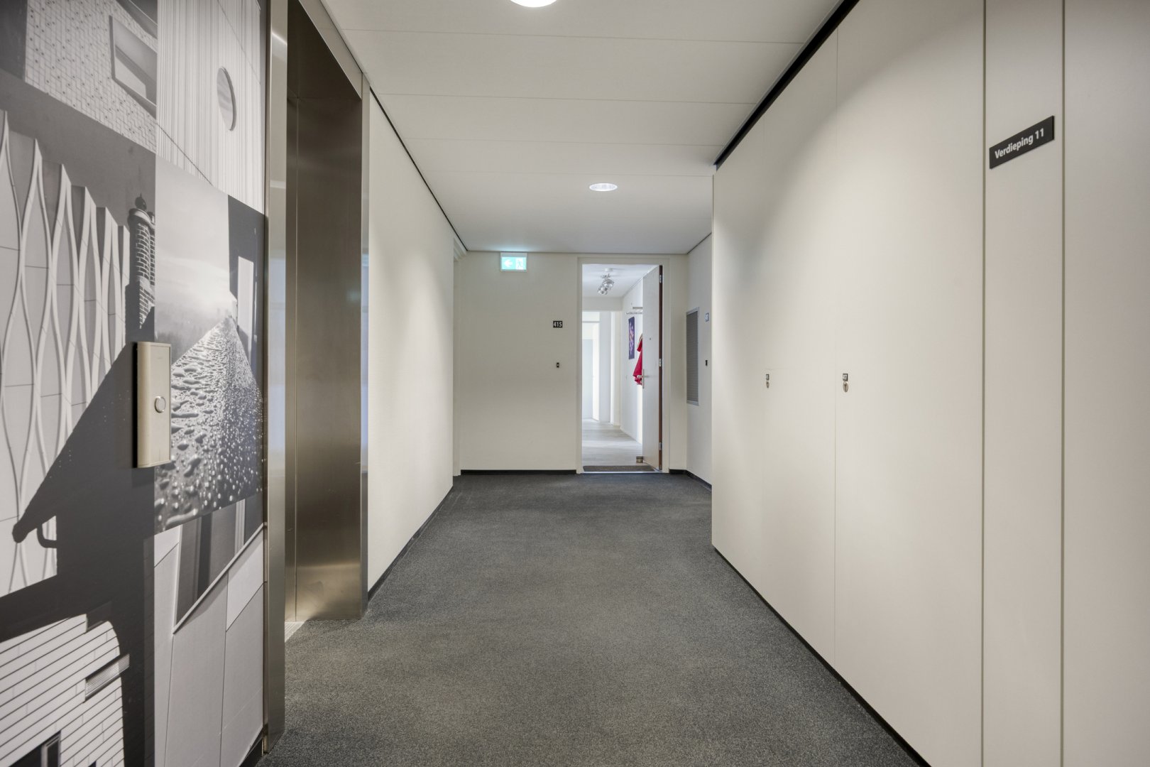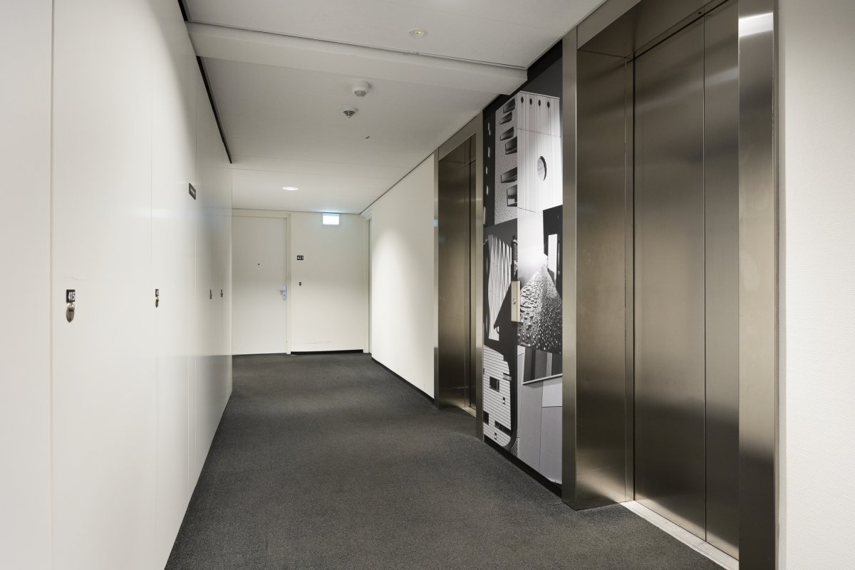 Afgesloten entree met videofoon-installatie, hal en twee liften.