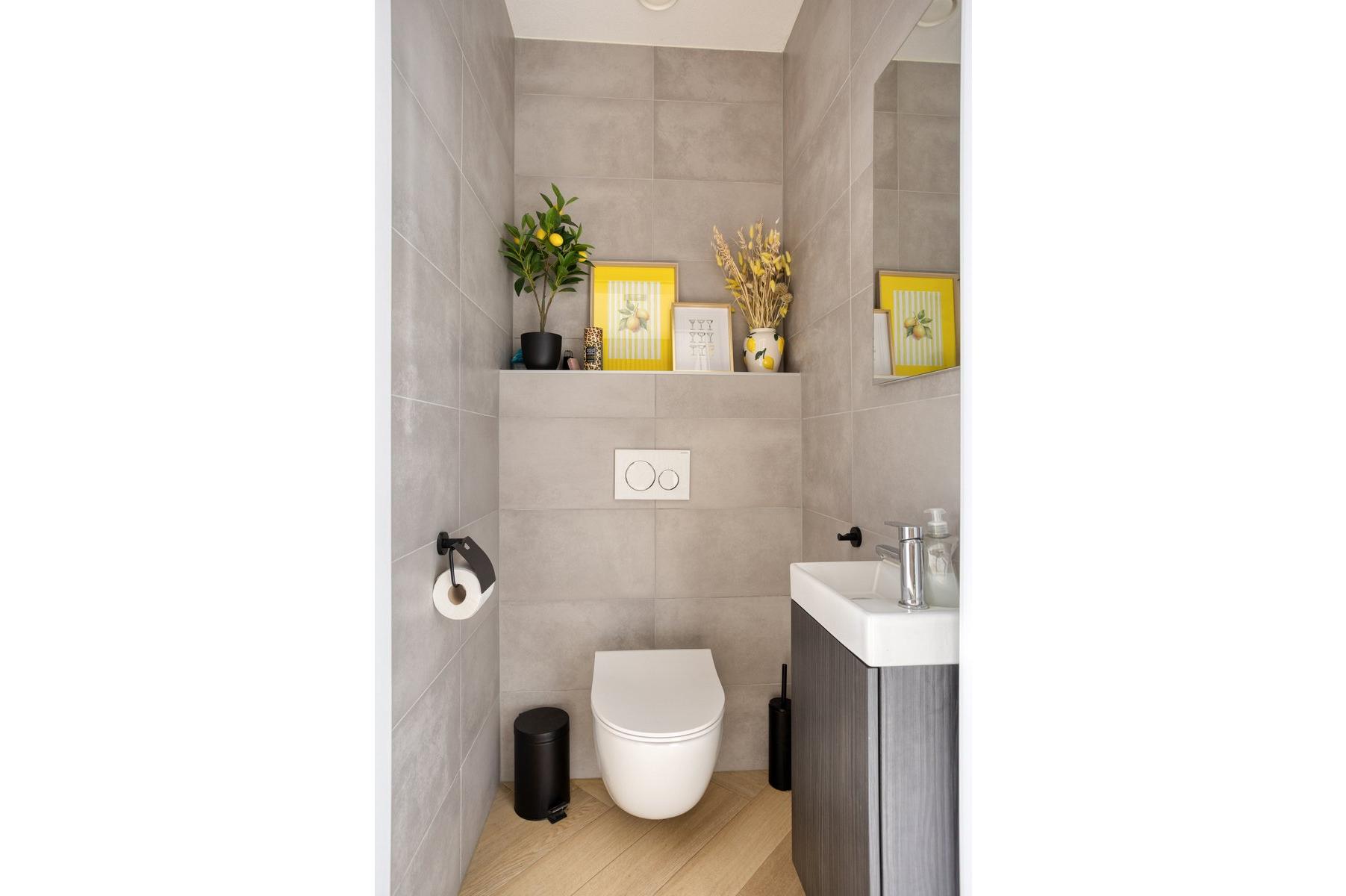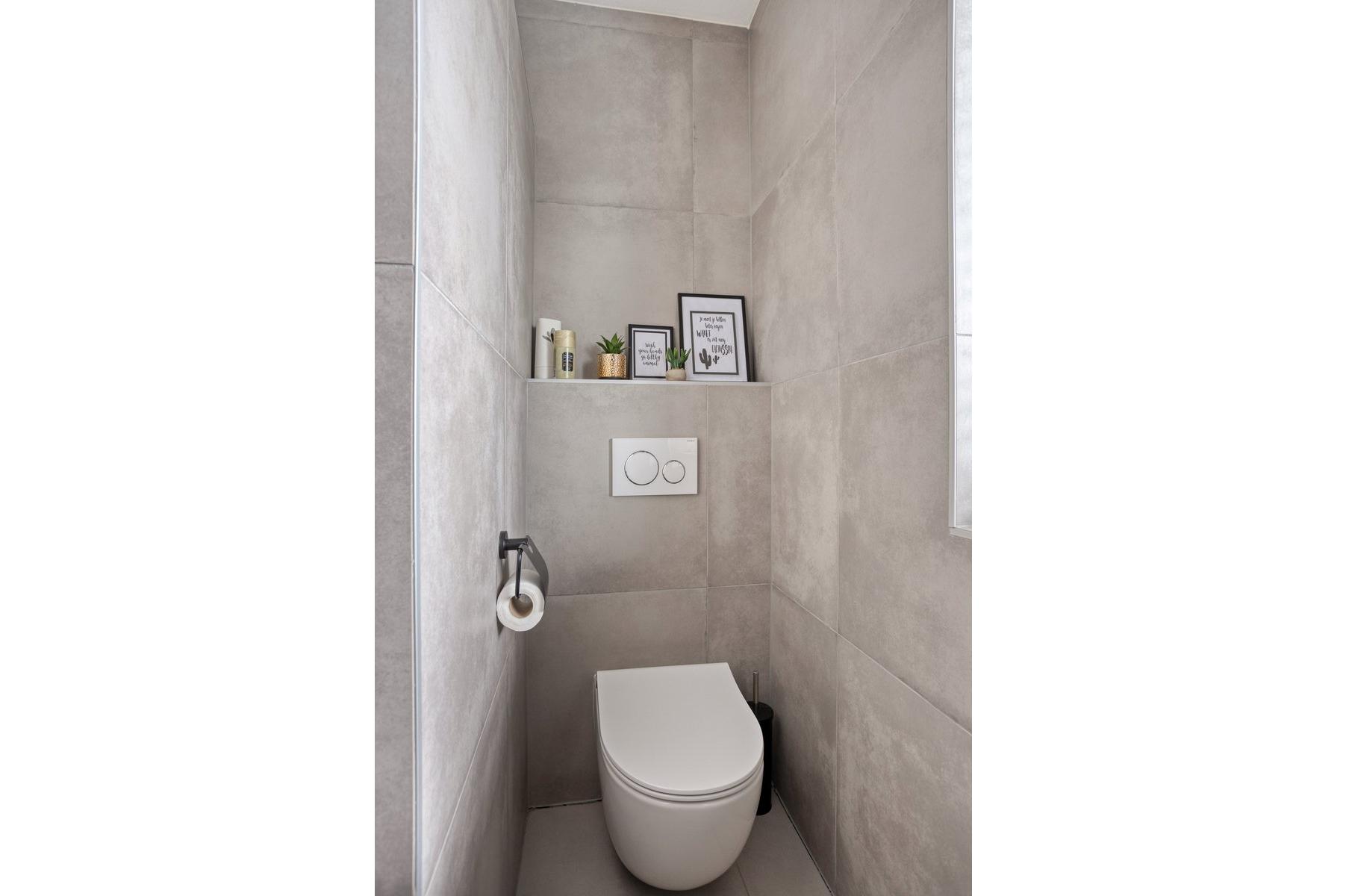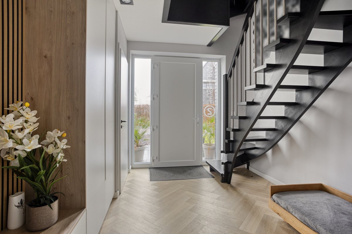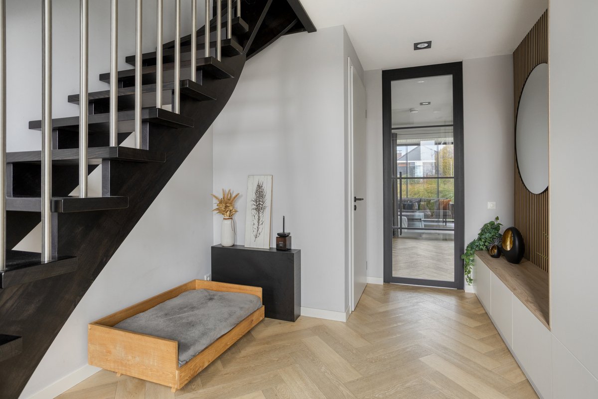 U komt binnen in de hal. Hier bevindt zich het toilet met fonteintje, de trapopgang naar de eerste verdieping en toegang tot de woonkamer en keuken.