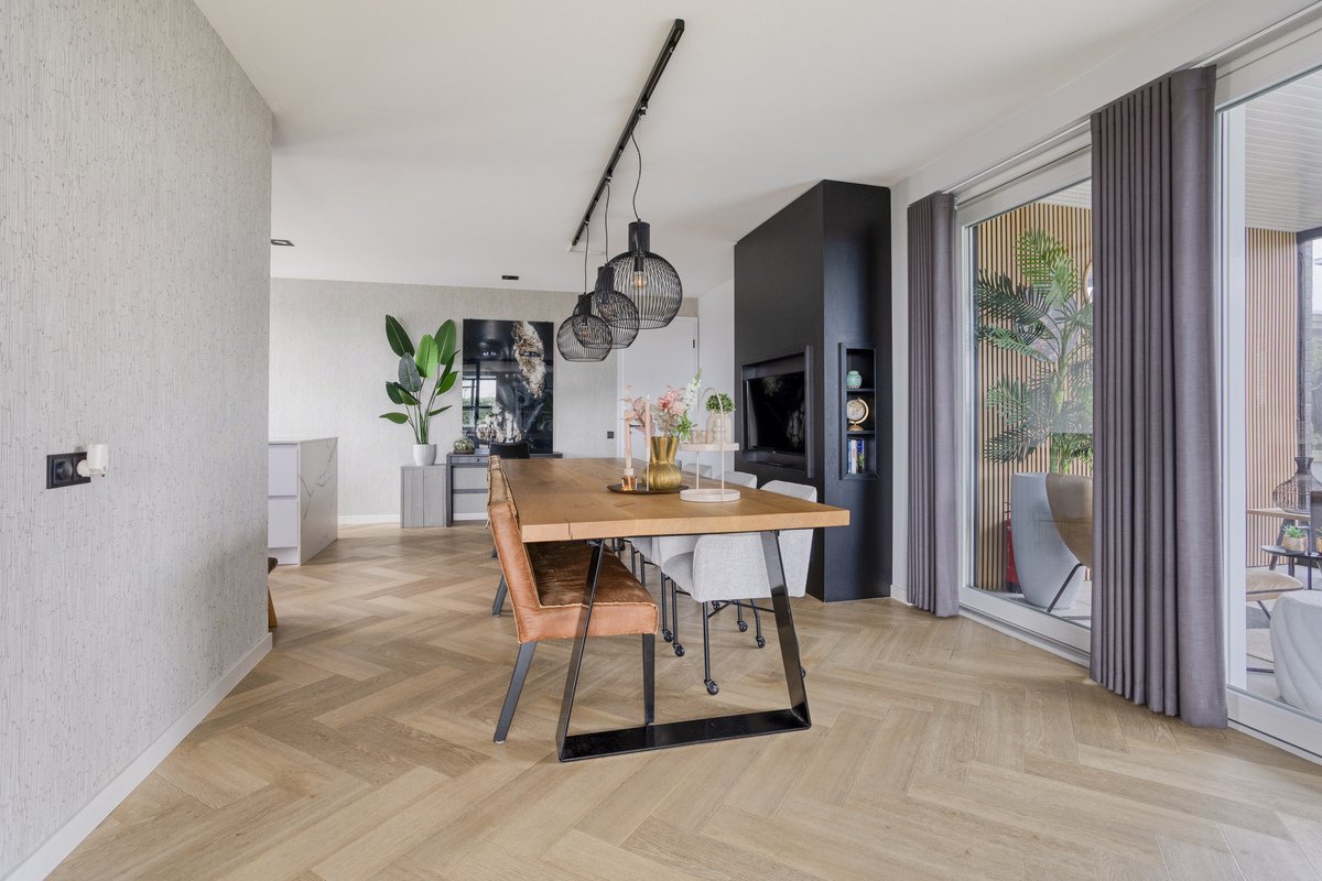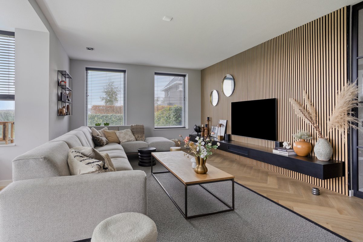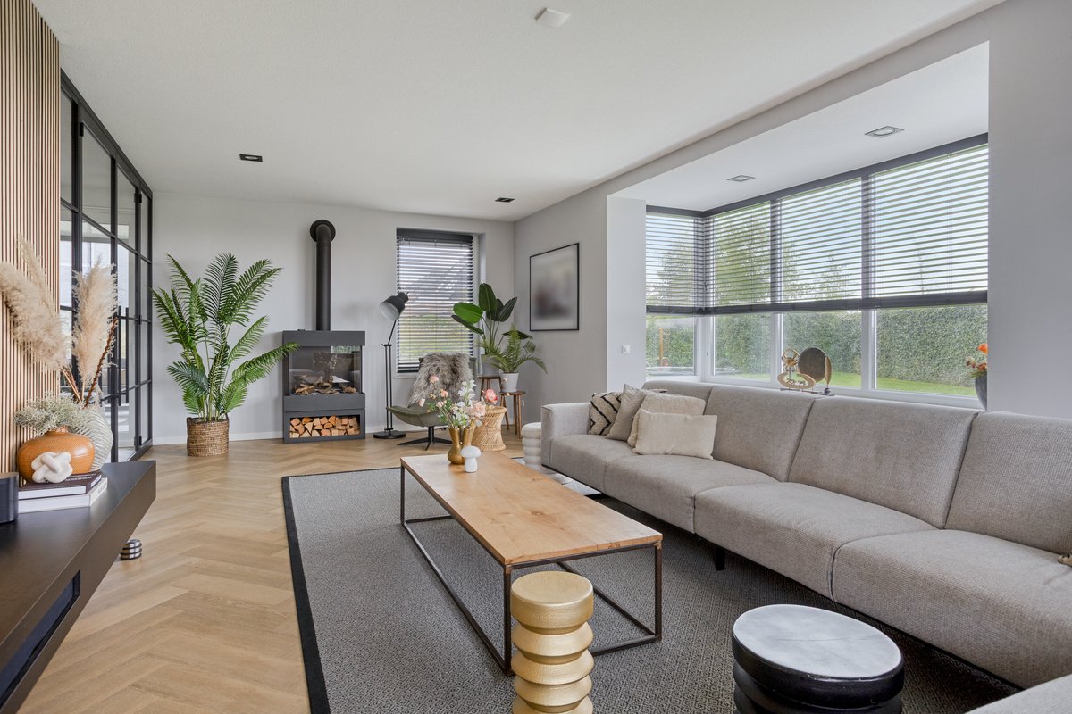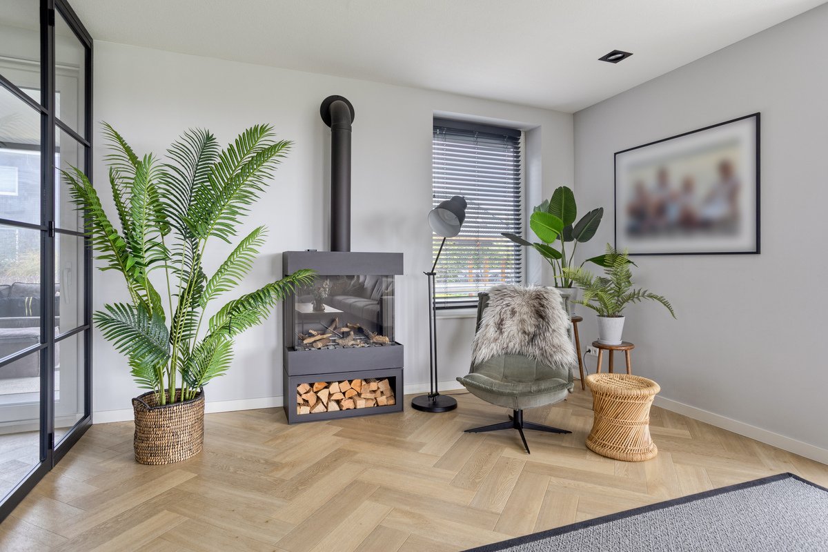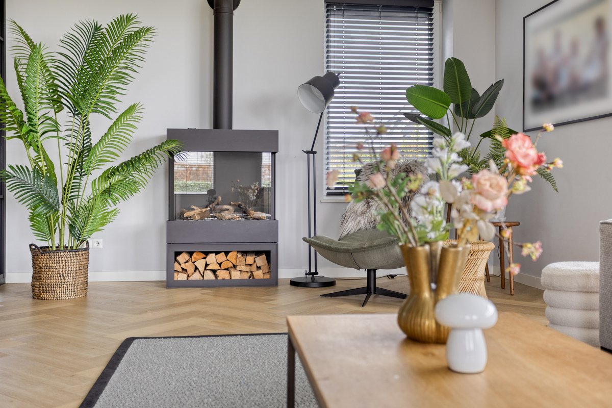 De woonkamer aan uw rechterzijde is ca. 46m² groot en -net als de rest van de begane grond- voorzien van een pvc vloer met vloerverwarming en tevens een sfeervolle gashaard. Via de schuifpui naar de in 2024 aangebouwde tuinkamer/serre, deze geeft toegang tot het terras en de tuin.