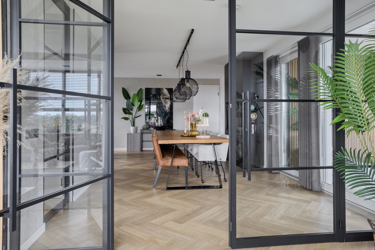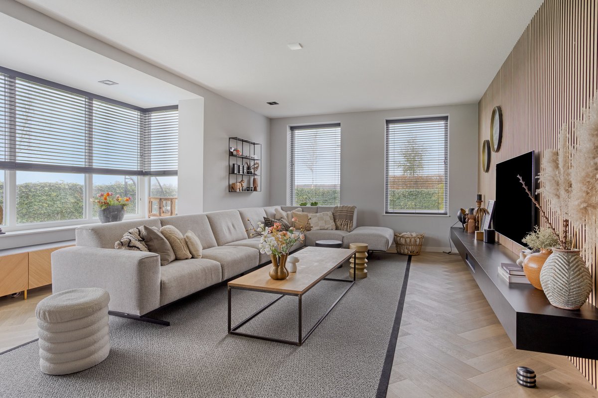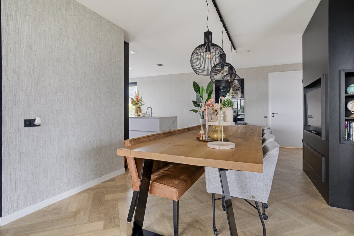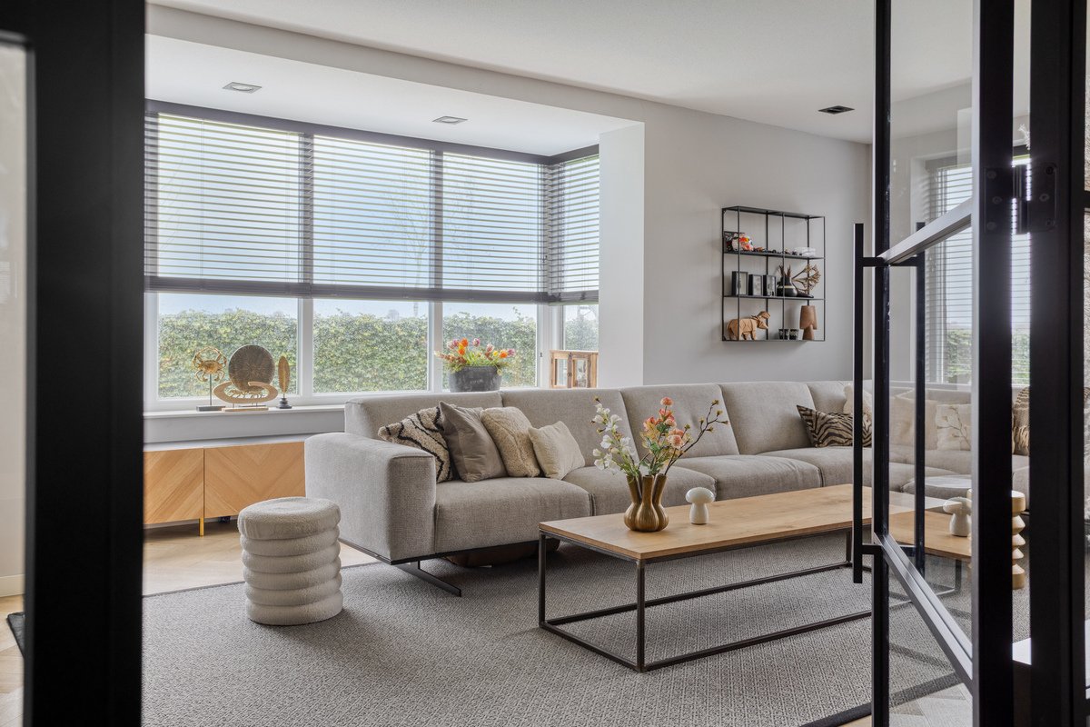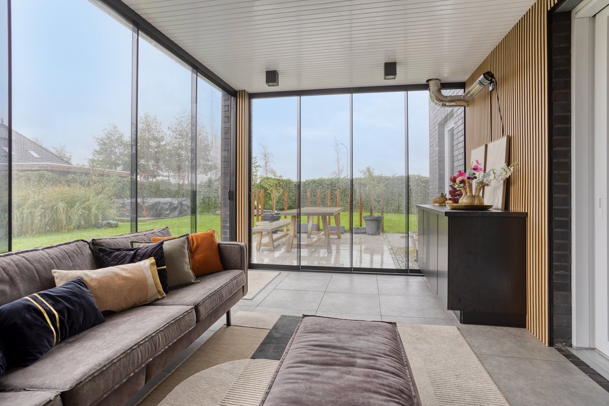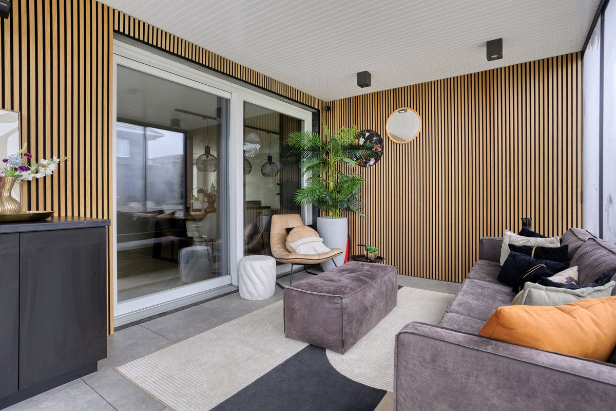 De woonkamer aan uw rechterzijde is ca. 46m² groot en -net als de rest van de begane grond- voorzien van een pvc vloer met vloerverwarming en tevens een sfeervolle gashaard. Via de schuifpui naar de in 2024 aangebouwde tuinkamer/serre, deze geeft toegang tot het terras en de tuin.