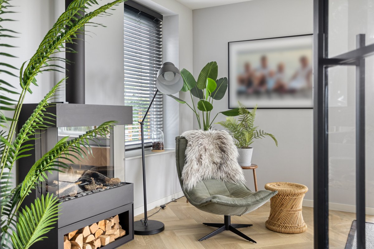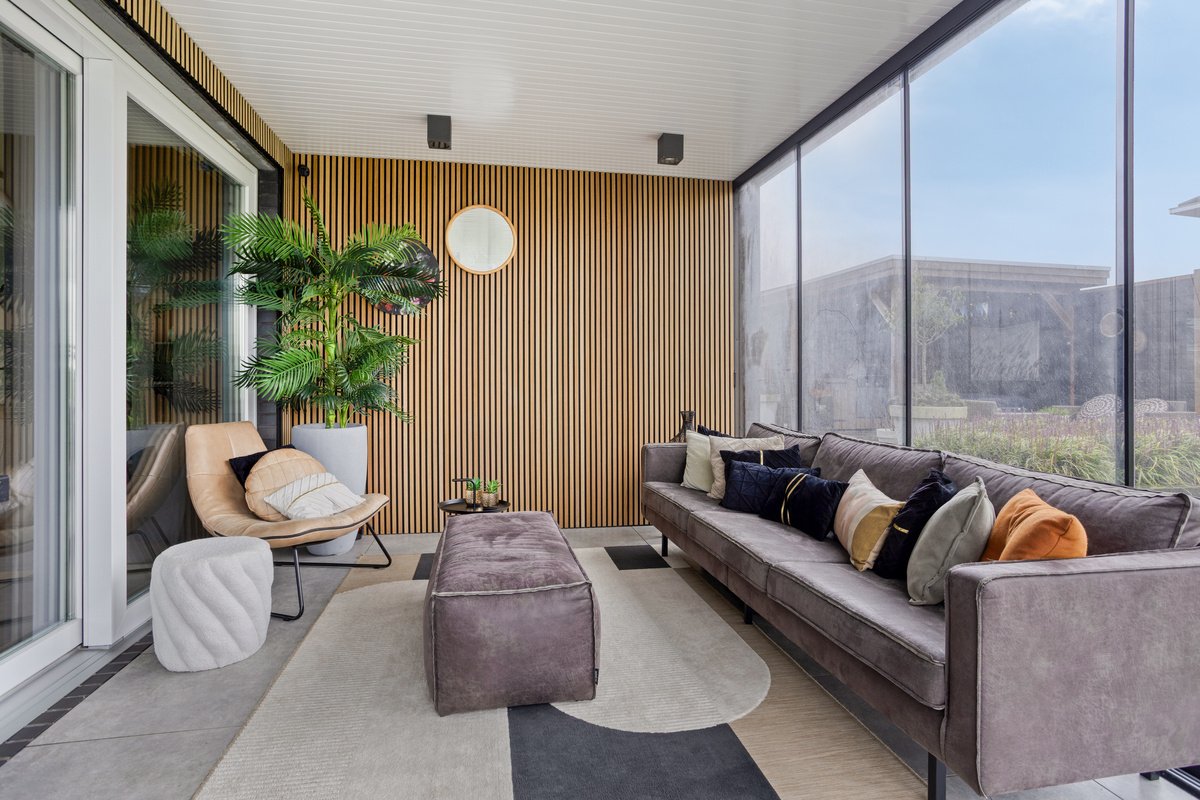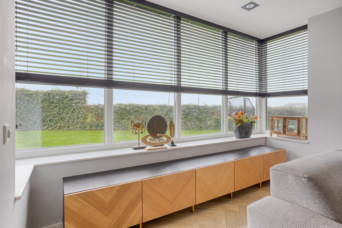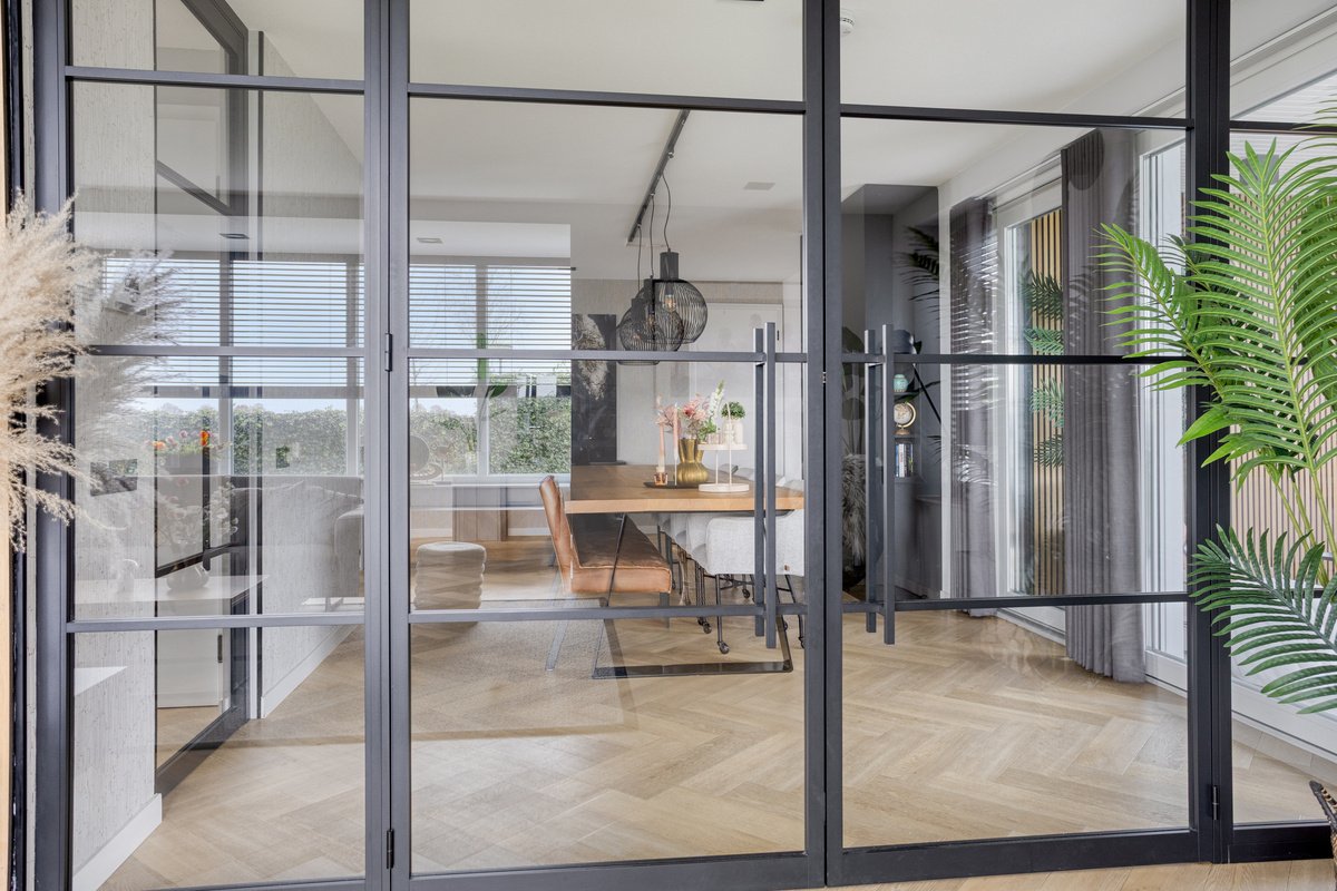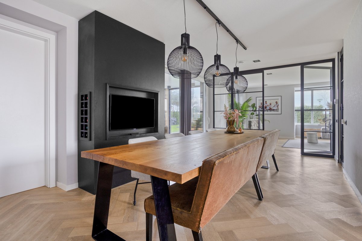 De woonkamer aan uw rechterzijde is ca. 46m² groot en -net als de rest van de begane grond- voorzien van een pvc vloer met vloerverwarming en tevens een sfeervolle gashaard. Via de schuifpui naar de in 2024 aangebouwde tuinkamer/serre, deze geeft toegang tot het terras en de tuin.