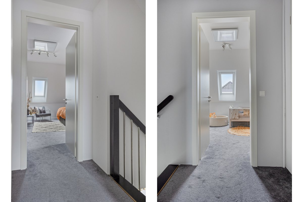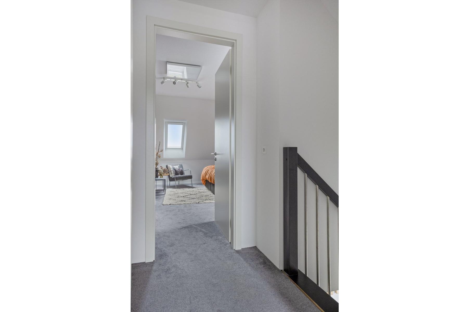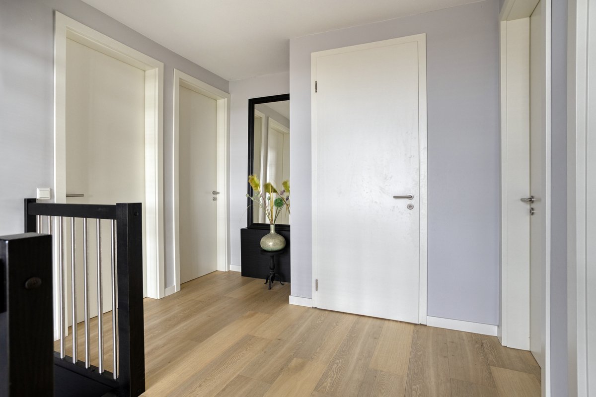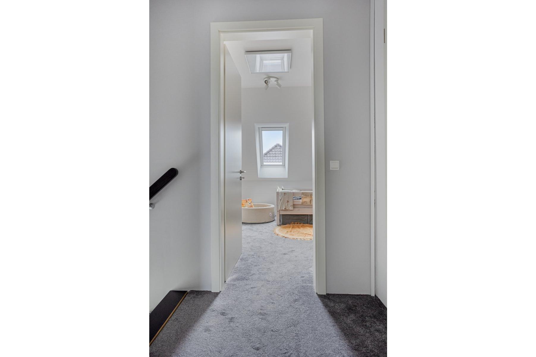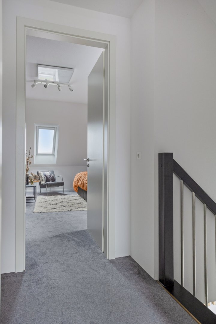 Via de trap bereikt naar de tweede verdieping. Hier bevindt zich een overloop met berging en drie slaapkamers. De grote slaapkamer aan de rechterzijde beschikt over een walk-in closet, verder is er voldoende bergruimte achter de knieschotten.