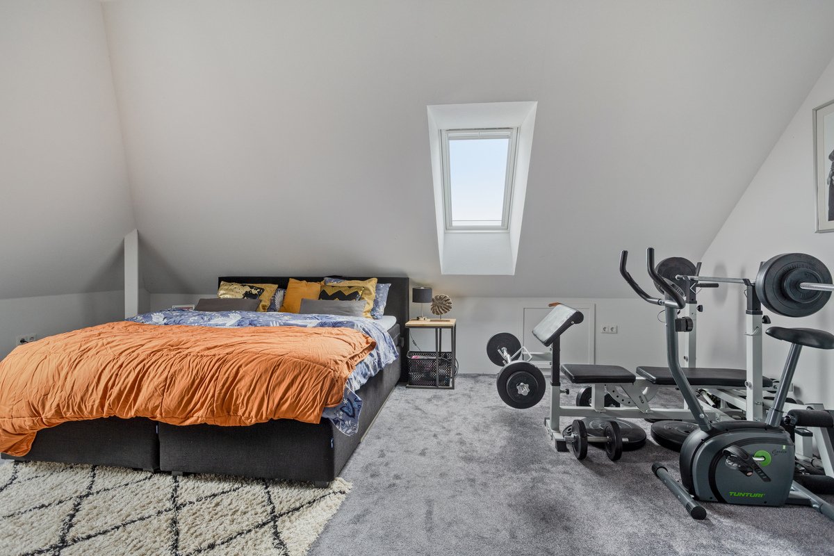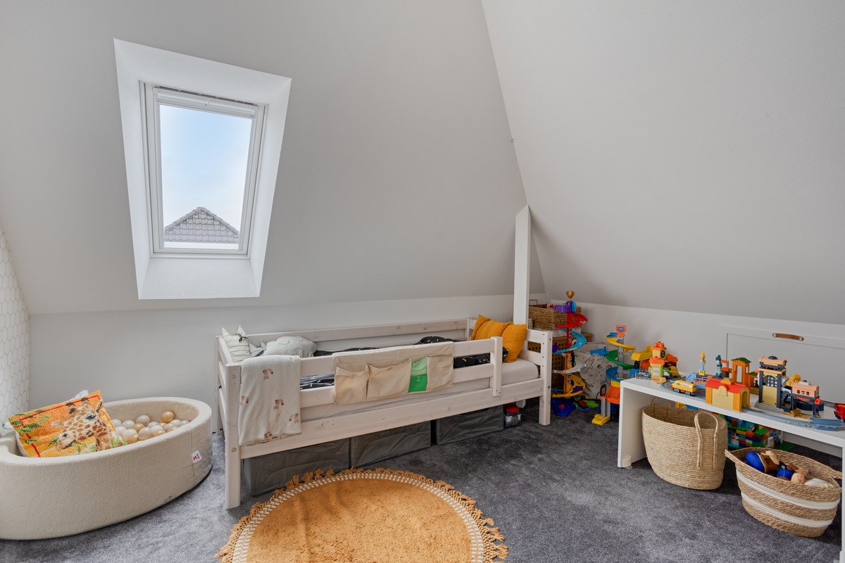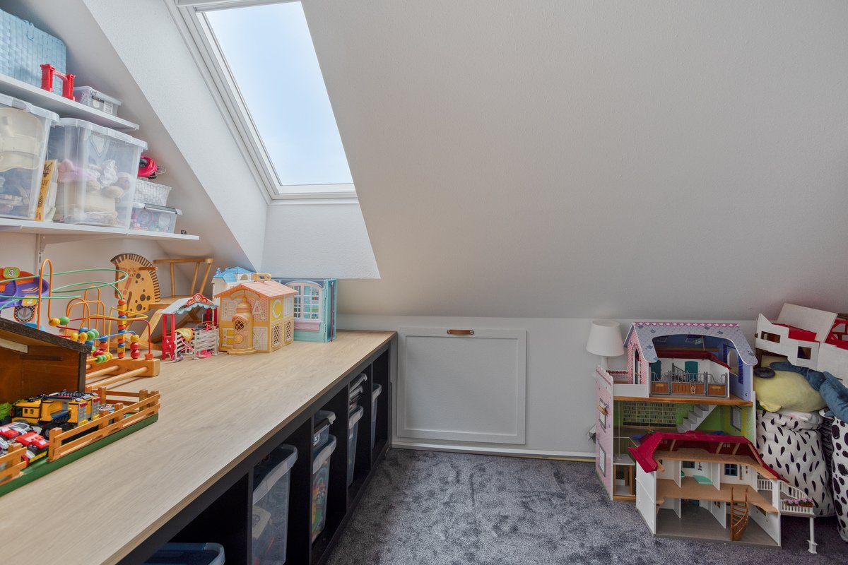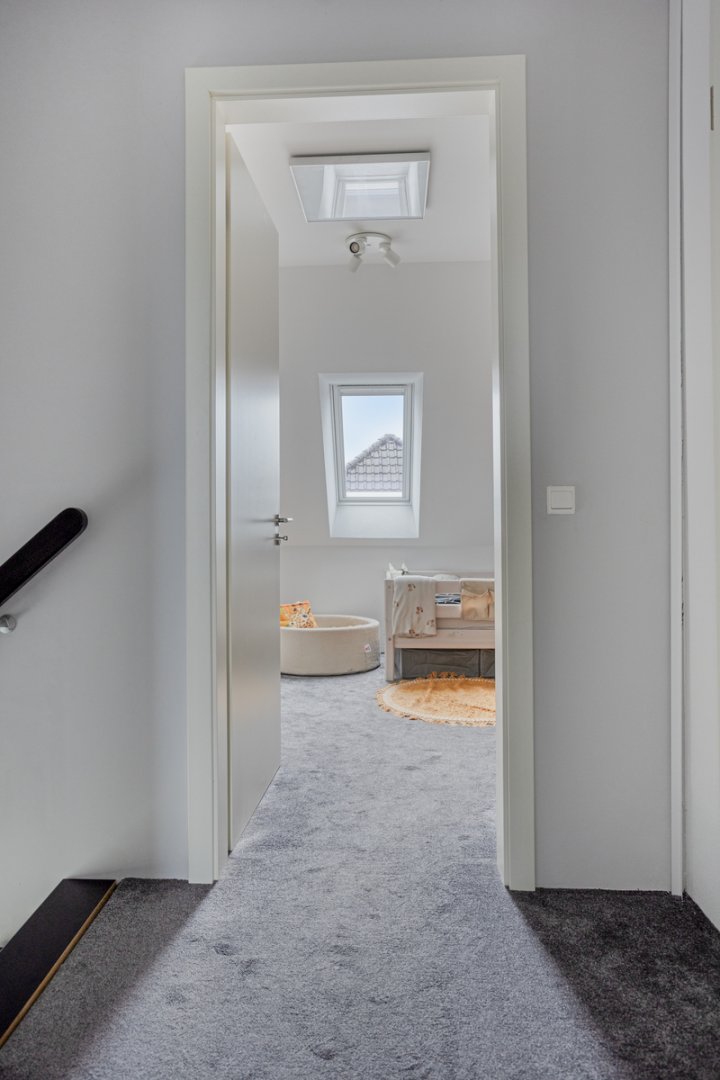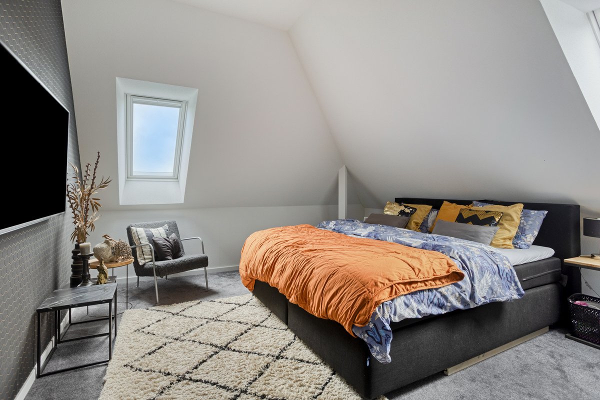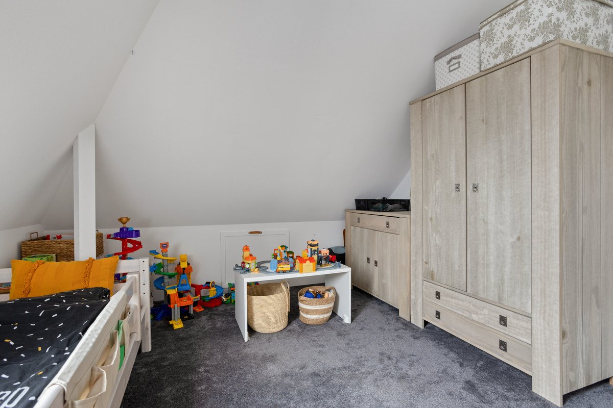 Via de trap bereikt naar de tweede verdieping. Hier bevindt zich een overloop met berging en drie slaapkamers. De grote slaapkamer aan de rechterzijde beschikt over een walk-in closet, verder is er voldoende bergruimte achter de knieschotten.