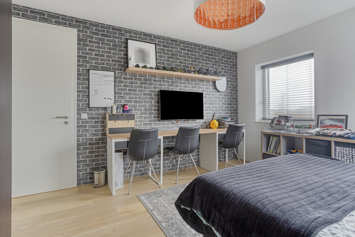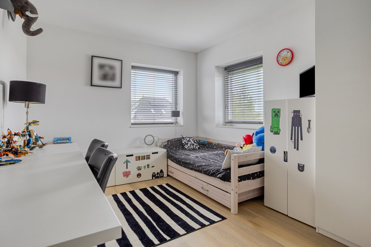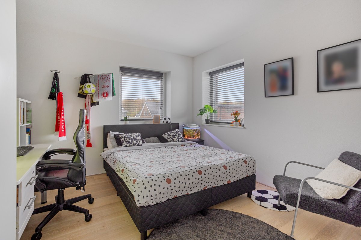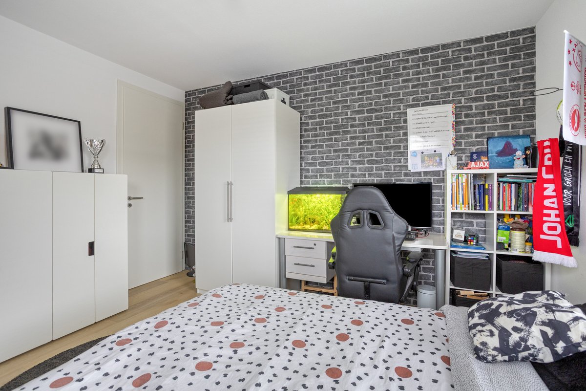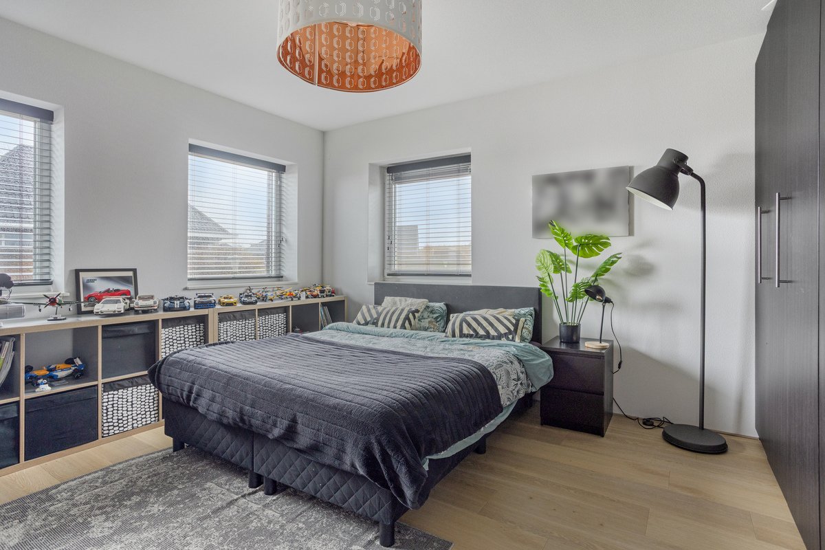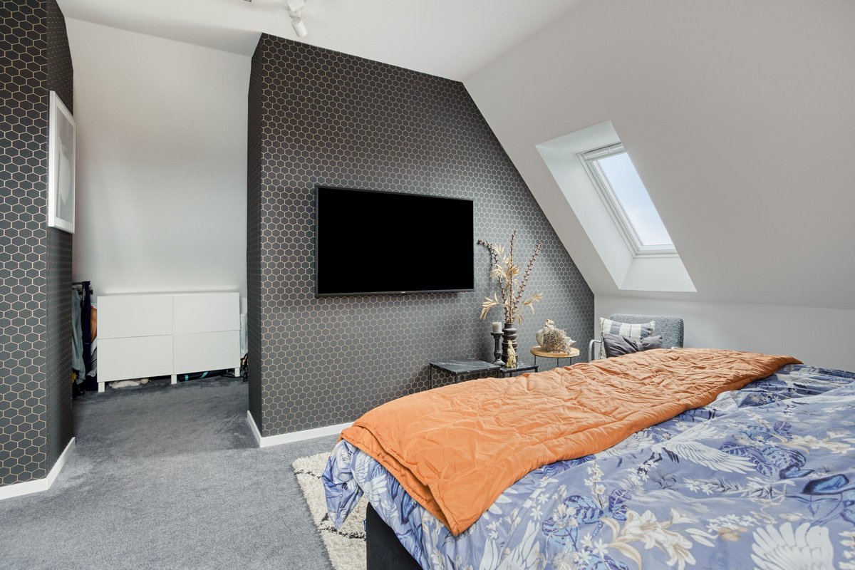 Via de trap bereikt naar de tweede verdieping. Hier bevindt zich een overloop met berging en drie slaapkamers. De grote slaapkamer aan de rechterzijde beschikt over een walk-in closet, verder is er voldoende bergruimte achter de knieschotten.