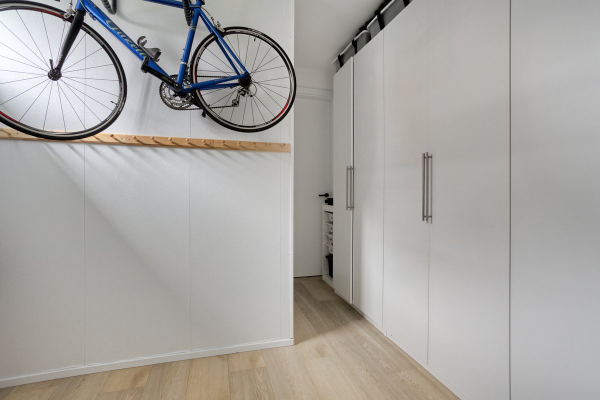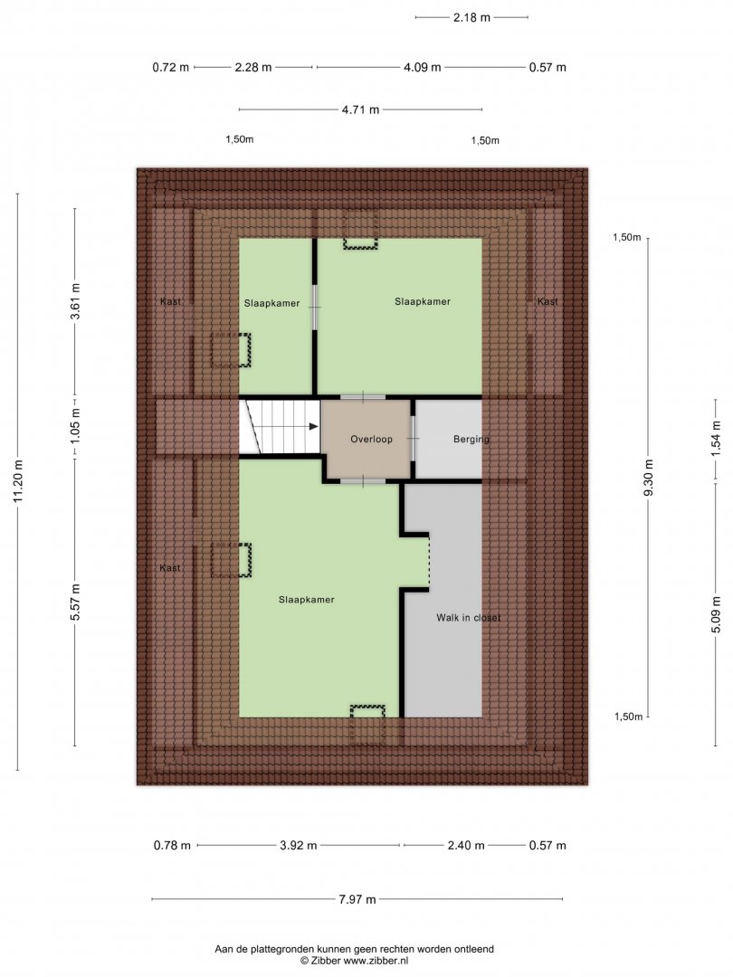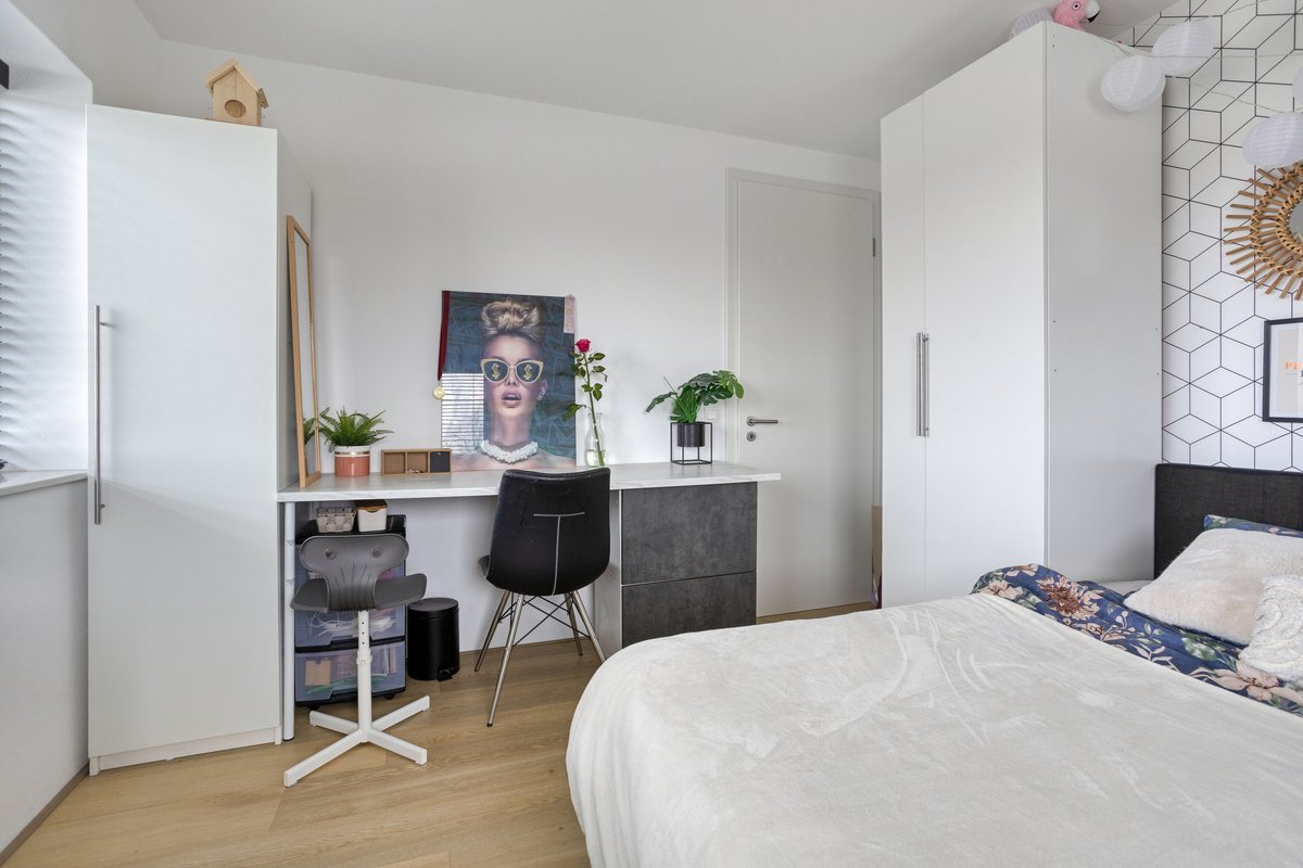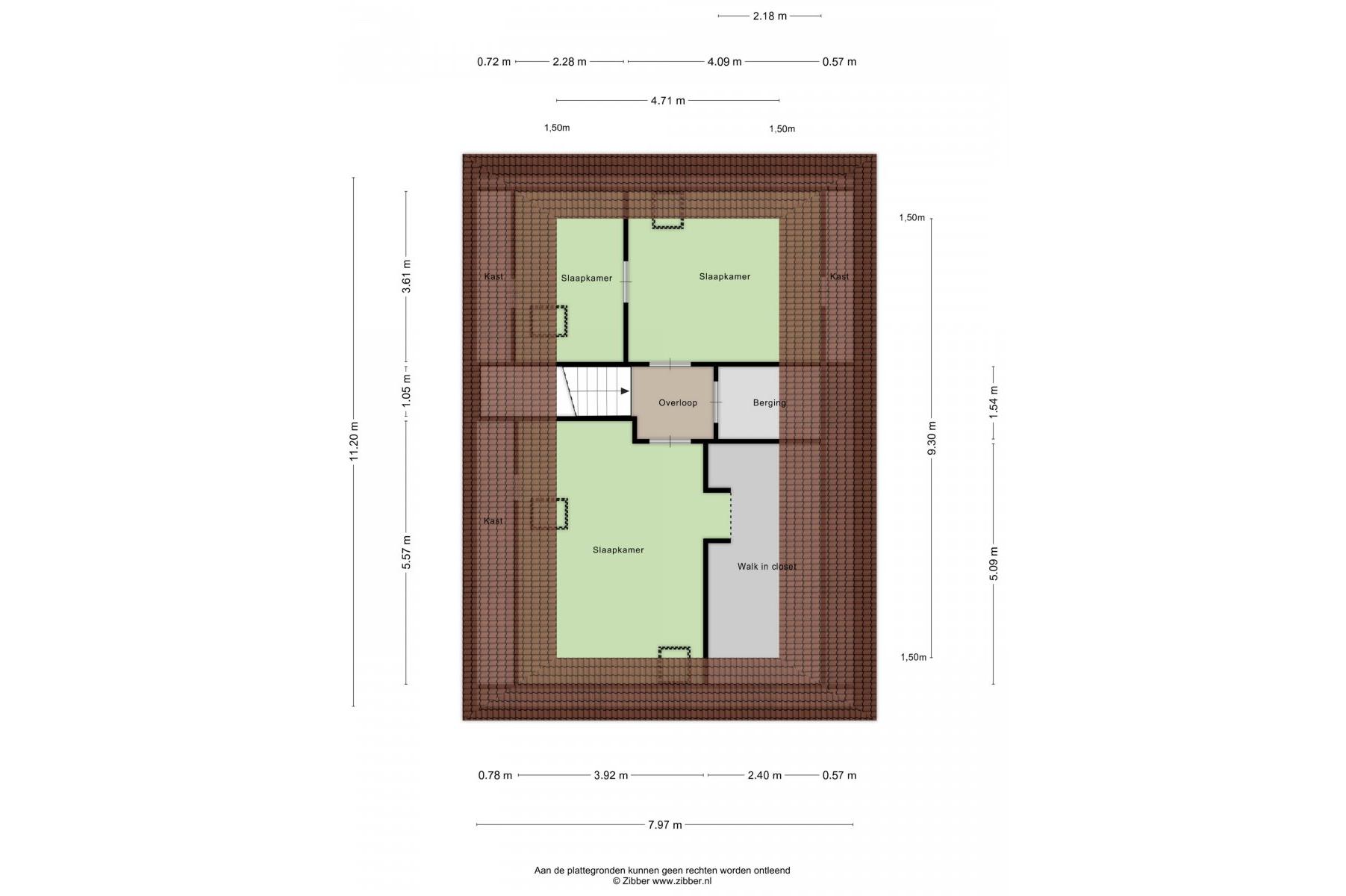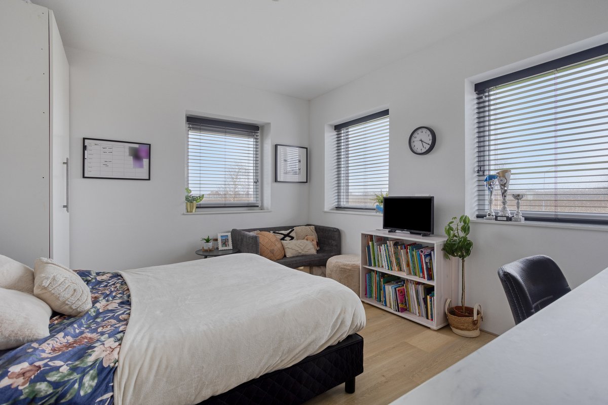 Via de trap bereikt naar de tweede verdieping. Hier bevindt zich een overloop met berging en drie slaapkamers. De grote slaapkamer aan de rechterzijde beschikt over een walk-in closet, verder is er voldoende bergruimte achter de knieschotten.