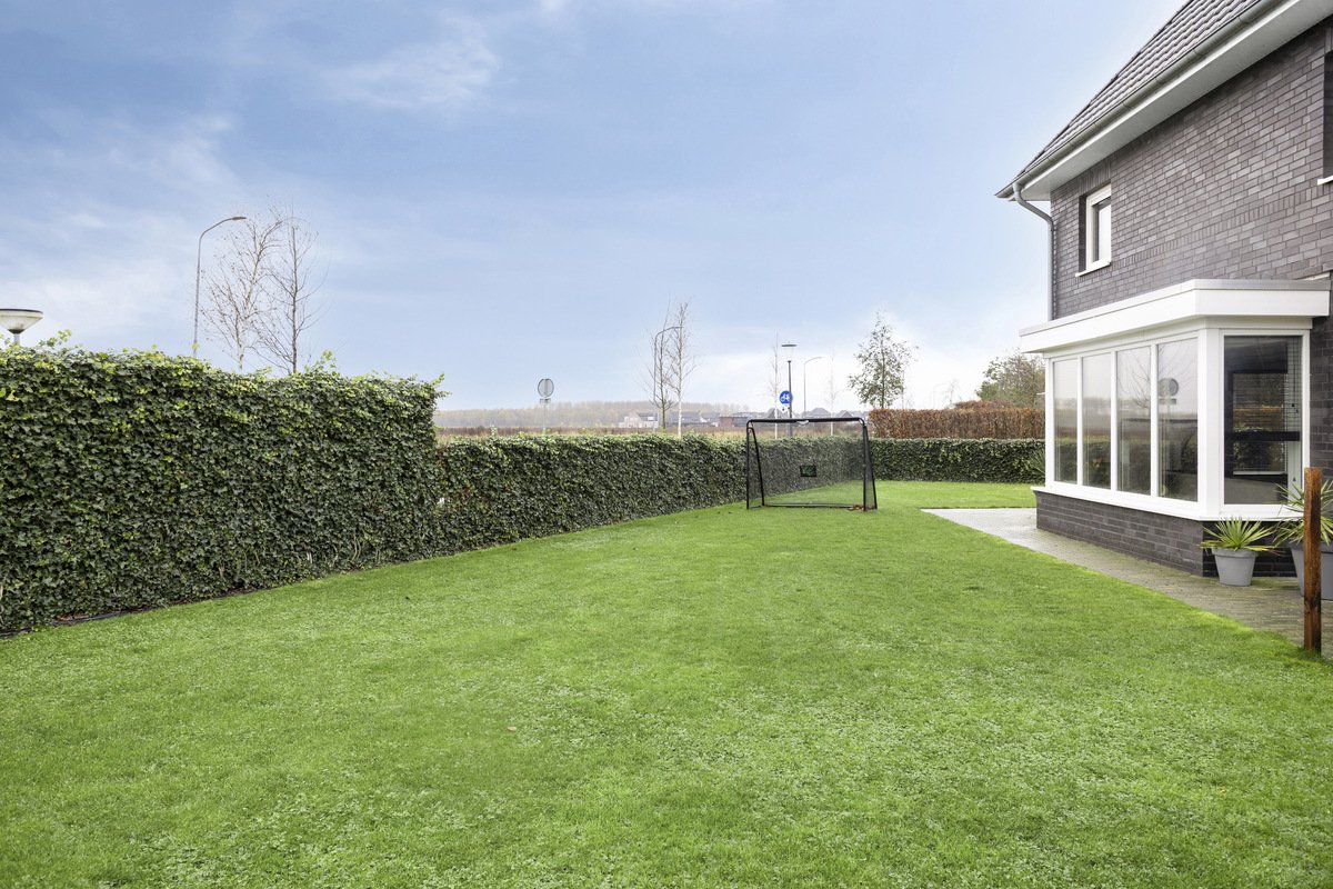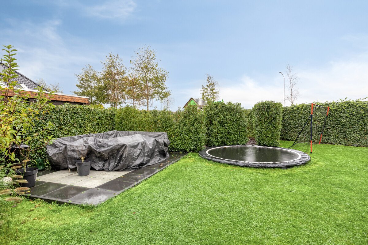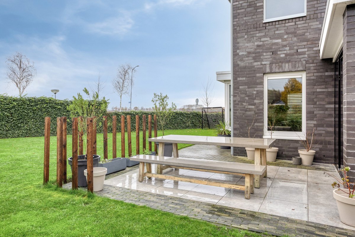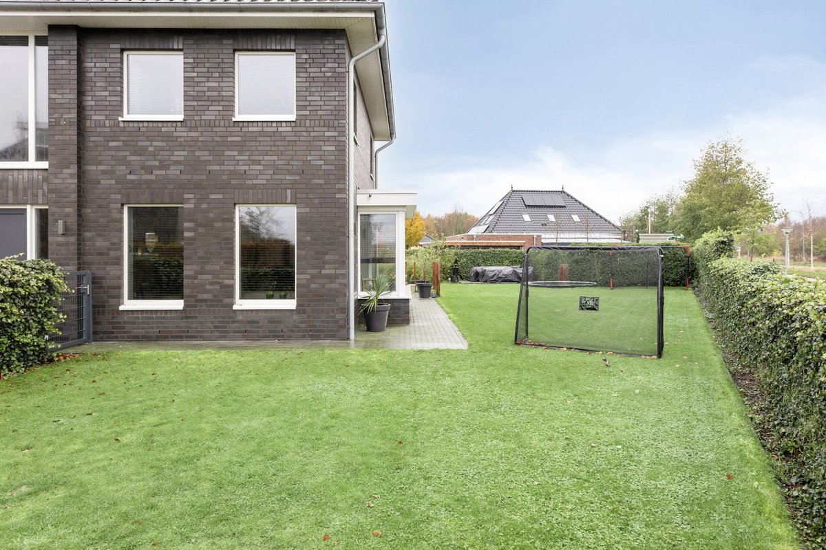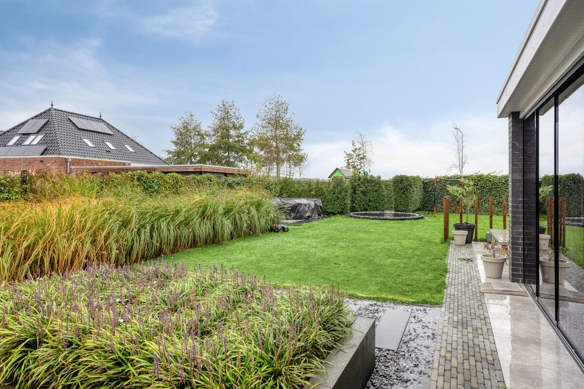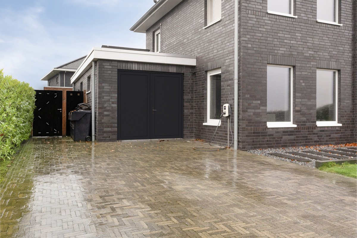 Rondom de woning is een fraai gazon met perken gelegen. Er is een brede oprit met ruimte voor meerdere auto's en ook is er een laadpaal aanwezig.