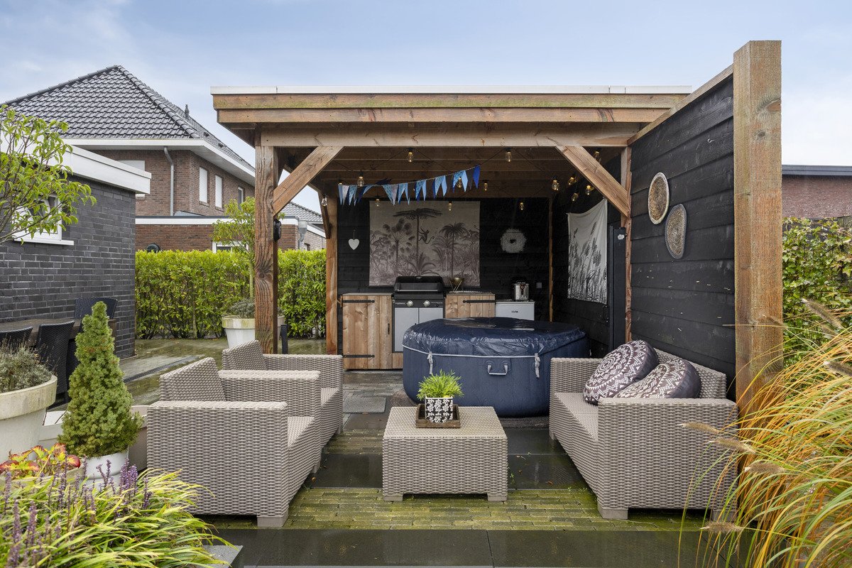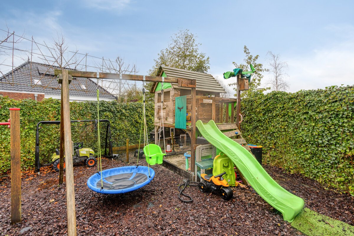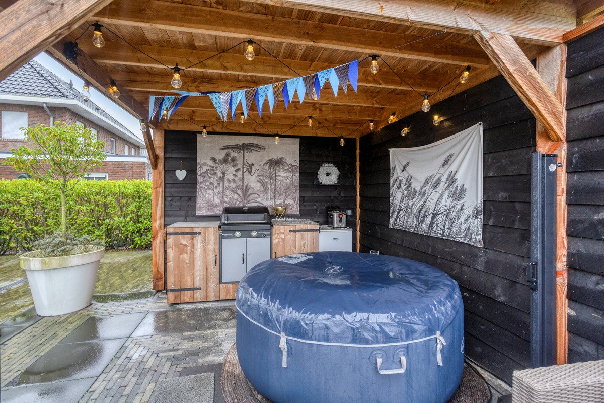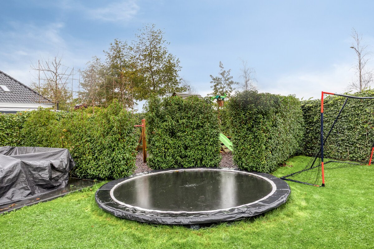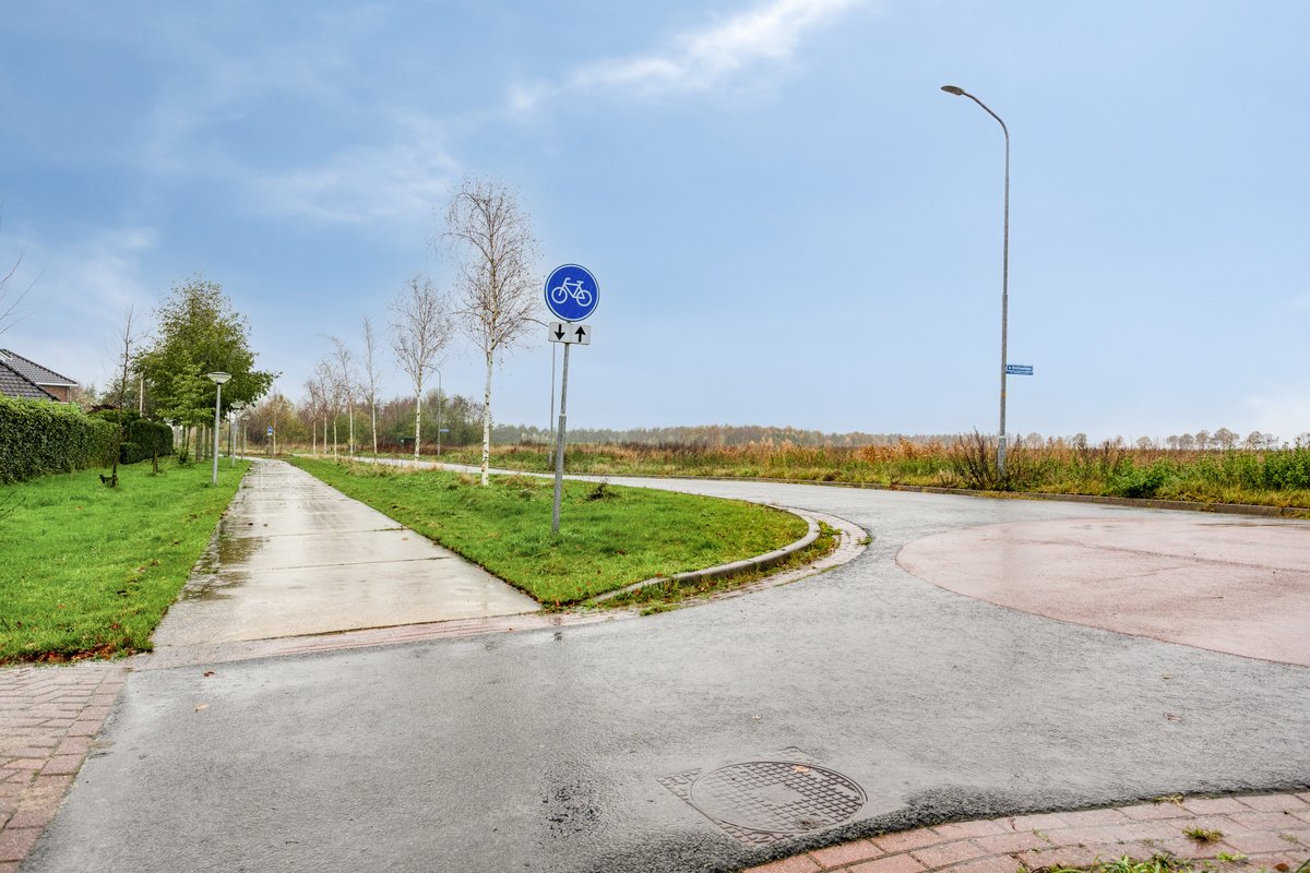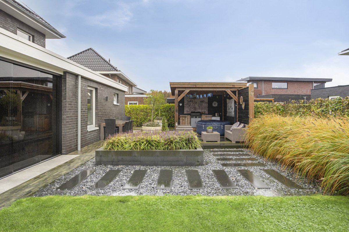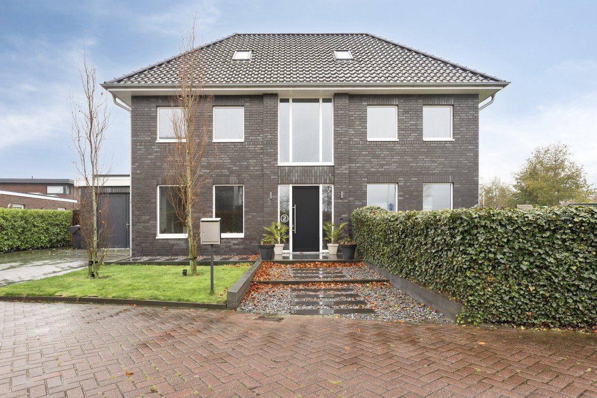 Rondom de woning is een fraai gazon met perken gelegen. Er is een brede oprit met ruimte voor meerdere auto's en ook is er een laadpaal aanwezig.