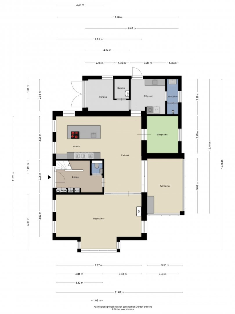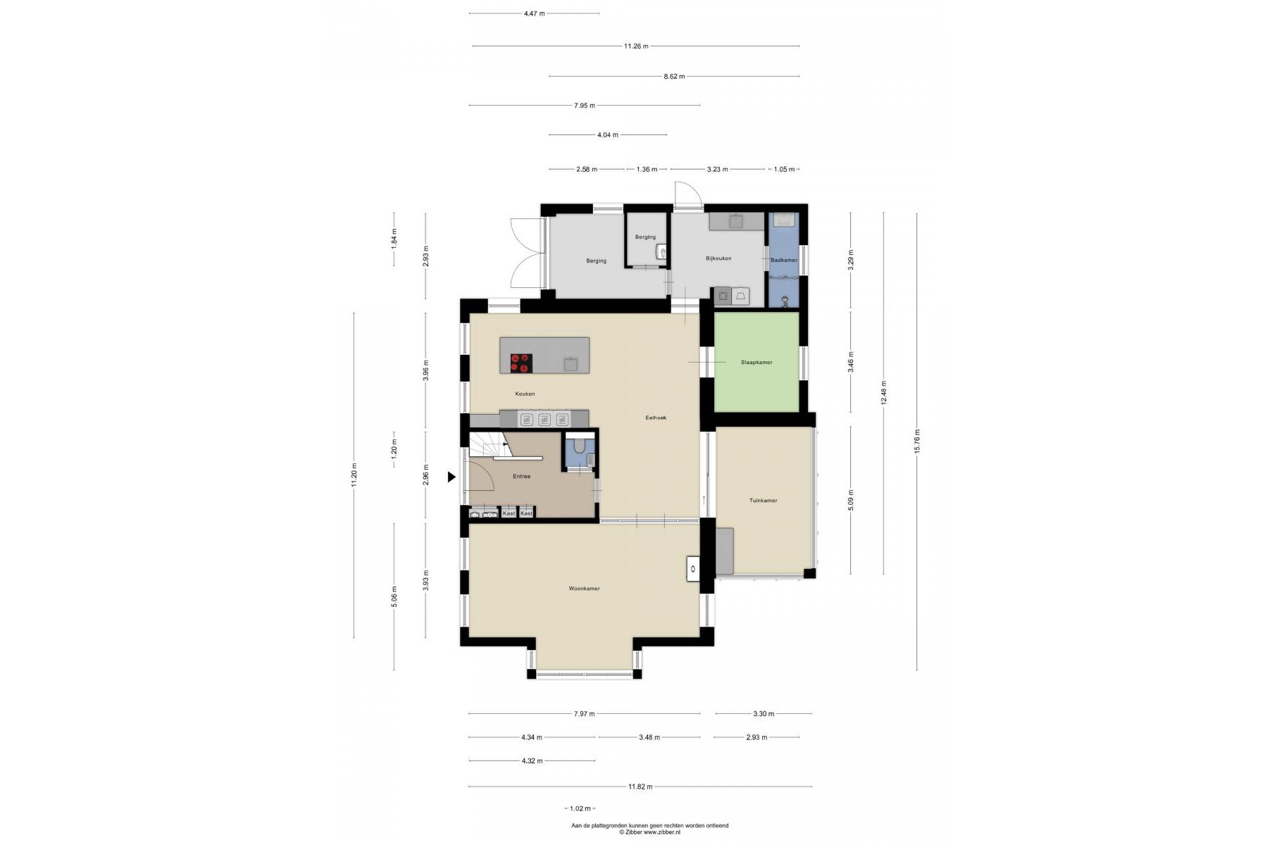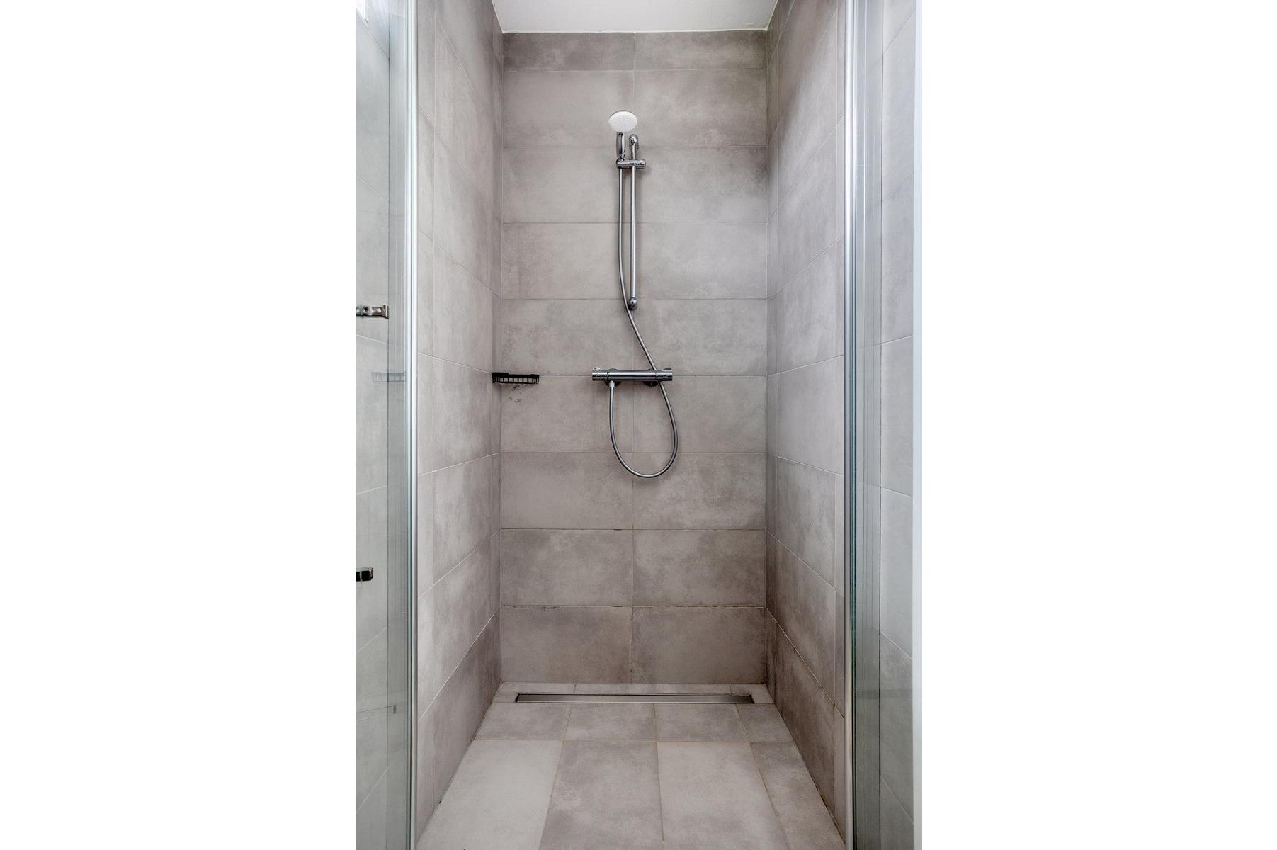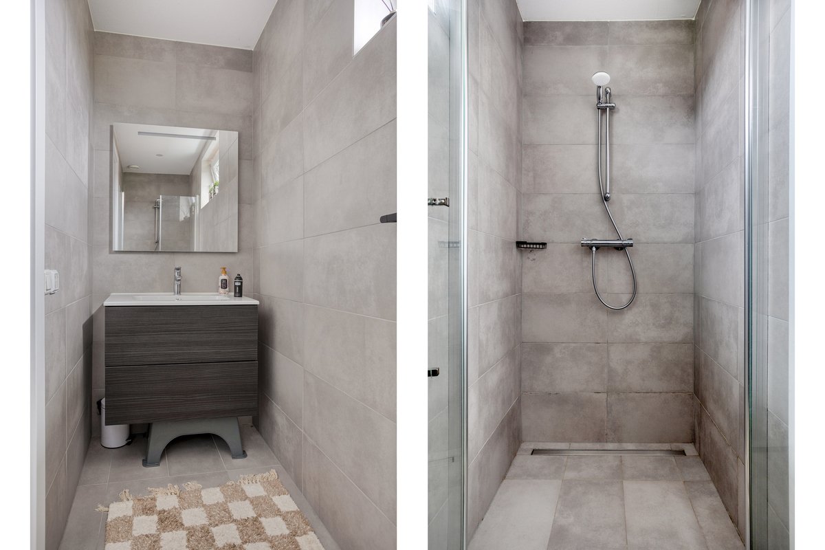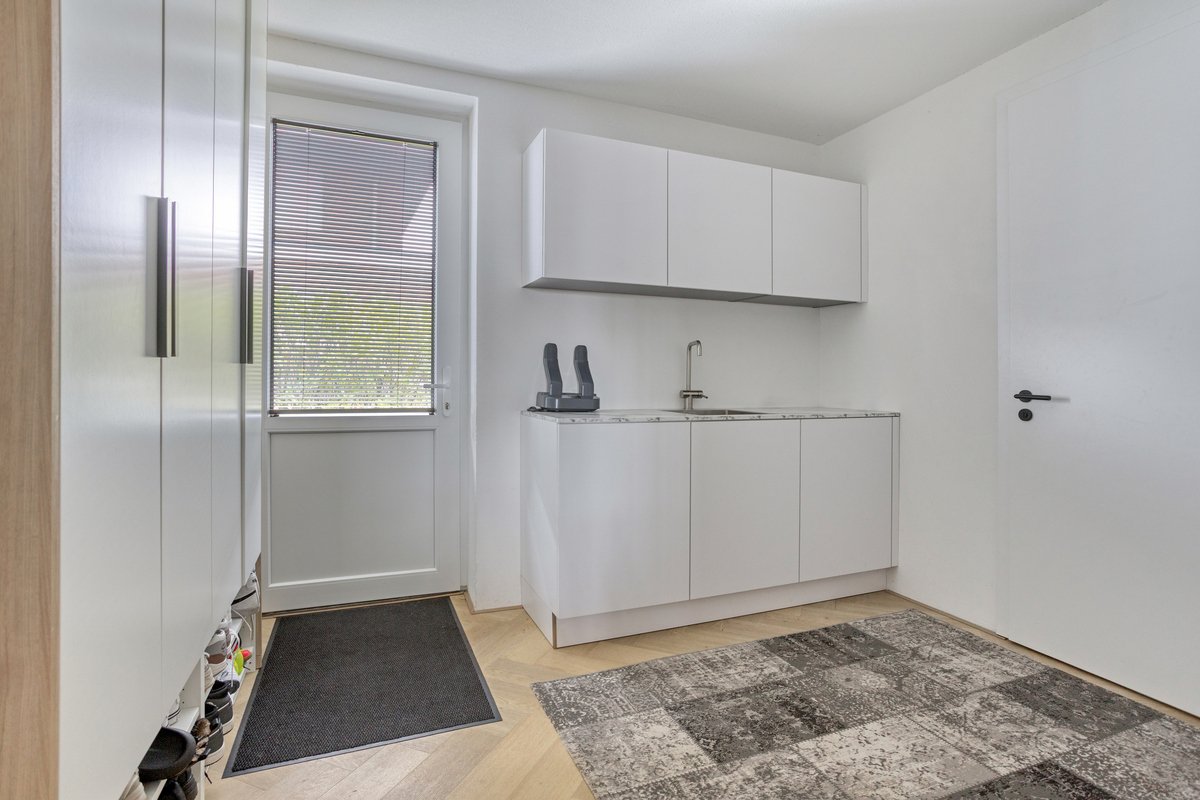 Vanuit de keuken heeft u toegang tot slaap/speelkamer en de bijkeuken, de bijkeuken is voorzien van een keukenblok, aangrenzend een badkamer met douche en wastafelmeubel, binnendoor is de garage/berging te bereiken.