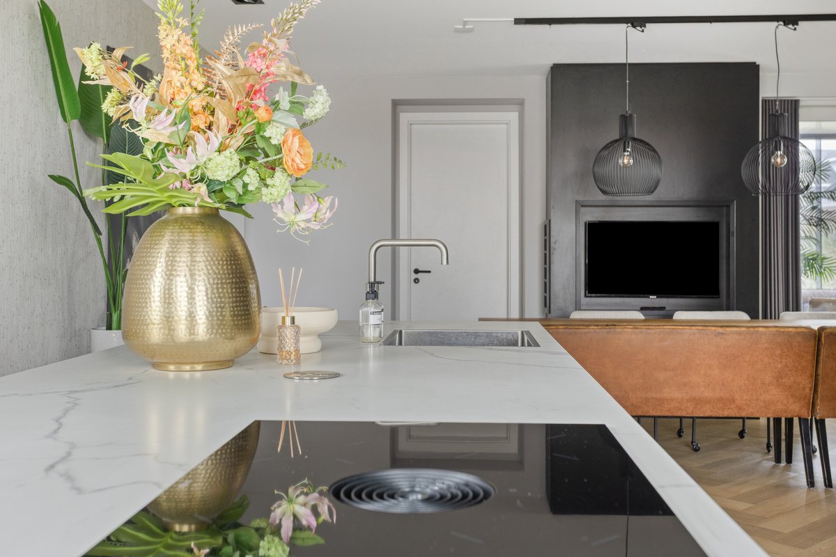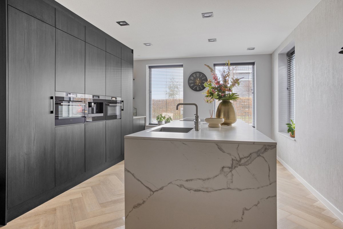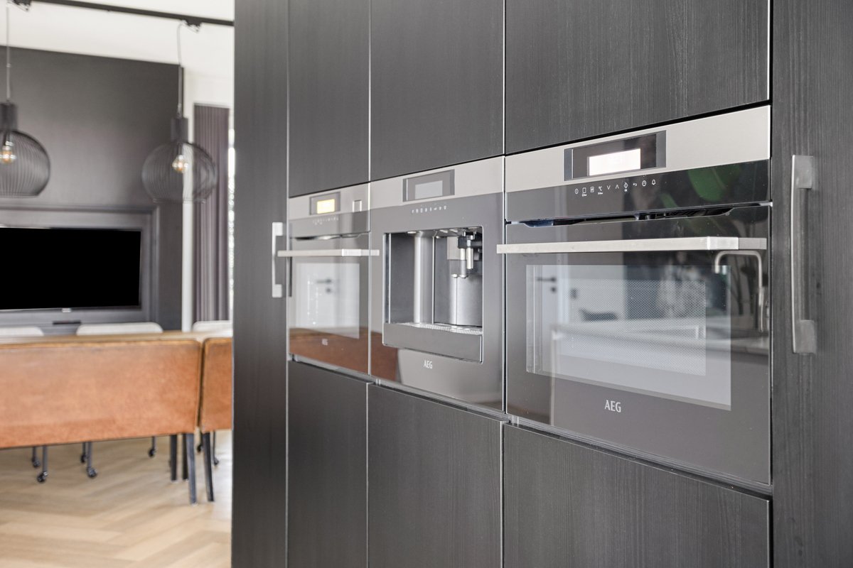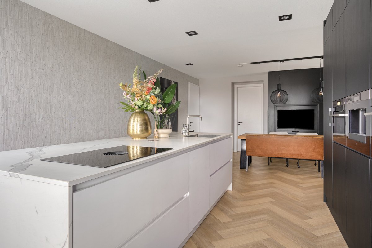 De moderne open woonkeuken ca.31m² is uitgerust met een kook-/spoeleiland, inductie kookplaat met afzuiging, Quooker, stoomoven, combi-oven, grote koelkast, grote vriezer, vaatwasser en geïntegreerde koffiemachine.