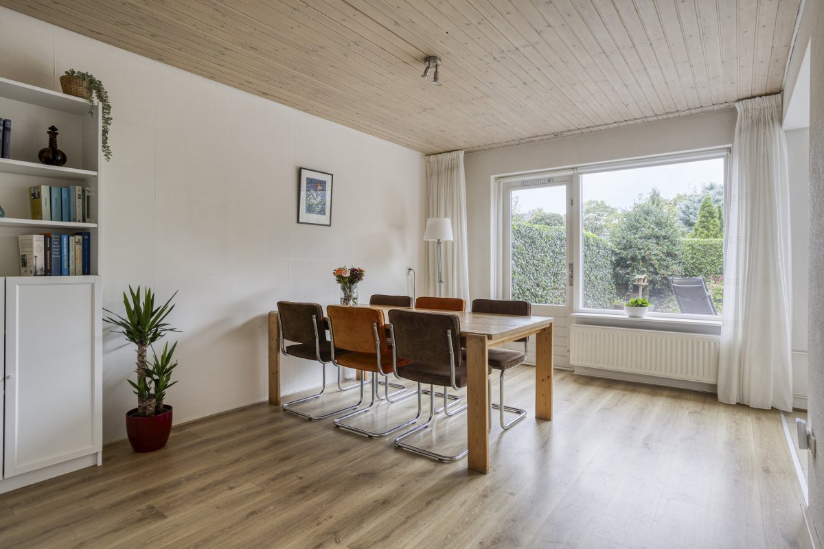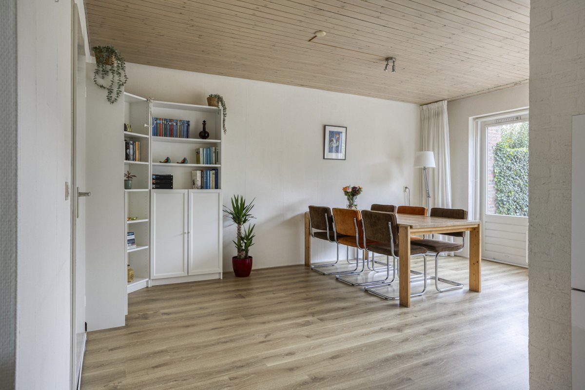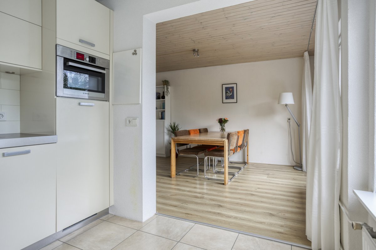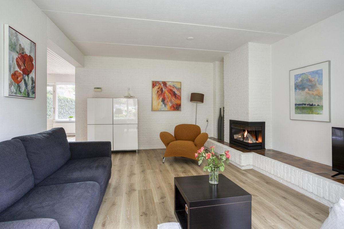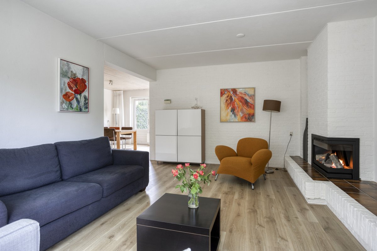 Begane grond: entree/hal (laminaat), toilet met fontein, sfeervolle Z-vormige living ca.39m² met fraaie laminaatvloer, gashaard en deur naar het terras, nette open keuken ca.6m² (plv) hoekkeuken voorzien van 4 pits gaskookplaat, rvs afzuigkap, koelkast, combi oven en vaatwasser en bijkeuken (plv) ca.2.85x1.55m.