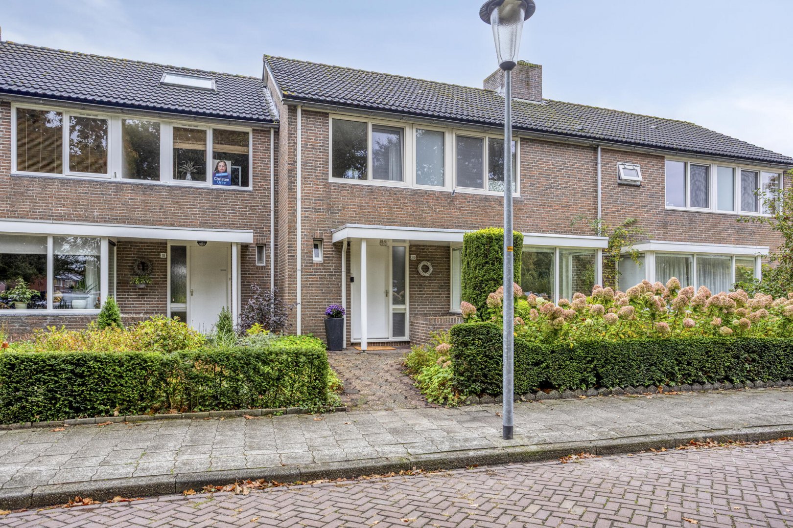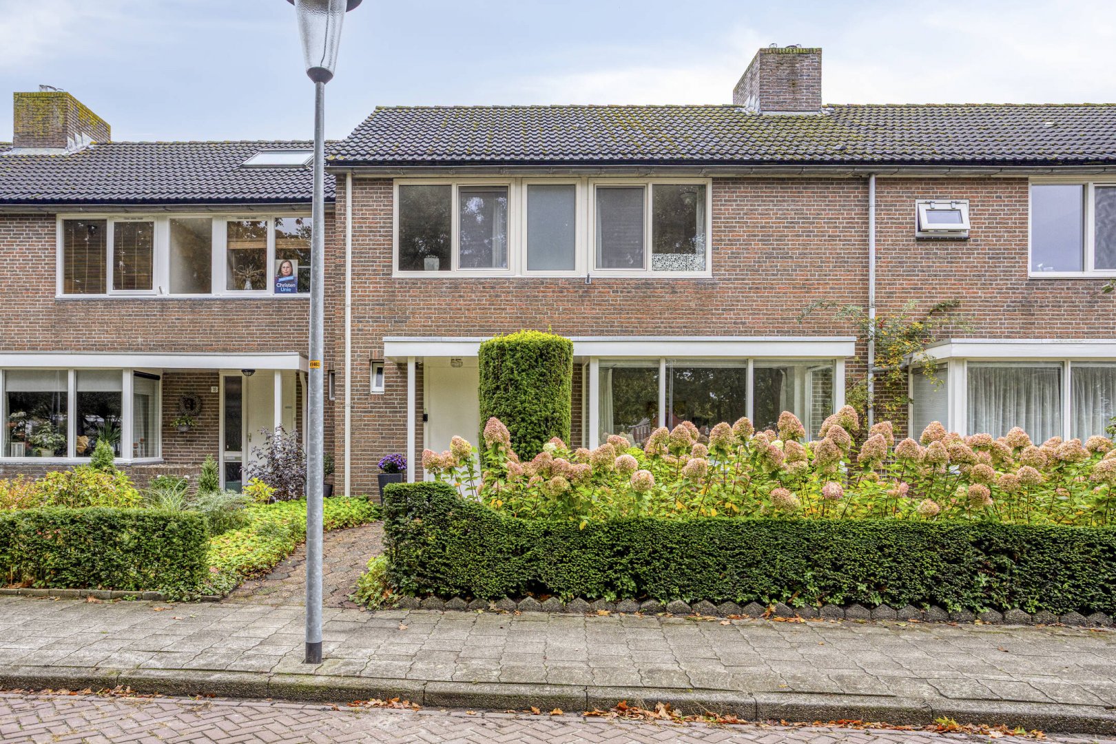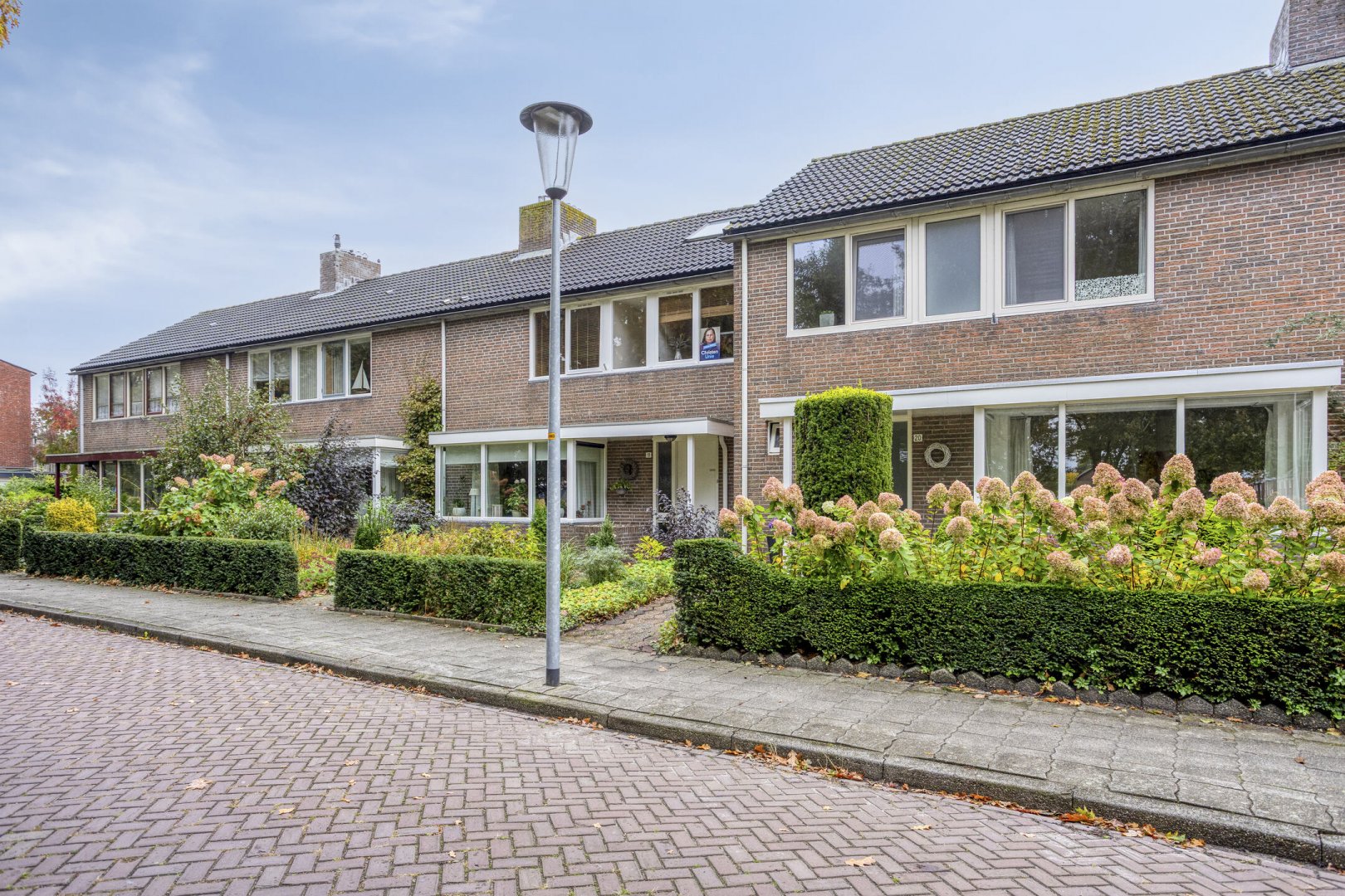 Op werkelijk prachtige plek aan groene brink en nabij scholen en wijkwinkelcentrum gelegen royale, prima onderhouden, geschakelde tussenwoning met garage en verzorgde besloten tuin op het zuiden.