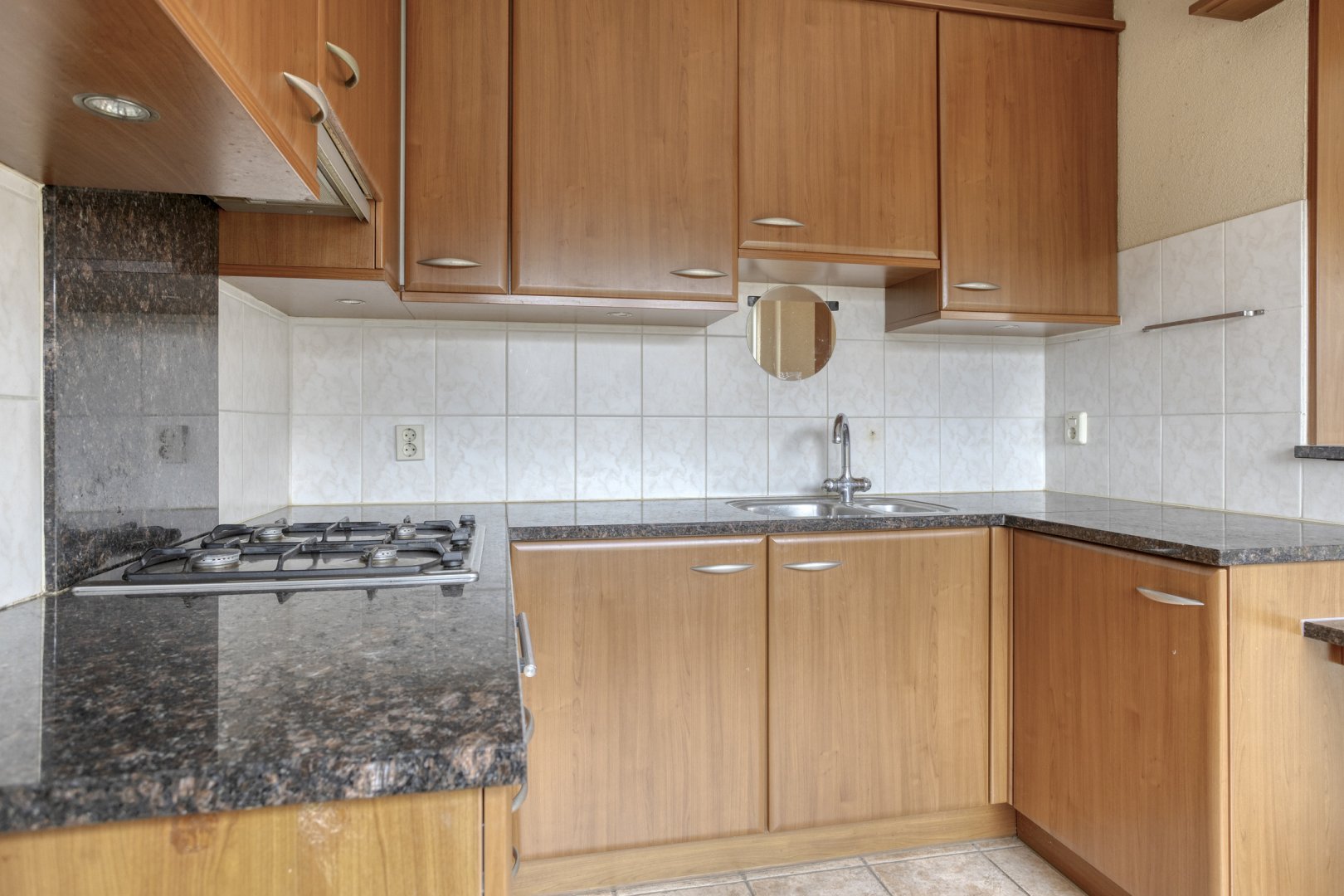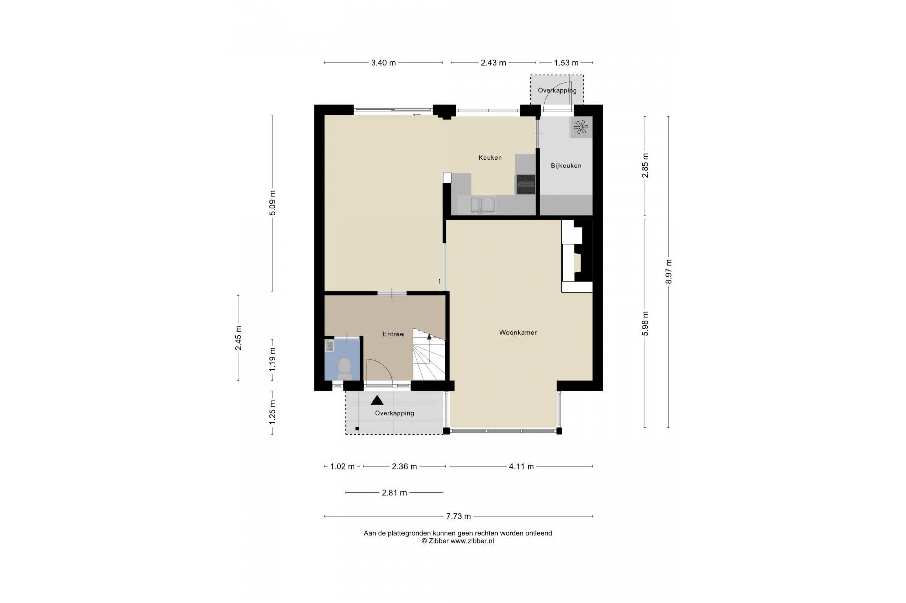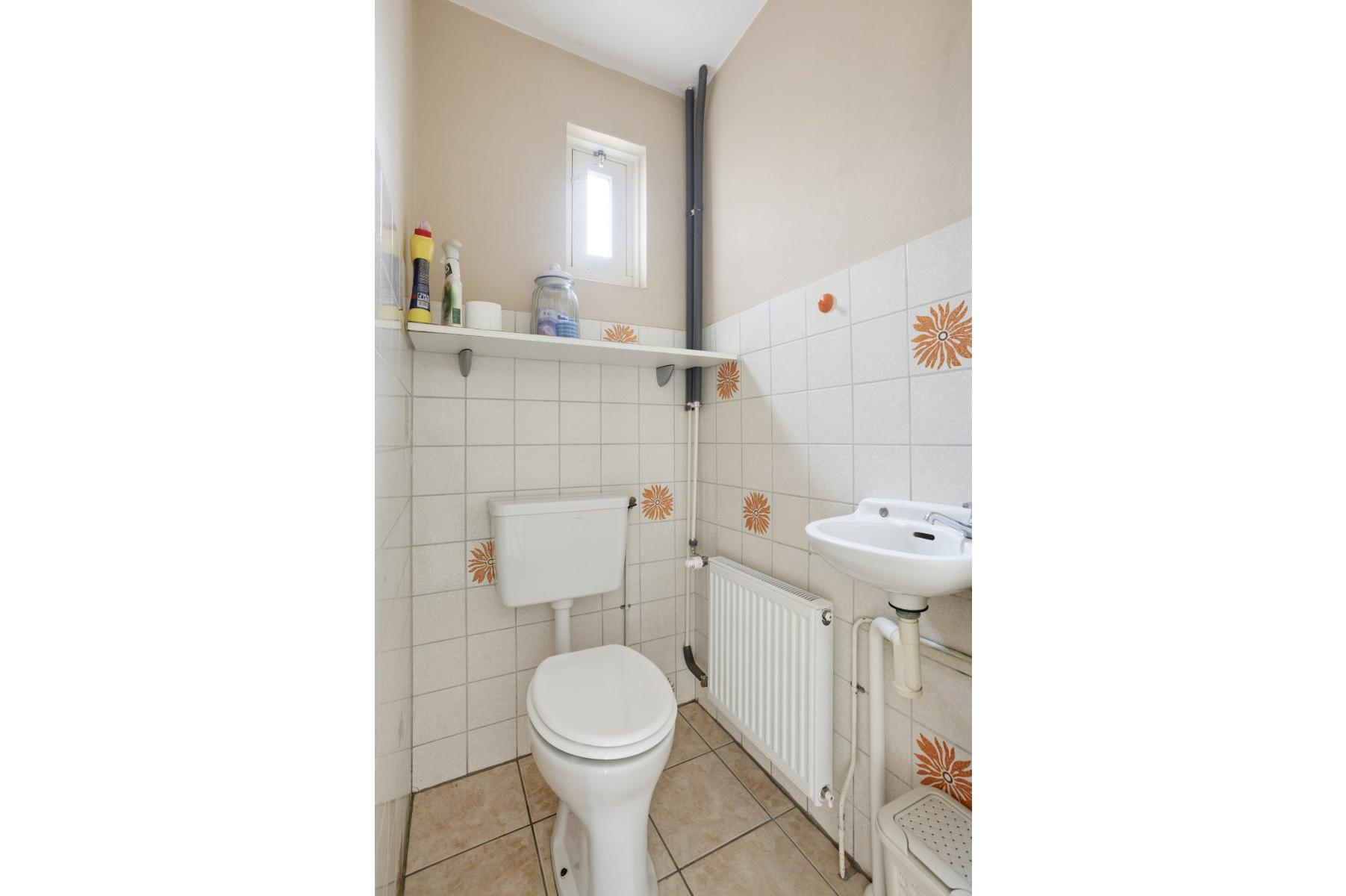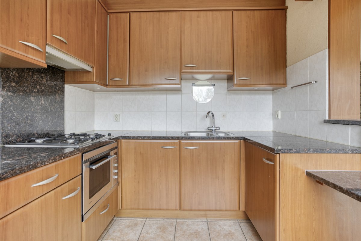 Begane grond: entree/hal, toilet met fontein, sfeervolle Z-vormige living ca.42m² met suite deuren, eiken parketvloer, schouw en kunststof schuifpui naar het terras, nette halfopen keuken ca.7m² (plv), hoekkeuken voorzien van 4 pits gaskookplaat, afzuigkap, oven en natuursteen aanrecht blad, bijkeuken ca.285x1.50m.