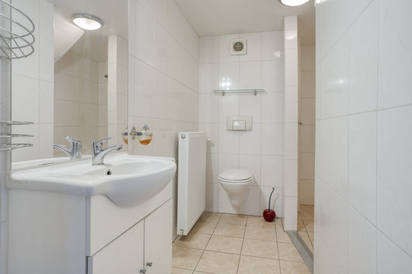 1e Verdieping: overloop (laminaat), 3 slaapkamers resp. ca.7.60x3.00m, ca.4.10x3.05m en ca.4.10x2.35m (alle laminaat), nette badkamer met inloopdouche, wastafelmeubel en 2e toilet, via vaste trap naar......