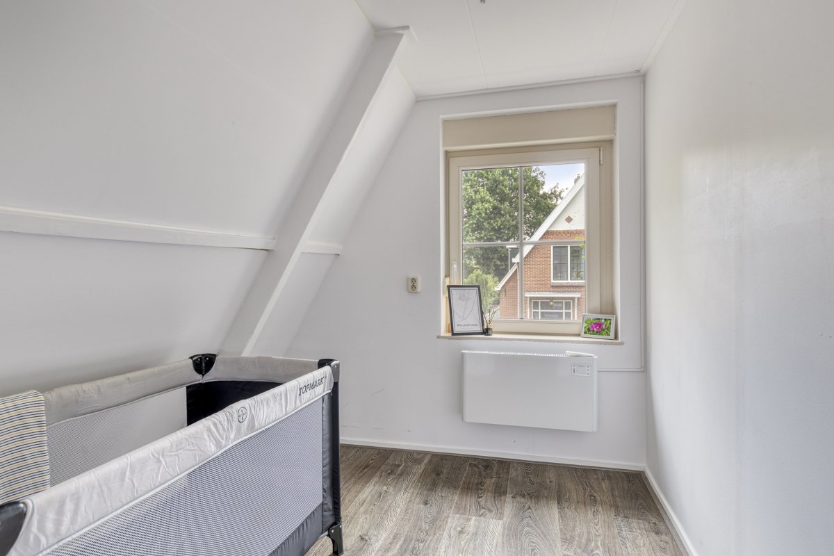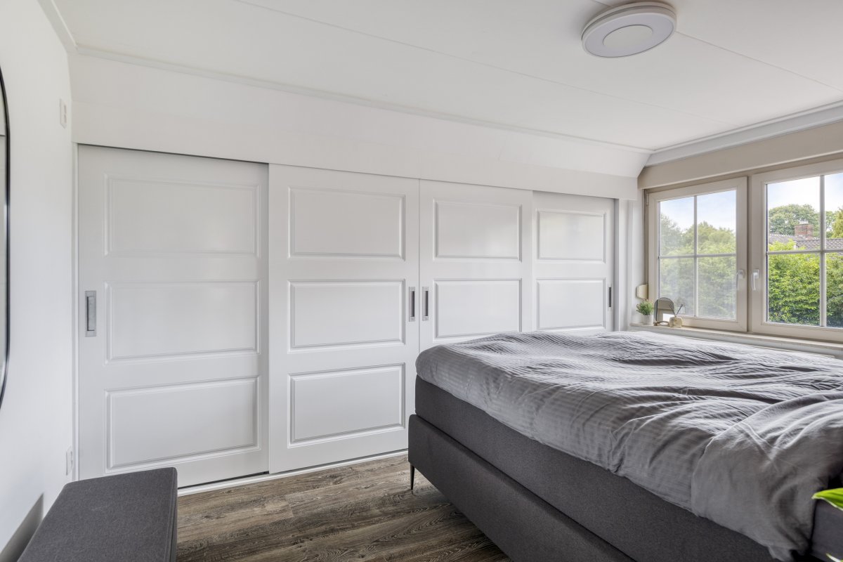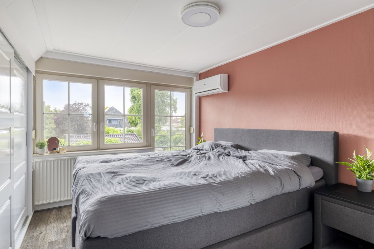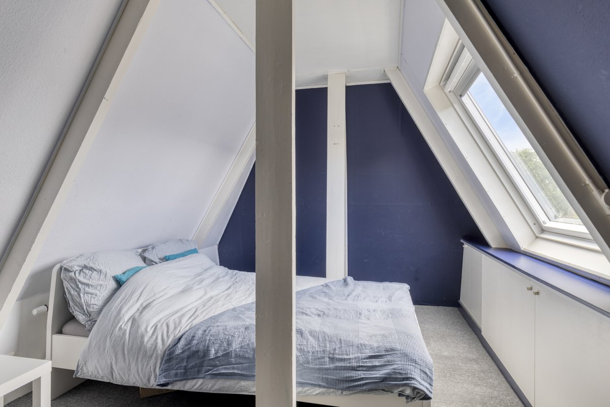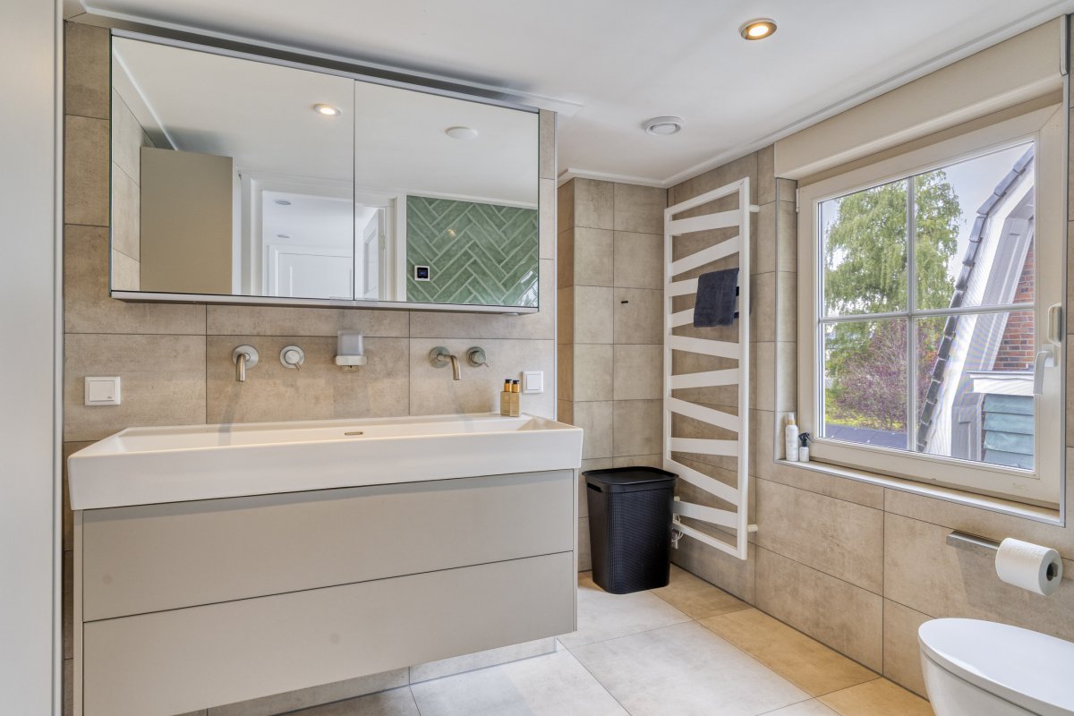 Op de eerste verdieping bevindt zich een overloop die toegang biedt tot de recent gemoderniseerde badkamer met een hangend tweede toilet, dubbele wastafel en een ruime tweepersoons inloop-/regendouche. Vloerverwarming wordt hier eveneens geboden. De drietal slaapkamers zijn respectievelijk 13 m², 14 m² en 5 m². De ouderslaapkamer is voorzien van inbouwkasten en biedt toegang tot het platte dak.