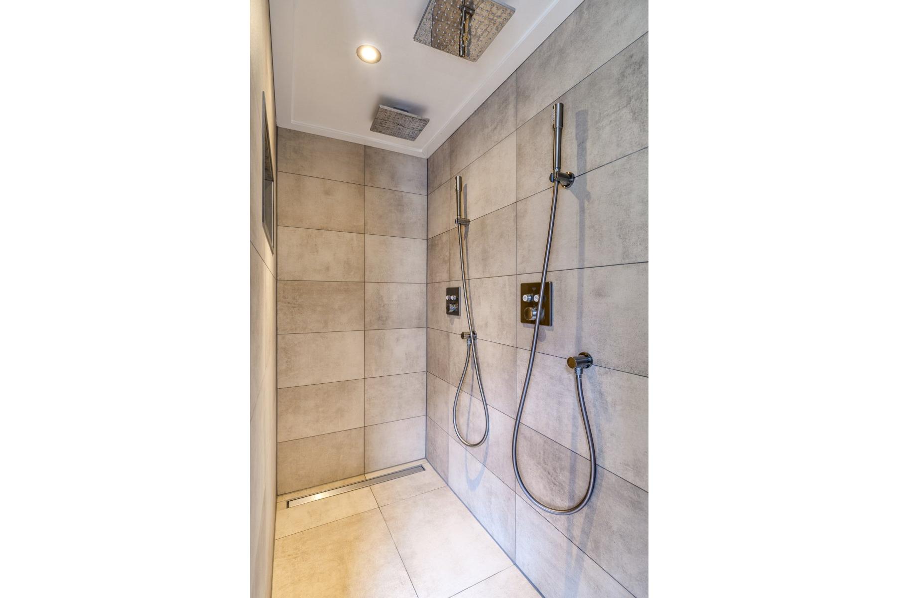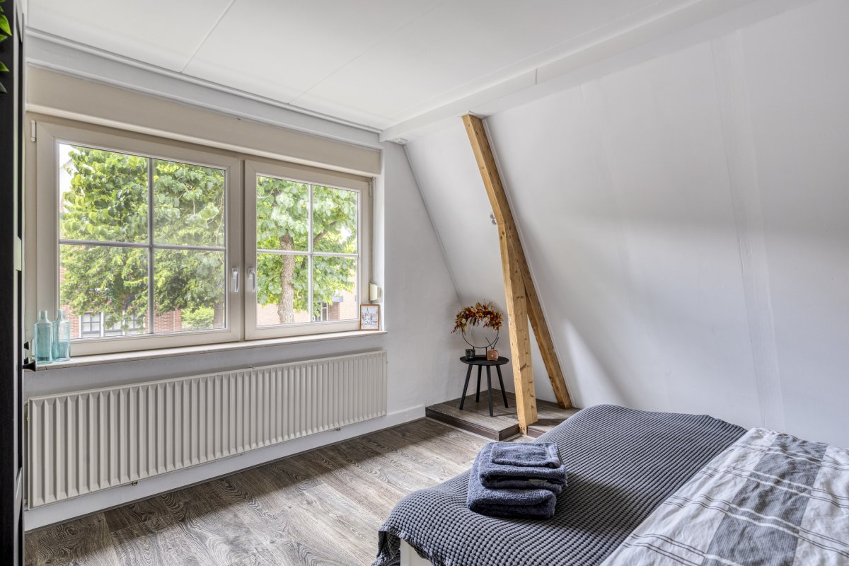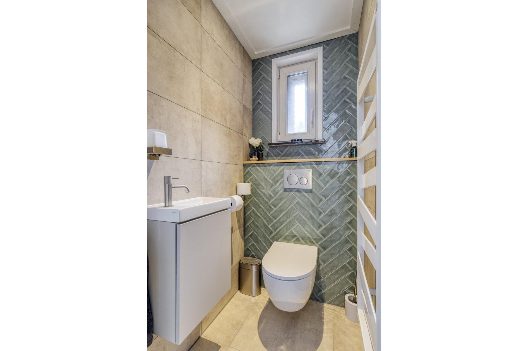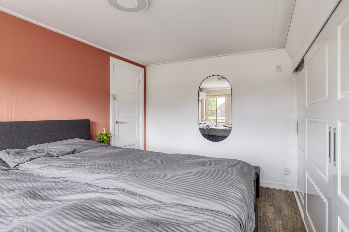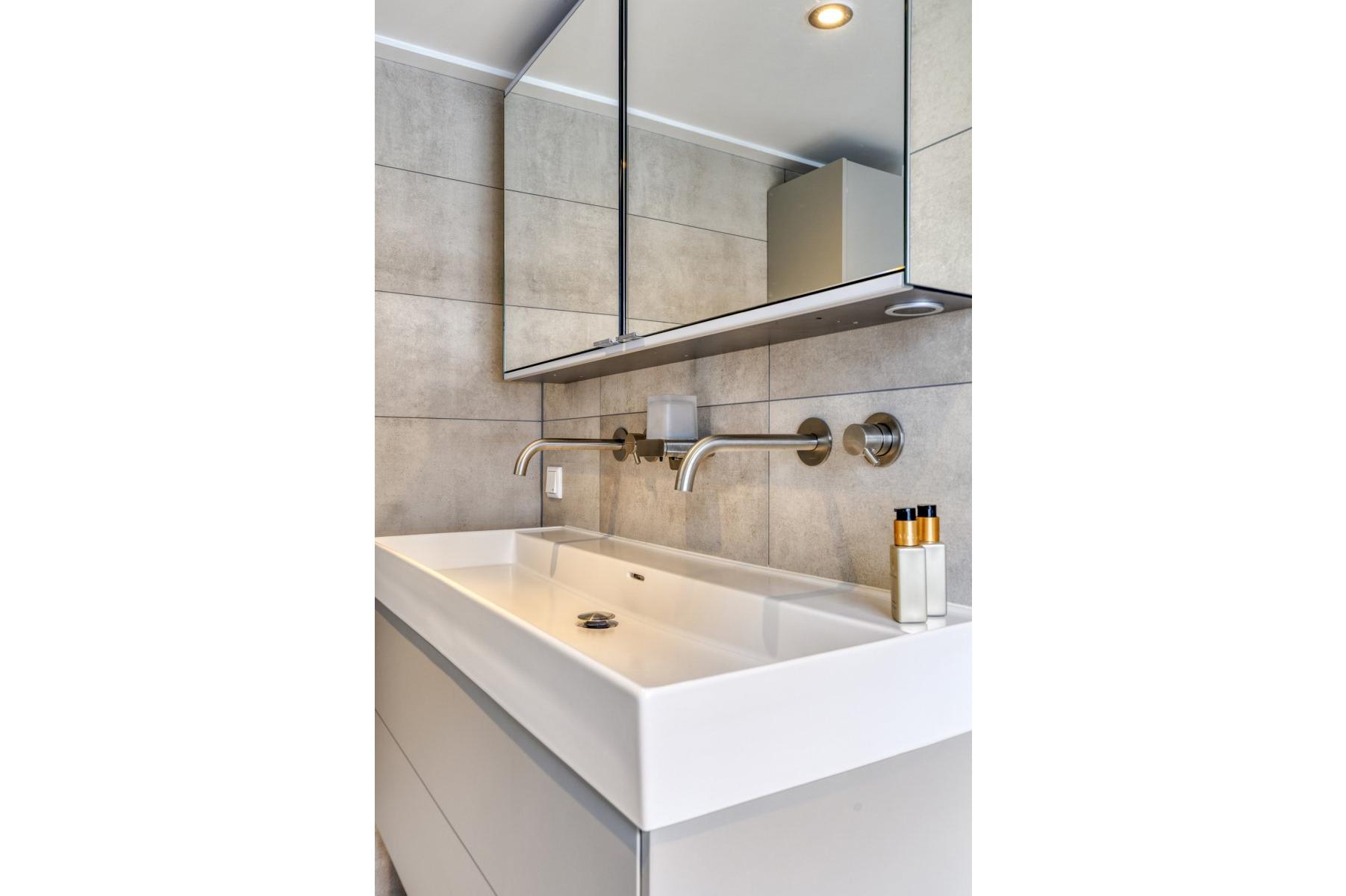 Op de eerste verdieping bevindt zich een overloop die toegang biedt tot de recent gemoderniseerde badkamer met een hangend tweede toilet, dubbele wastafel en een ruime tweepersoons inloop-/regendouche. Vloerverwarming wordt hier eveneens geboden. De drietal slaapkamers zijn respectievelijk 13 m², 14 m² en 5 m². De ouderslaapkamer is voorzien van inbouwkasten en biedt toegang tot het platte dak.