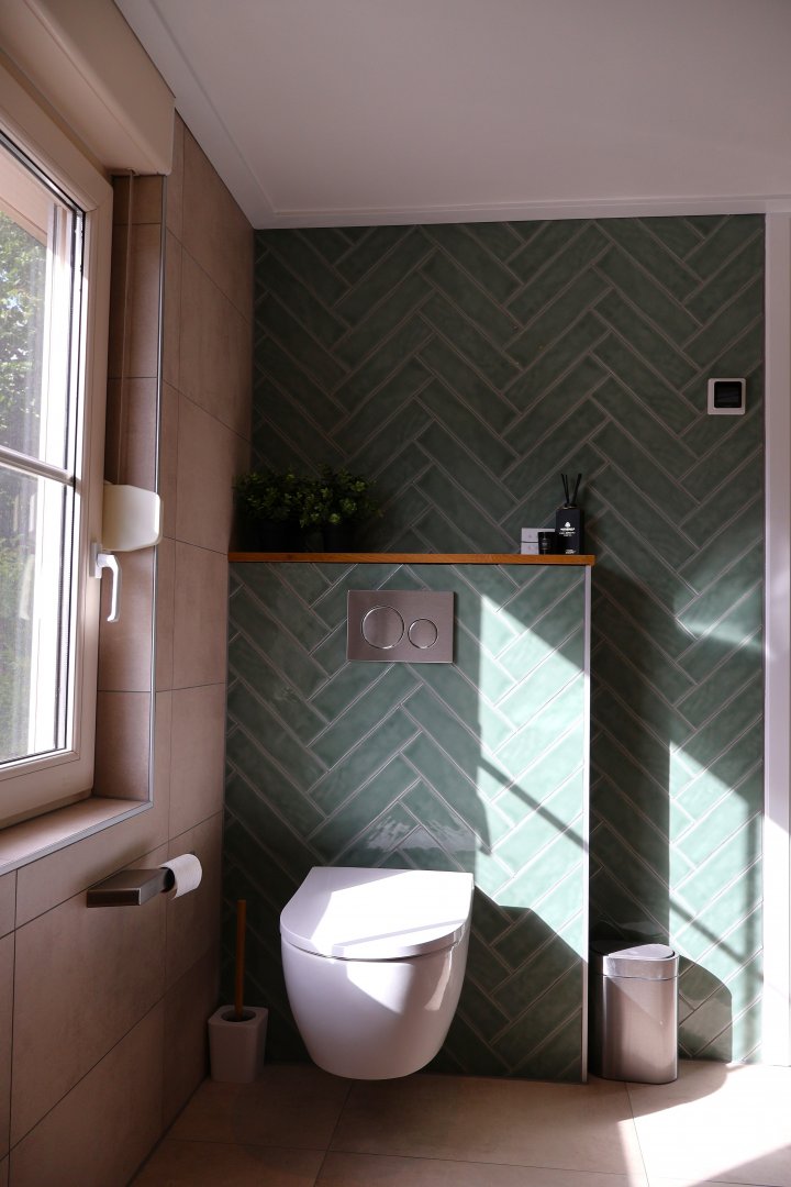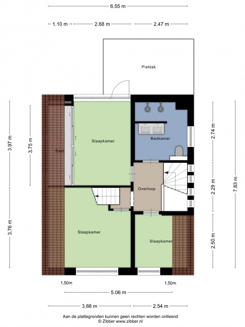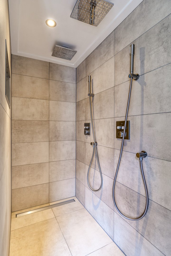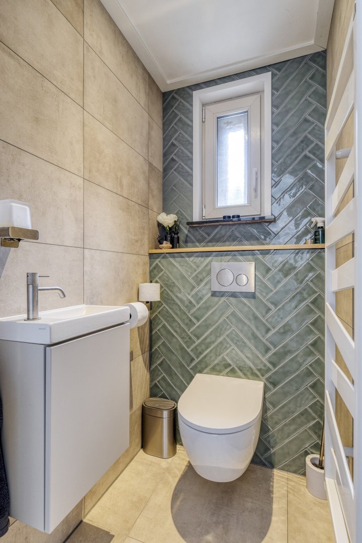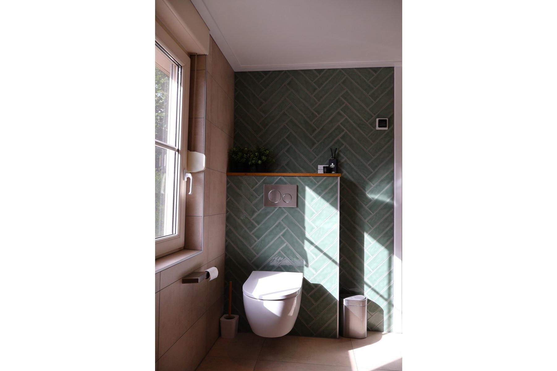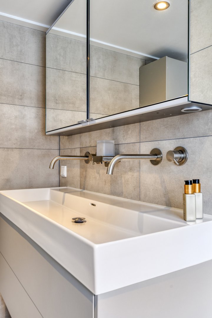 Op de eerste verdieping bevindt zich een overloop die toegang biedt tot de recent gemoderniseerde badkamer met een hangend tweede toilet, dubbele wastafel en een ruime tweepersoons inloop-/regendouche. Vloerverwarming wordt hier eveneens geboden. De drietal slaapkamers zijn respectievelijk 13 m², 14 m² en 5 m². De ouderslaapkamer is voorzien van inbouwkasten en biedt toegang tot het platte dak.