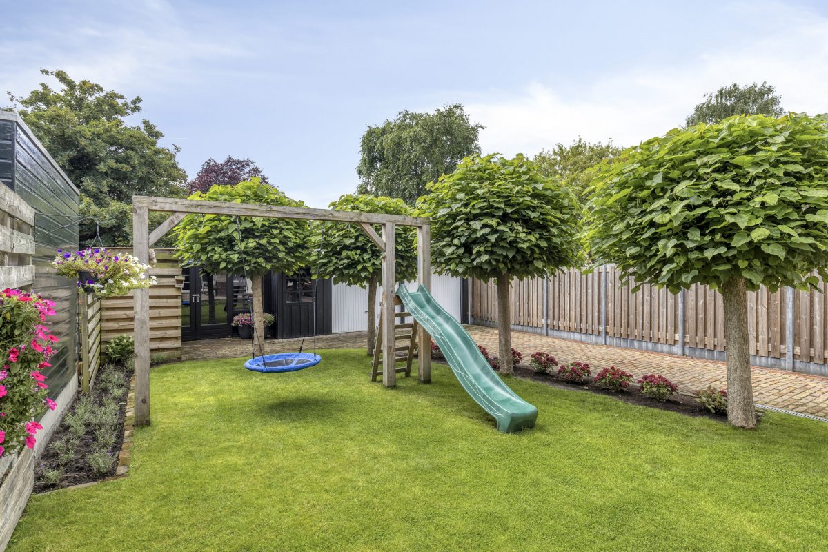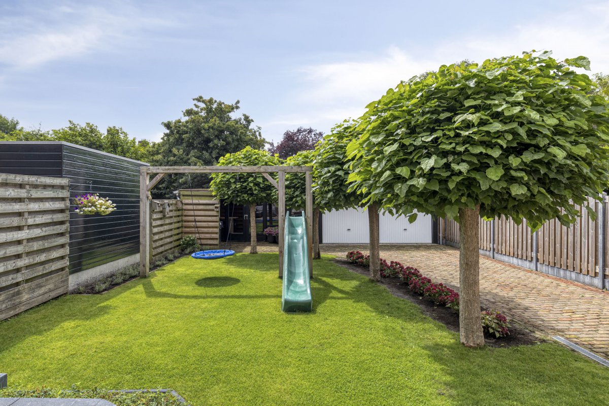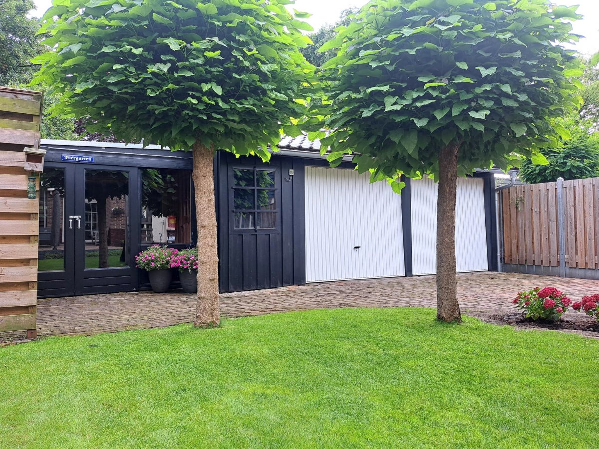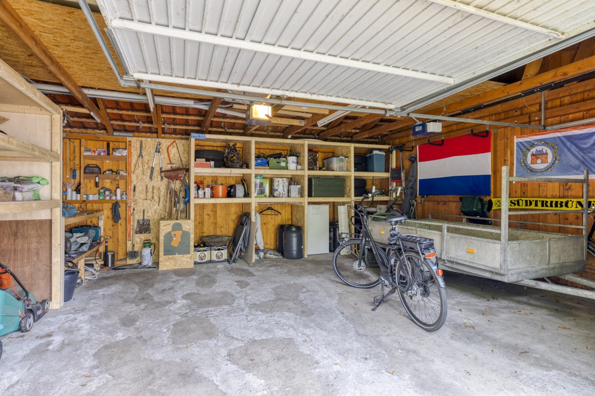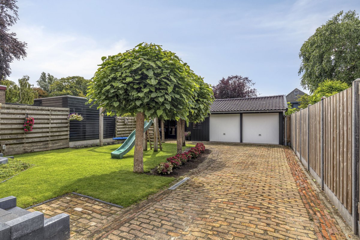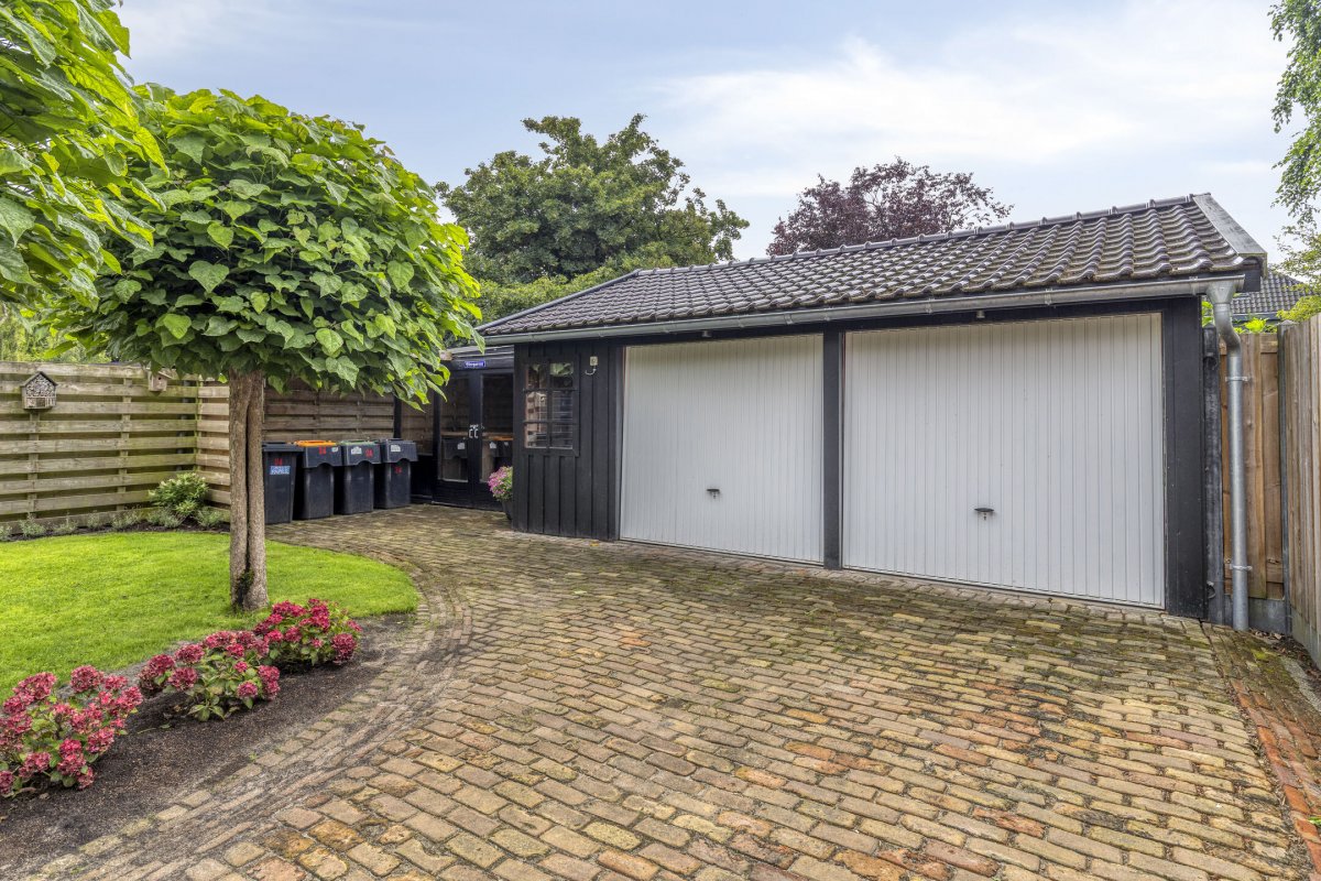 De tuin is zeer verzorgd aangelegd en gesitueerd op het zuiden. De dubbele garage is voorzien van elektrische garagedeuren en biedt ruimte voor een tweetal auto's. Naast de garage bevindt zich een overdekt loungegedeelte.