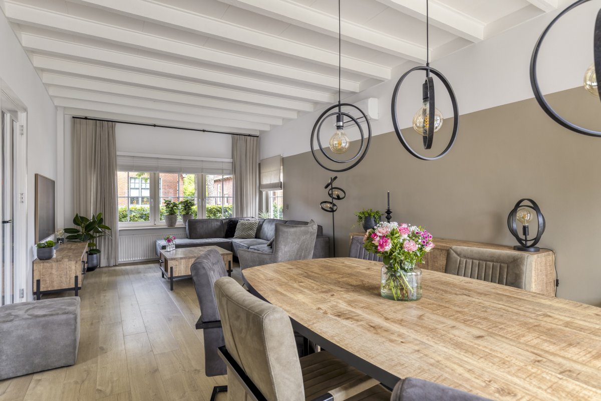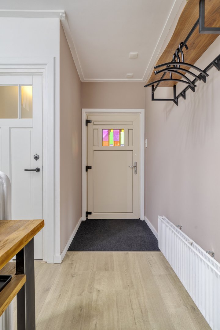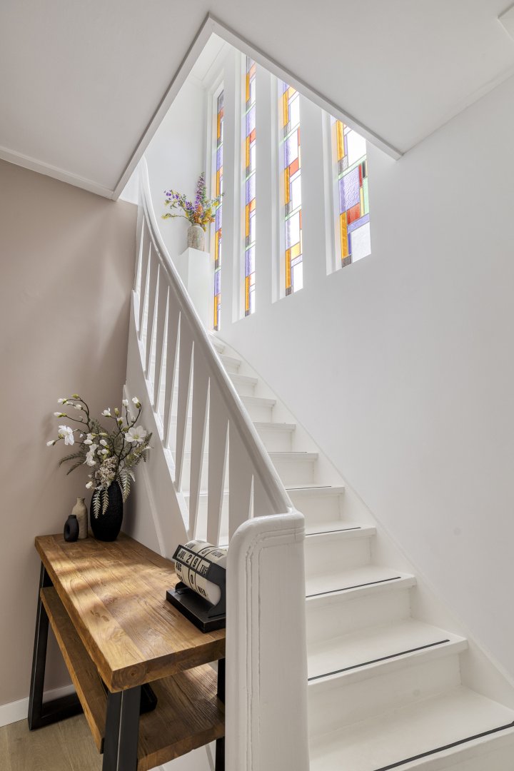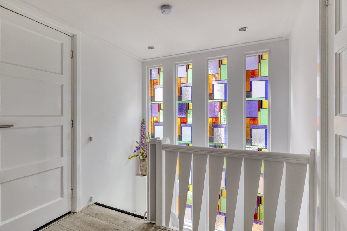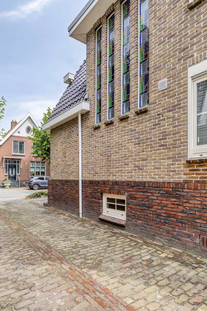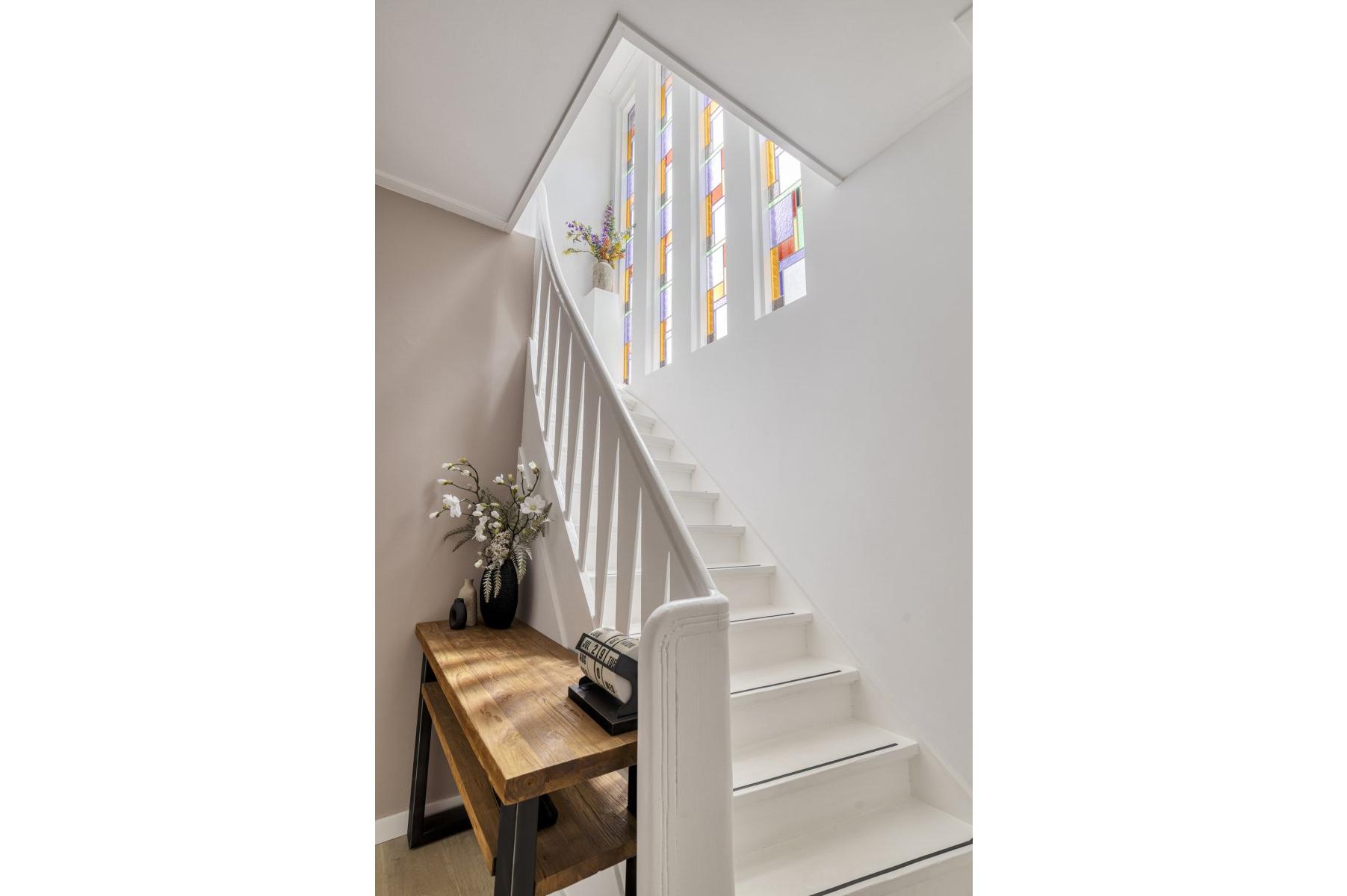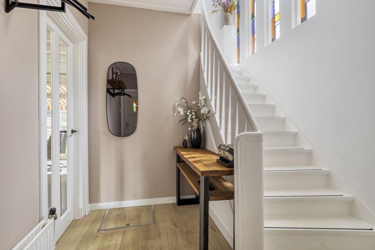 Indeling: entree/hal voorzien van meterkast, modern hangend toilet met fontein en een karakteristieke trapopgang met authentieke details en in dubbelglas verwerkte glas-in-lood ramen. De sfeervolle maar vooral lichte living is grotendeels gesitueerd aan de voorzijde van de woning en geeft toegang tot de provisiekelder alsmede tot de luxe en hoogwaardig afgewerkte, open keuken. De keuken is voorzien van een spoeleiland, inductiekookplaat, vaatwasser, AEG oven, rvs wasemkap, verlichte kastruimten en een natuurstenen aanrechtblad. Tuindeuren geven vanuit de living en keuken toegang tot het terras. De bijkeuken is voorzien van inbouwkasten met de witgoedaansluitingen en een infrarood paneel. De C.V.-opstelling is eveneens opgesteld in de bijkeuken.