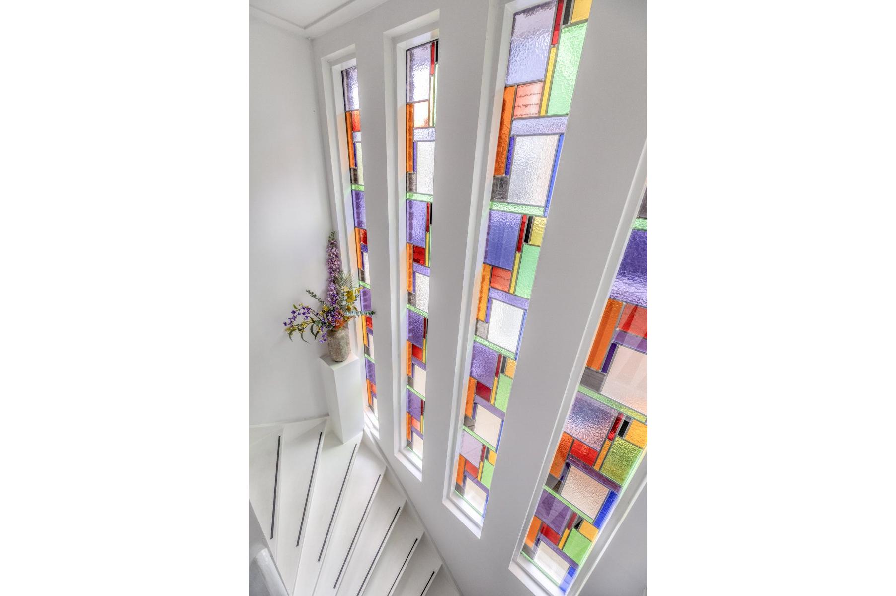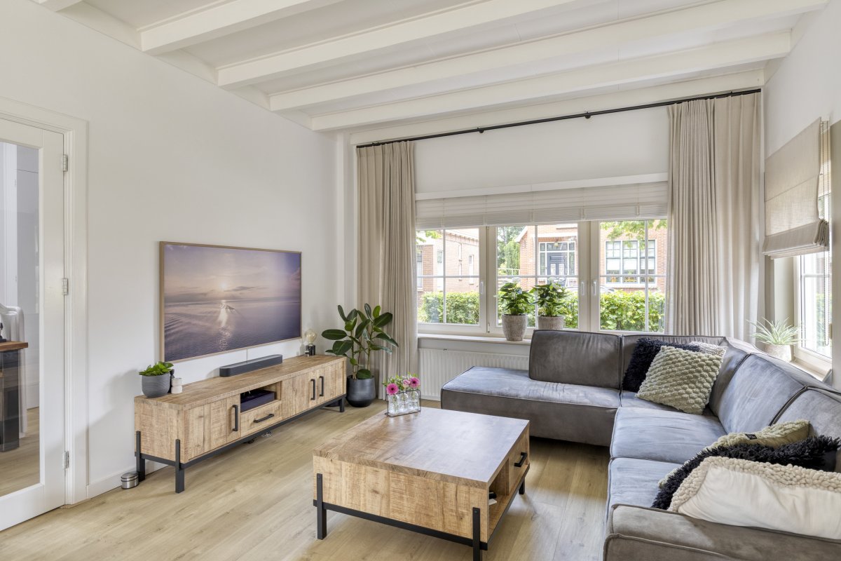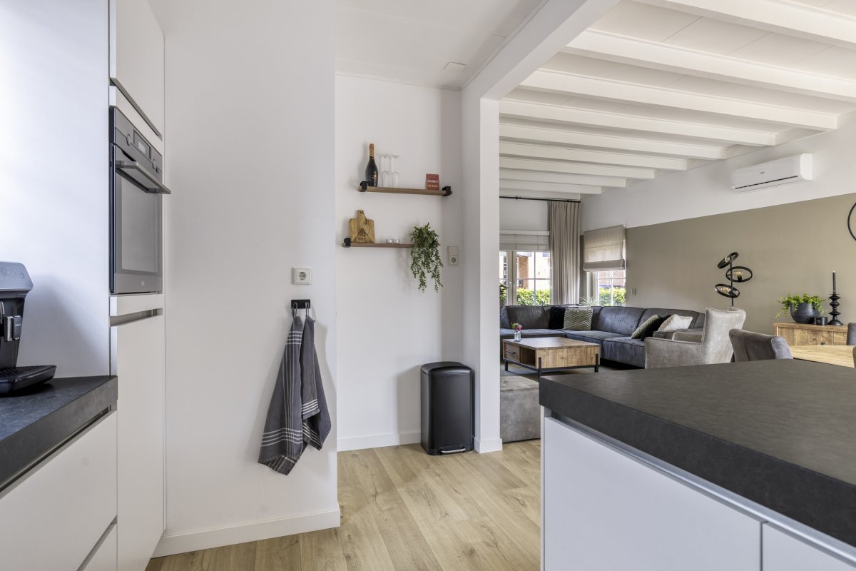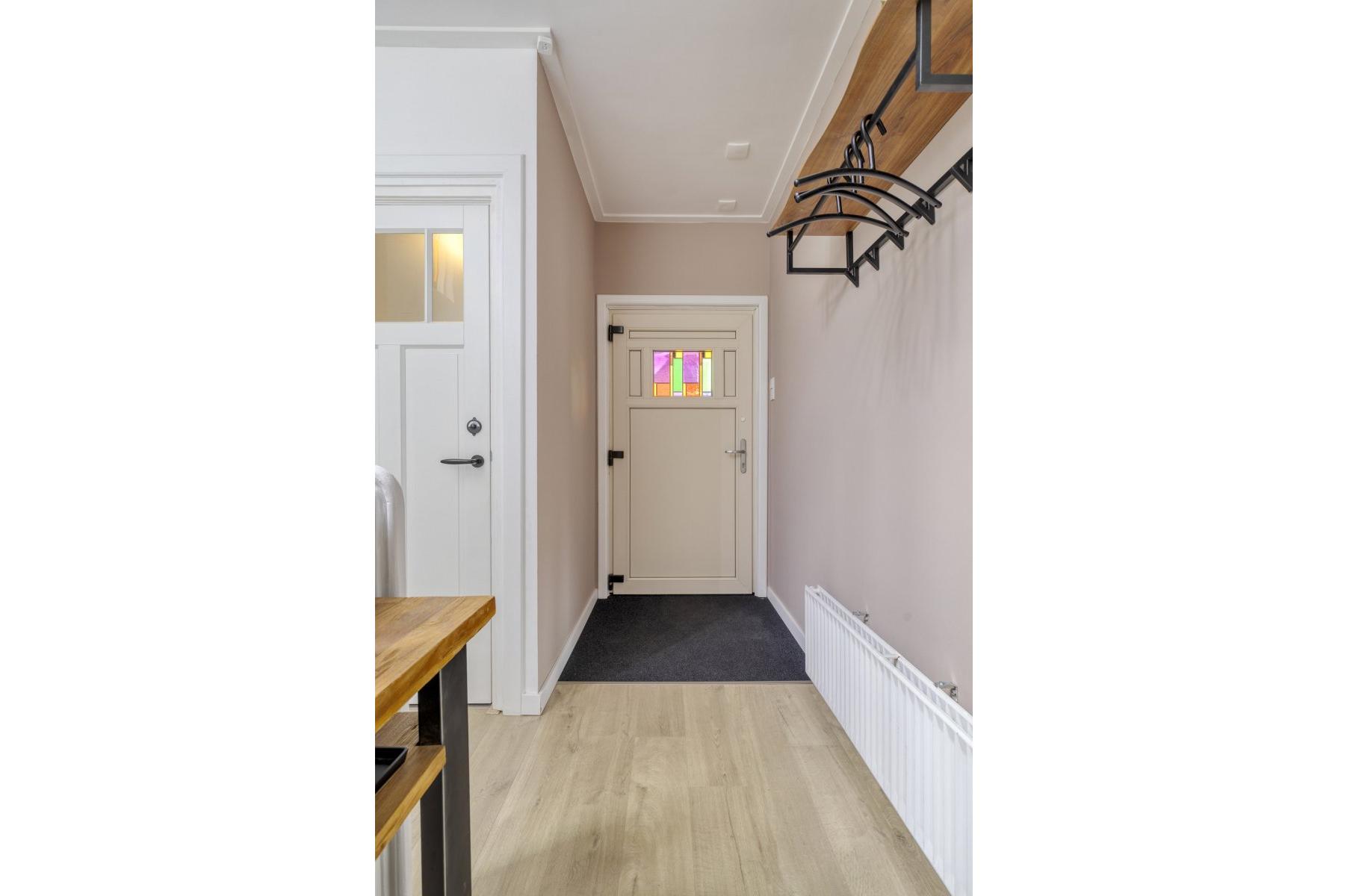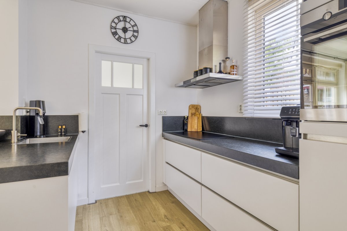 Indeling: entree/hal voorzien van meterkast, modern hangend toilet met fontein en een karakteristieke trapopgang met authentieke details en in dubbelglas verwerkte glas-in-lood ramen. De sfeervolle maar vooral lichte living is grotendeels gesitueerd aan de voorzijde van de woning en geeft toegang tot de provisiekelder alsmede tot de luxe en hoogwaardig afgewerkte, open keuken. De keuken is voorzien van een spoeleiland, inductiekookplaat, vaatwasser, AEG oven, rvs wasemkap, verlichte kastruimten en een natuurstenen aanrechtblad. Tuindeuren geven vanuit de living en keuken toegang tot het terras. De bijkeuken is voorzien van inbouwkasten met de witgoedaansluitingen en een infrarood paneel. De C.V.-opstelling is eveneens opgesteld in de bijkeuken.