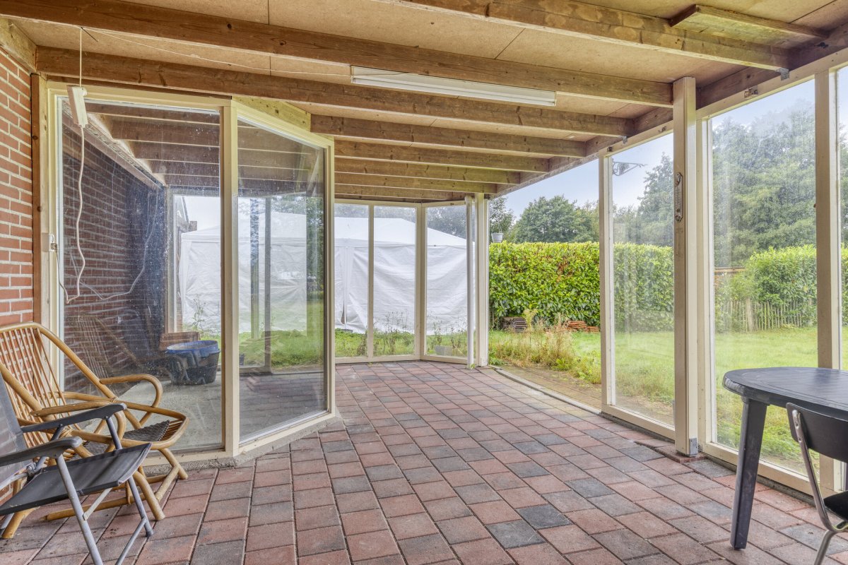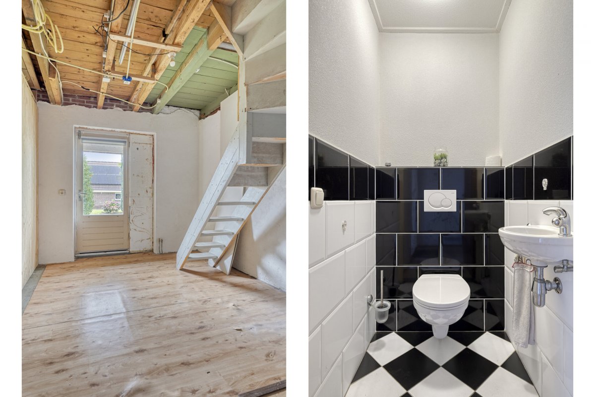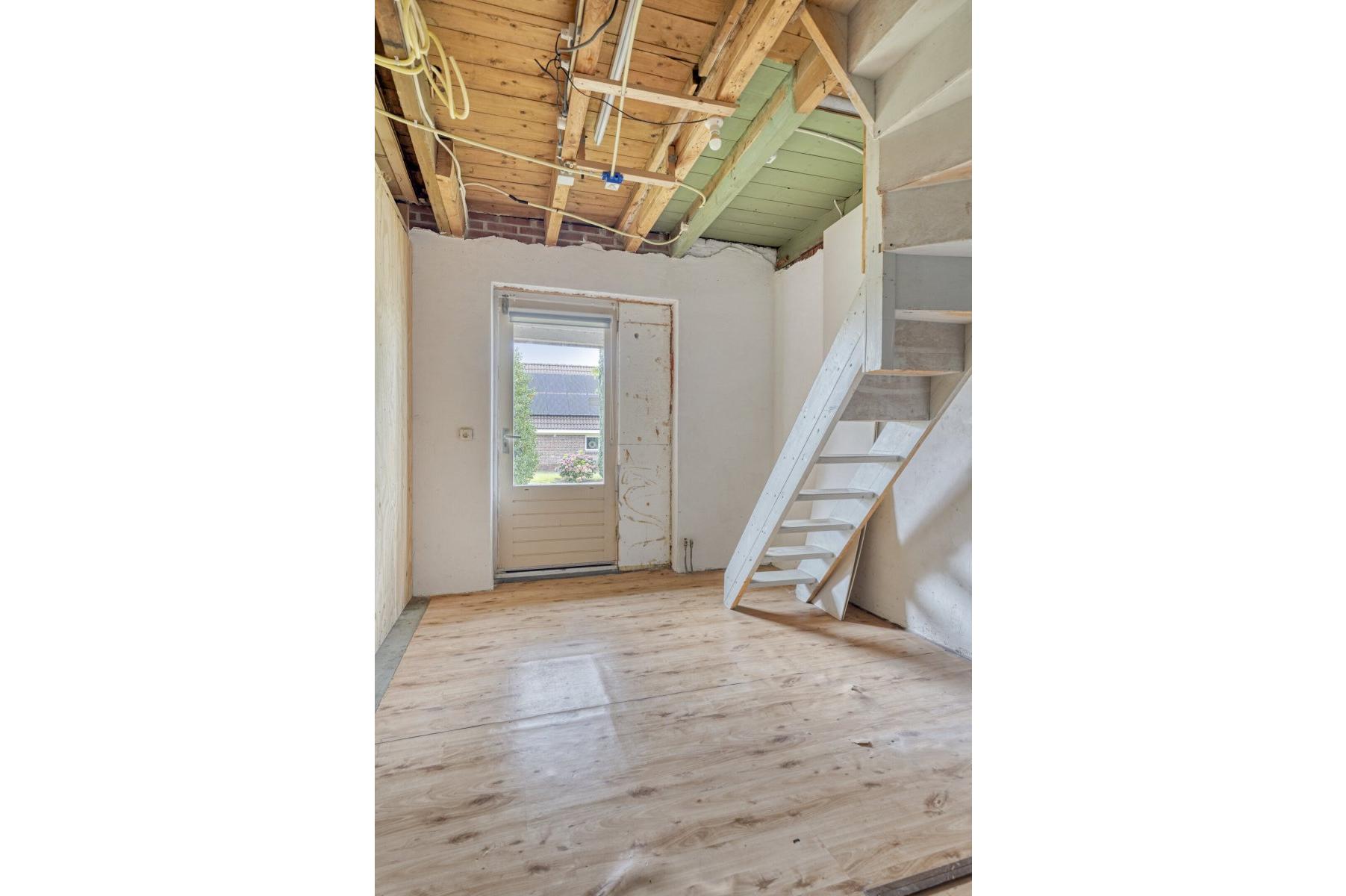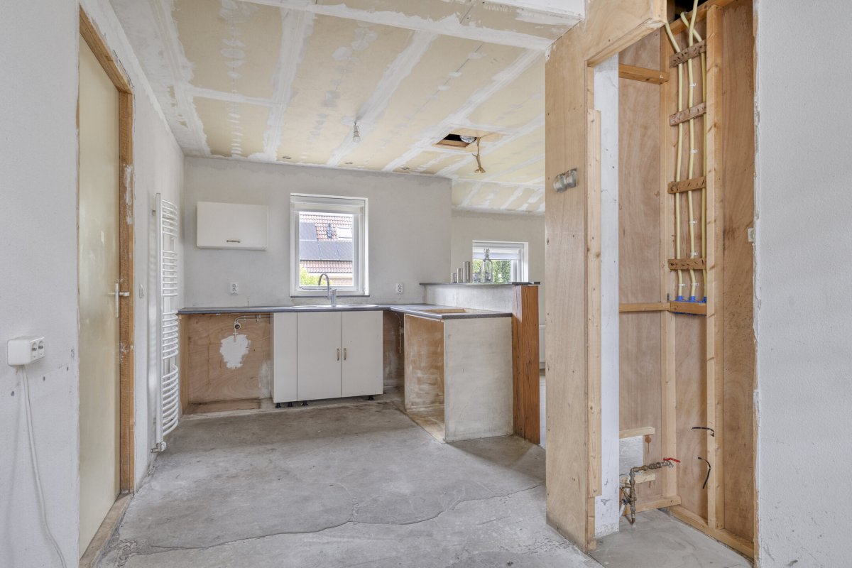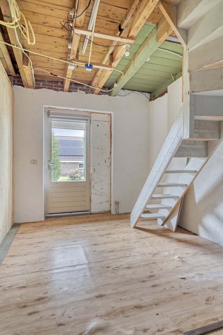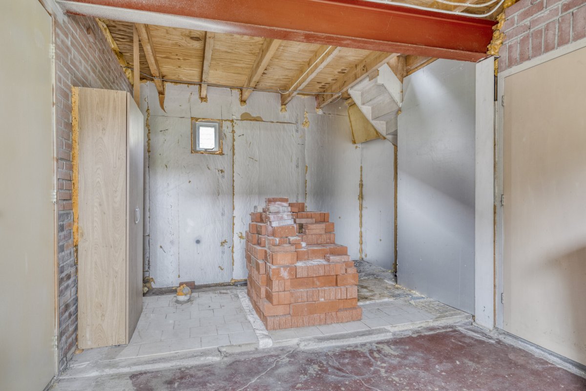 Indeling: ruime entree/hal met trapopgang naar overloop en 2 slaapkamers, gang, woonkamer met parketvloer en gashaard, hangend toilet met fontein, nette badkamer met bubbelbad, douchecabine en wastafelmeubel, slaapkamer, nog te realiseren woonkeuken, achterentree/bijkeuken met trapopgang naar overloop en slaapkamer, nog te realiseren tuinkamer met serre en overkapping.