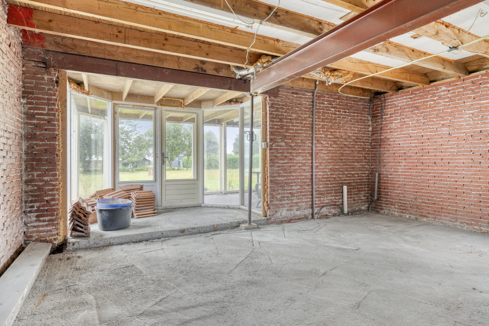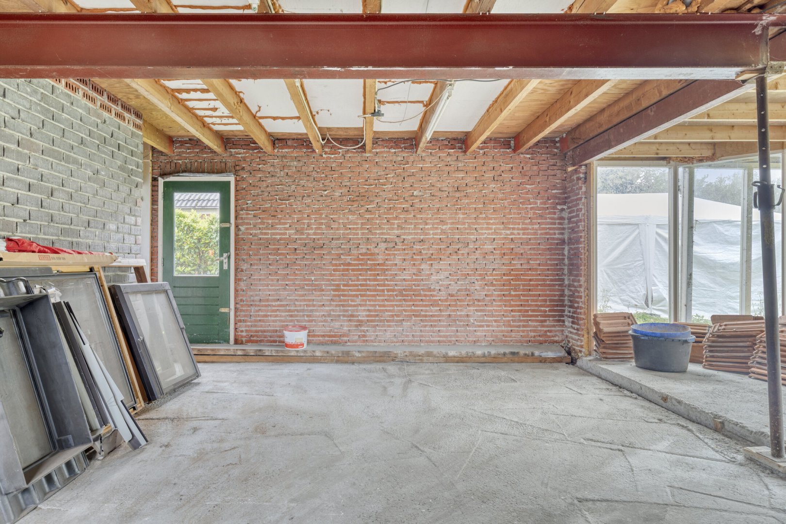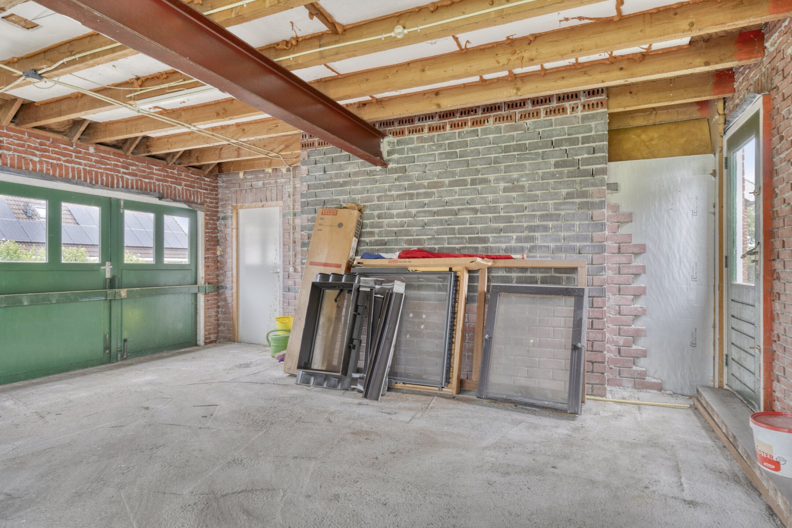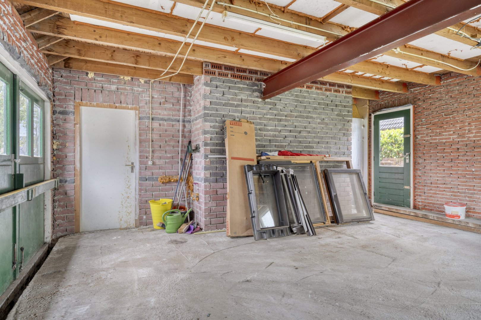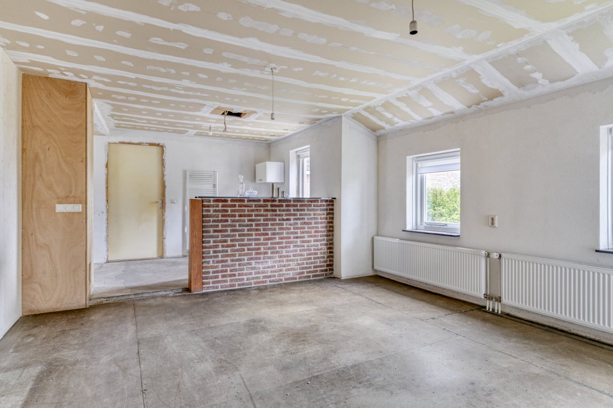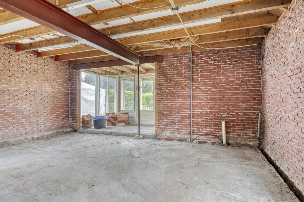 Indeling: ruime entree/hal met trapopgang naar overloop en 2 slaapkamers, gang, woonkamer met parketvloer en gashaard, hangend toilet met fontein, nette badkamer met bubbelbad, douchecabine en wastafelmeubel, slaapkamer, nog te realiseren woonkeuken, achterentree/bijkeuken met trapopgang naar overloop en slaapkamer, nog te realiseren tuinkamer met serre en overkapping.