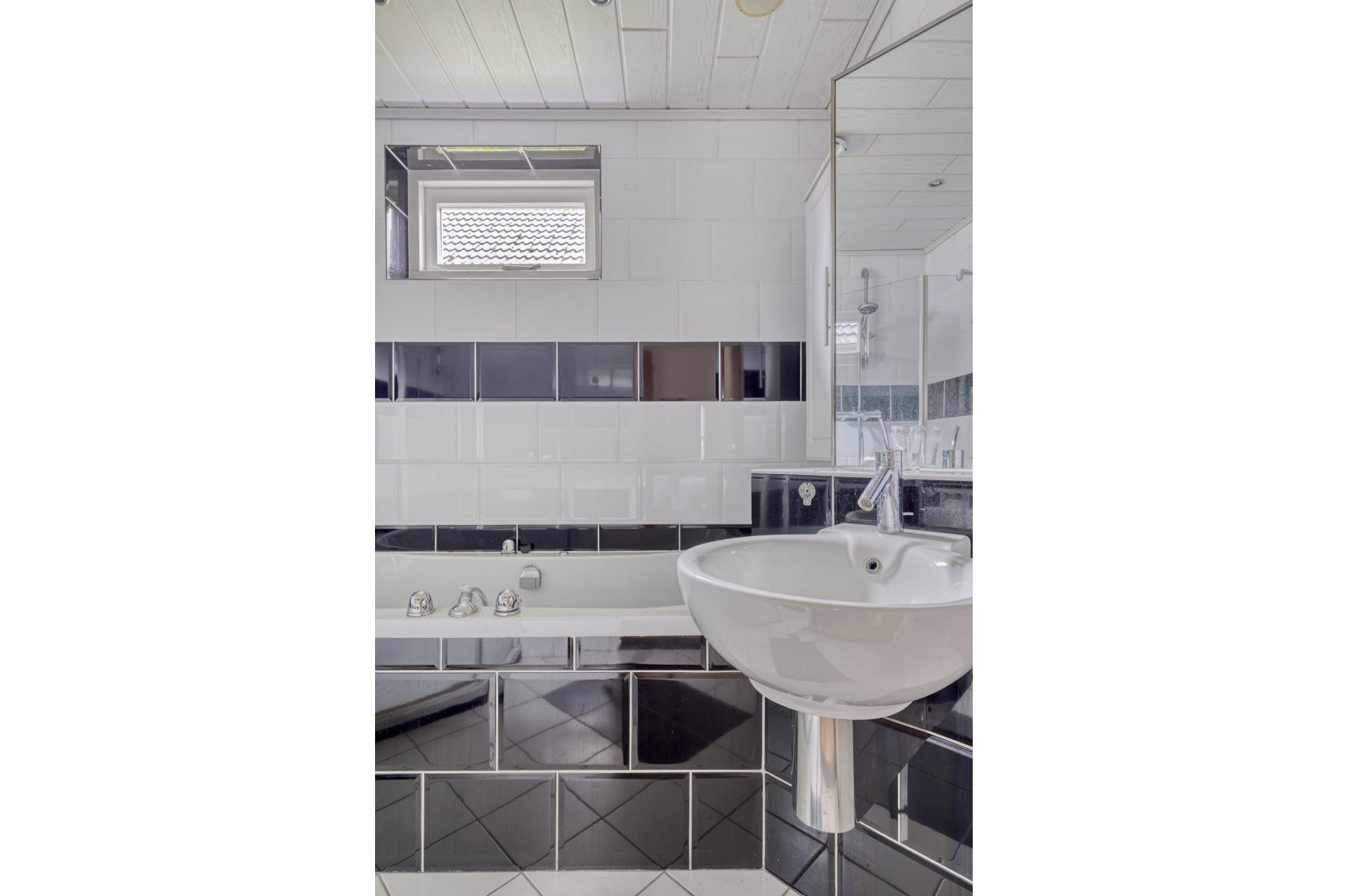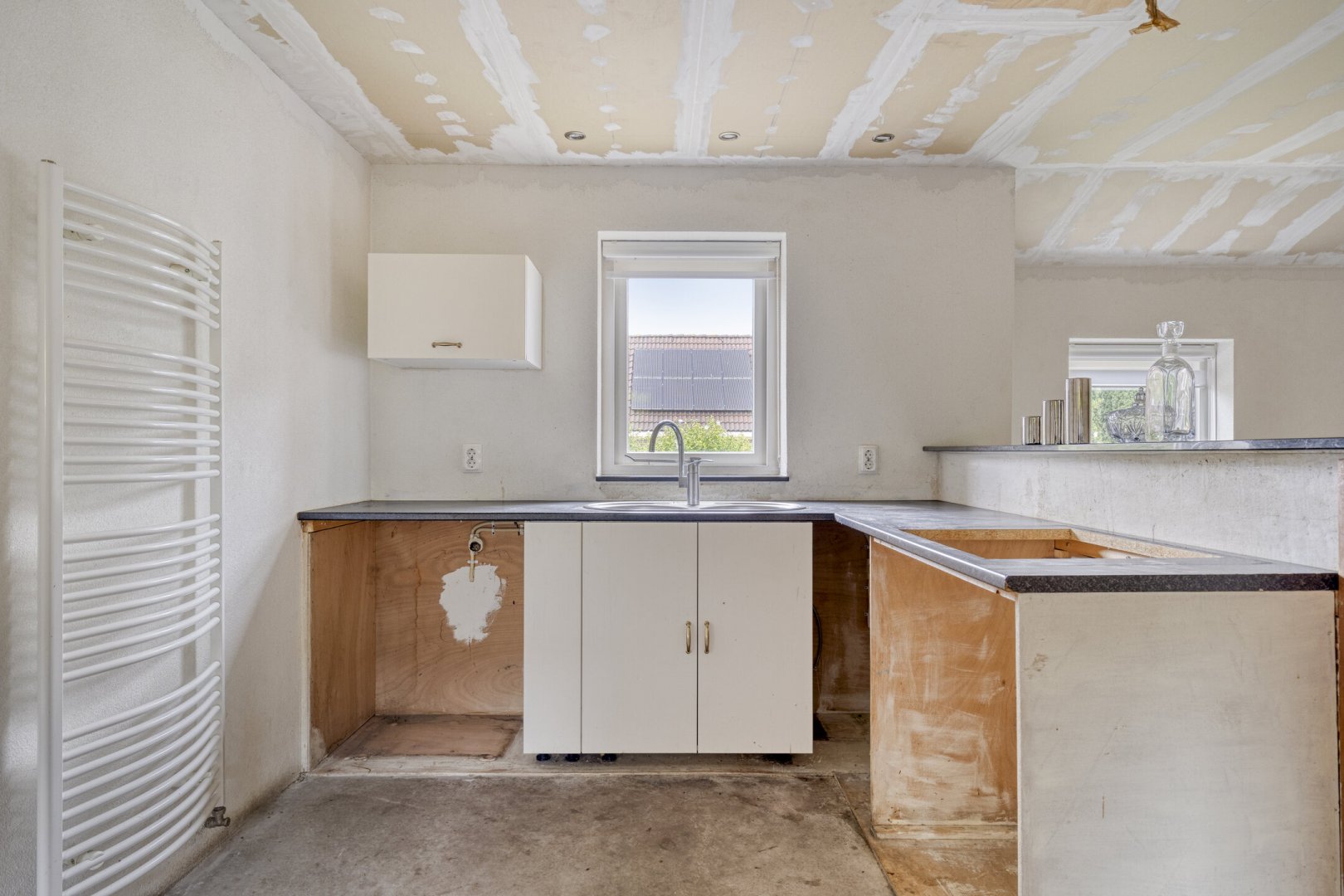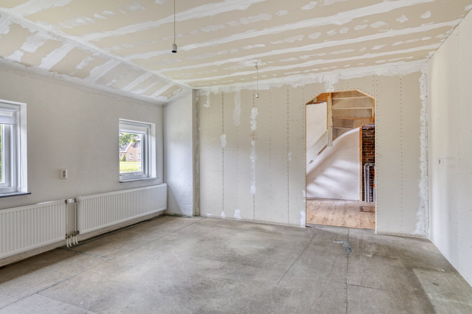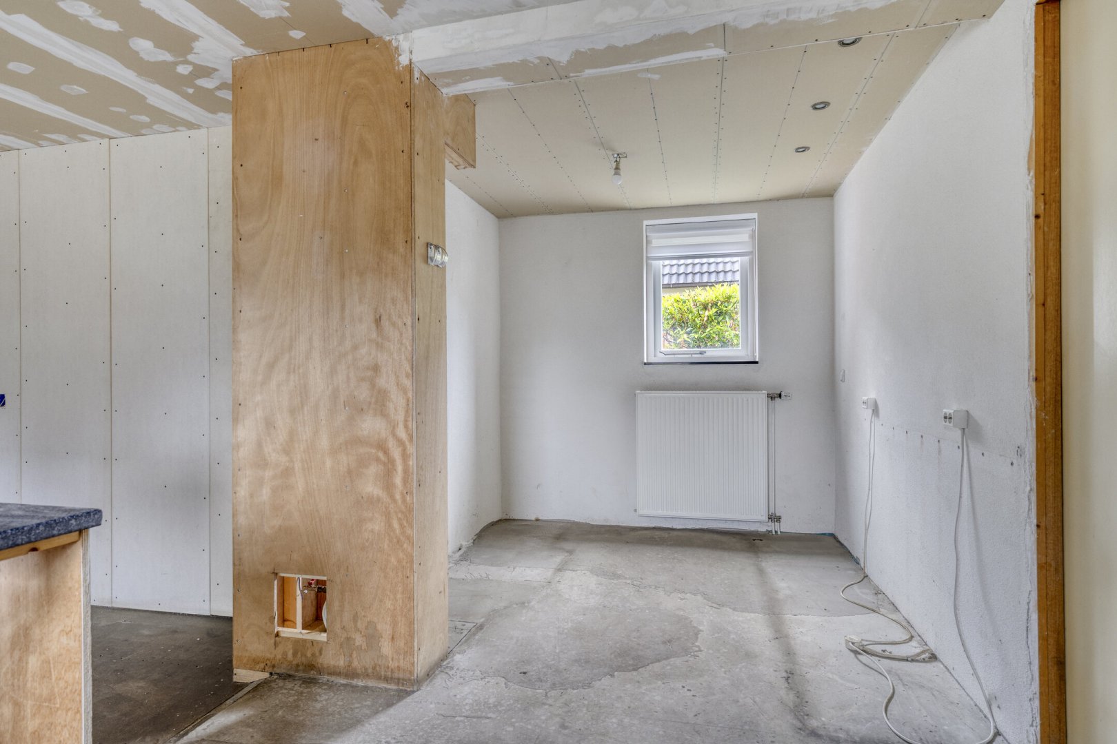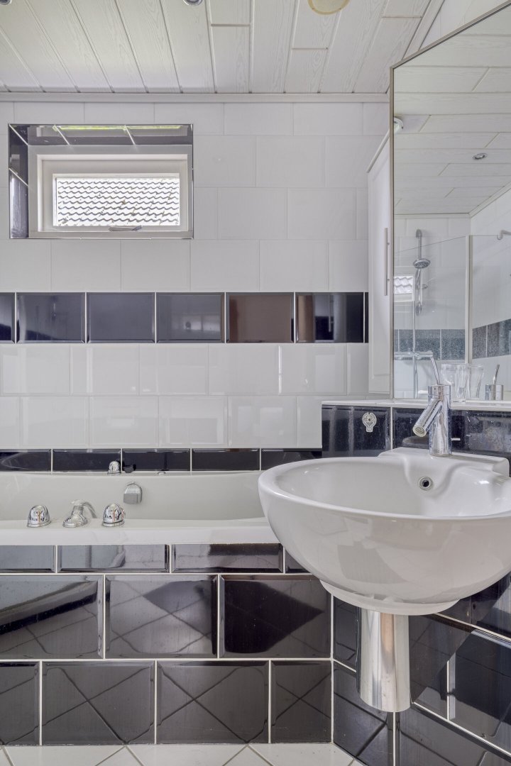 Indeling: ruime entree/hal met trapopgang naar overloop en 2 slaapkamers, gang, woonkamer met parketvloer en gashaard, hangend toilet met fontein, nette badkamer met bubbelbad, douchecabine en wastafelmeubel, slaapkamer, nog te realiseren woonkeuken, achterentree/bijkeuken met trapopgang naar overloop en slaapkamer, nog te realiseren tuinkamer met serre en overkapping.