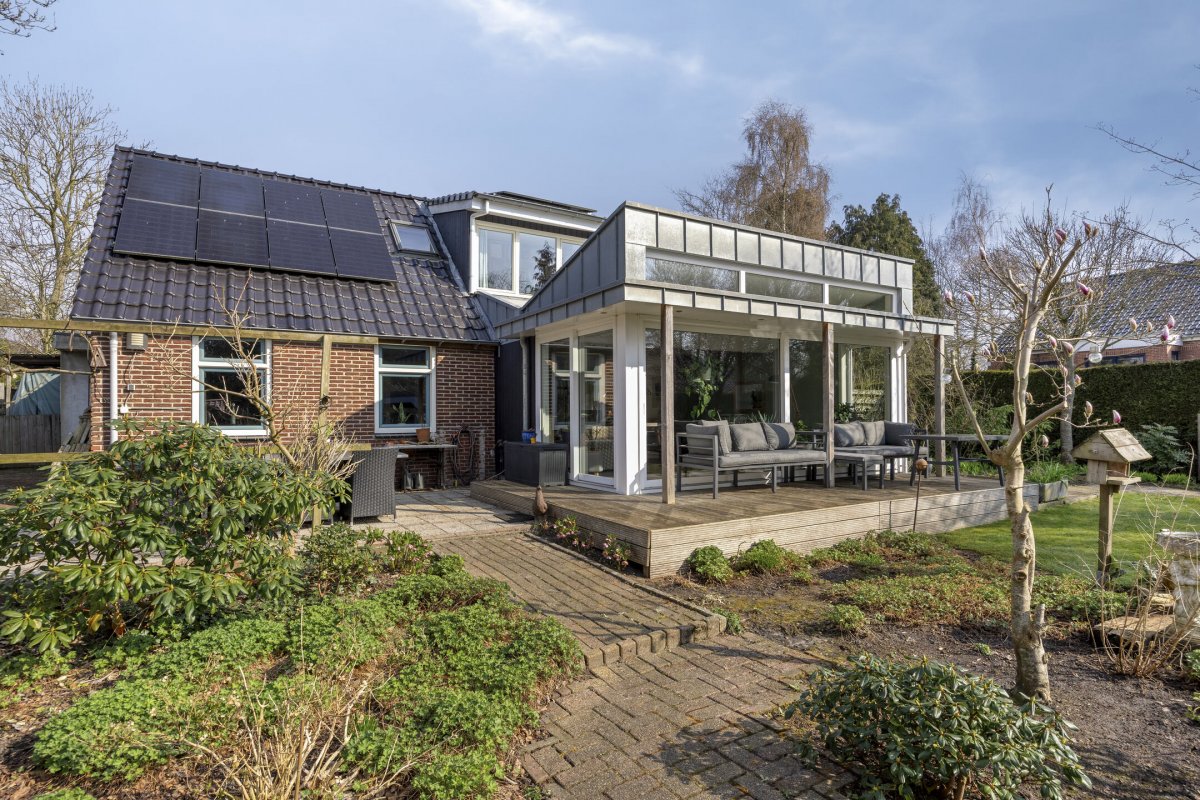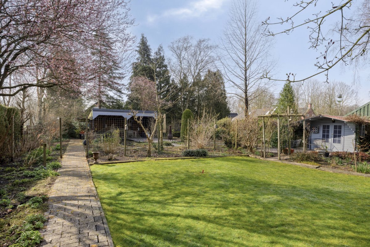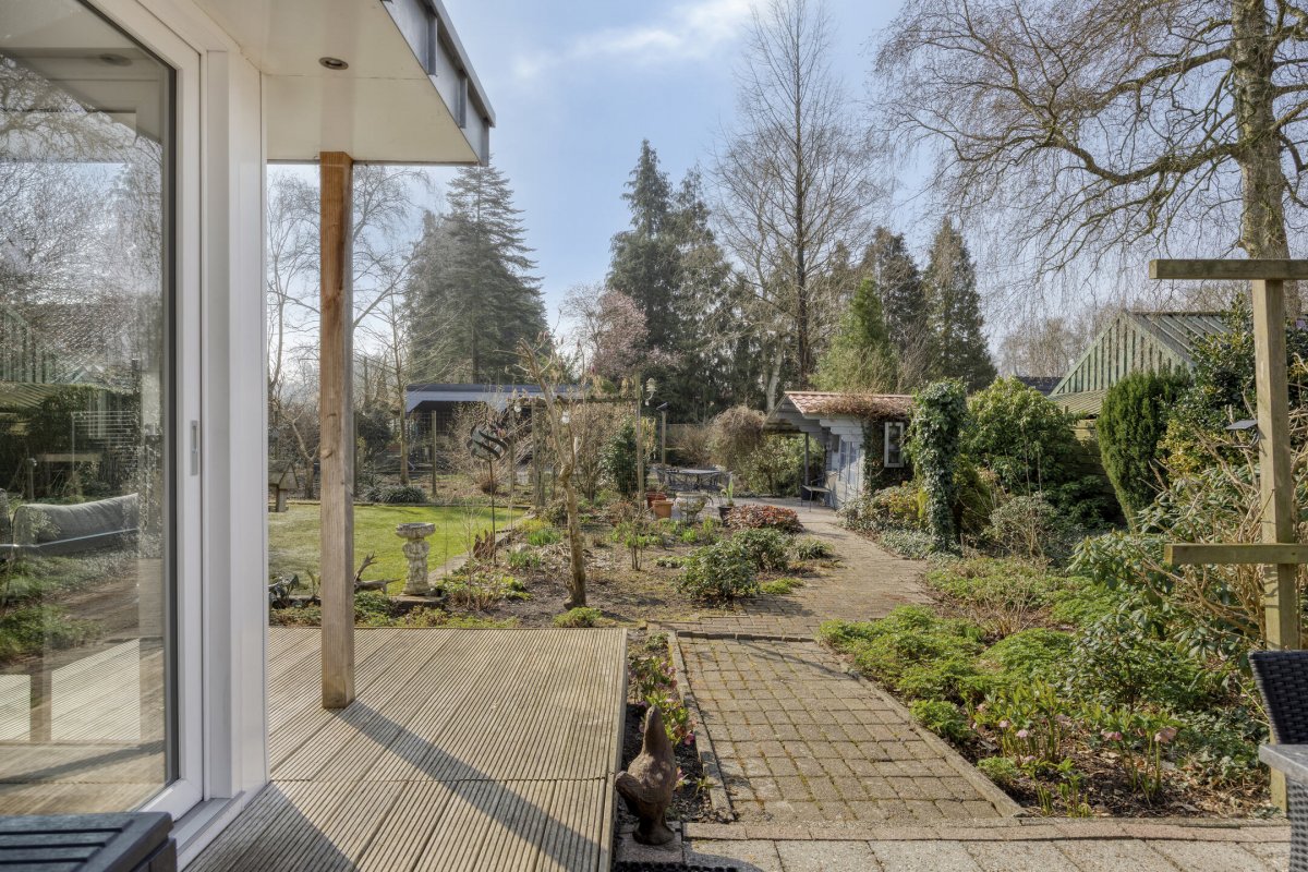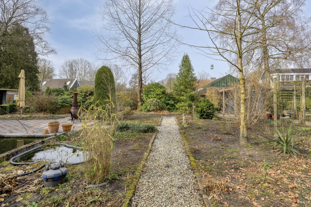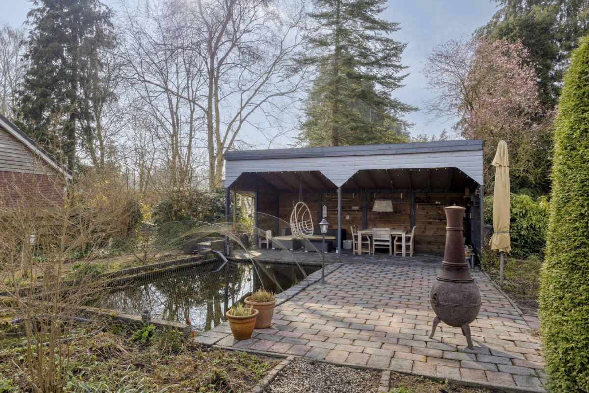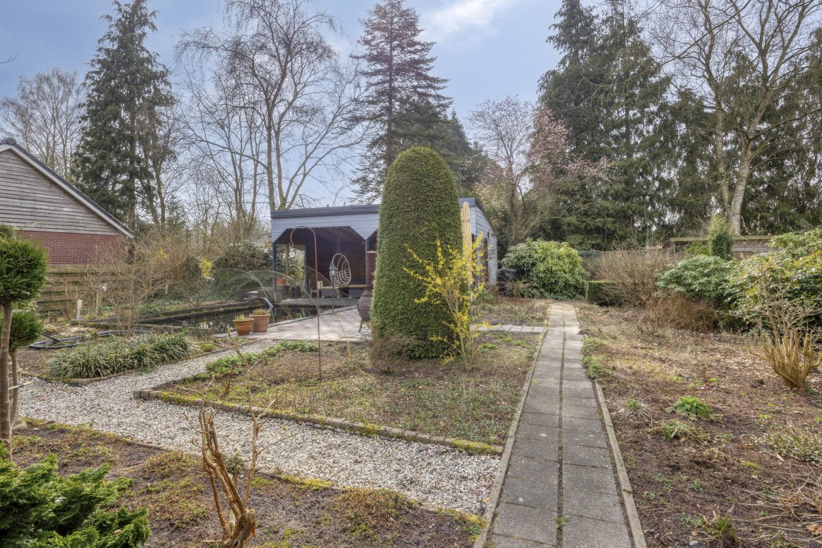 Op rustige locatie, beschut gelegen gemoderniseerde vrijstaande woning met carport, houten tuinhuis, terrasoverkapping, volière, erf en fraai aangelegde tuin op het zuiden met vijverpartij en veel privacy.