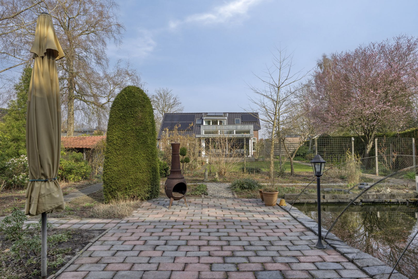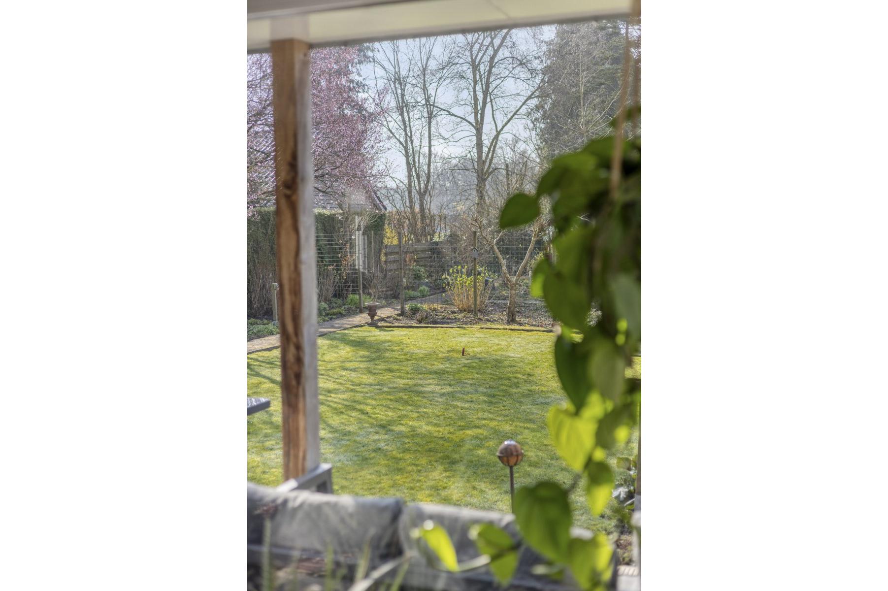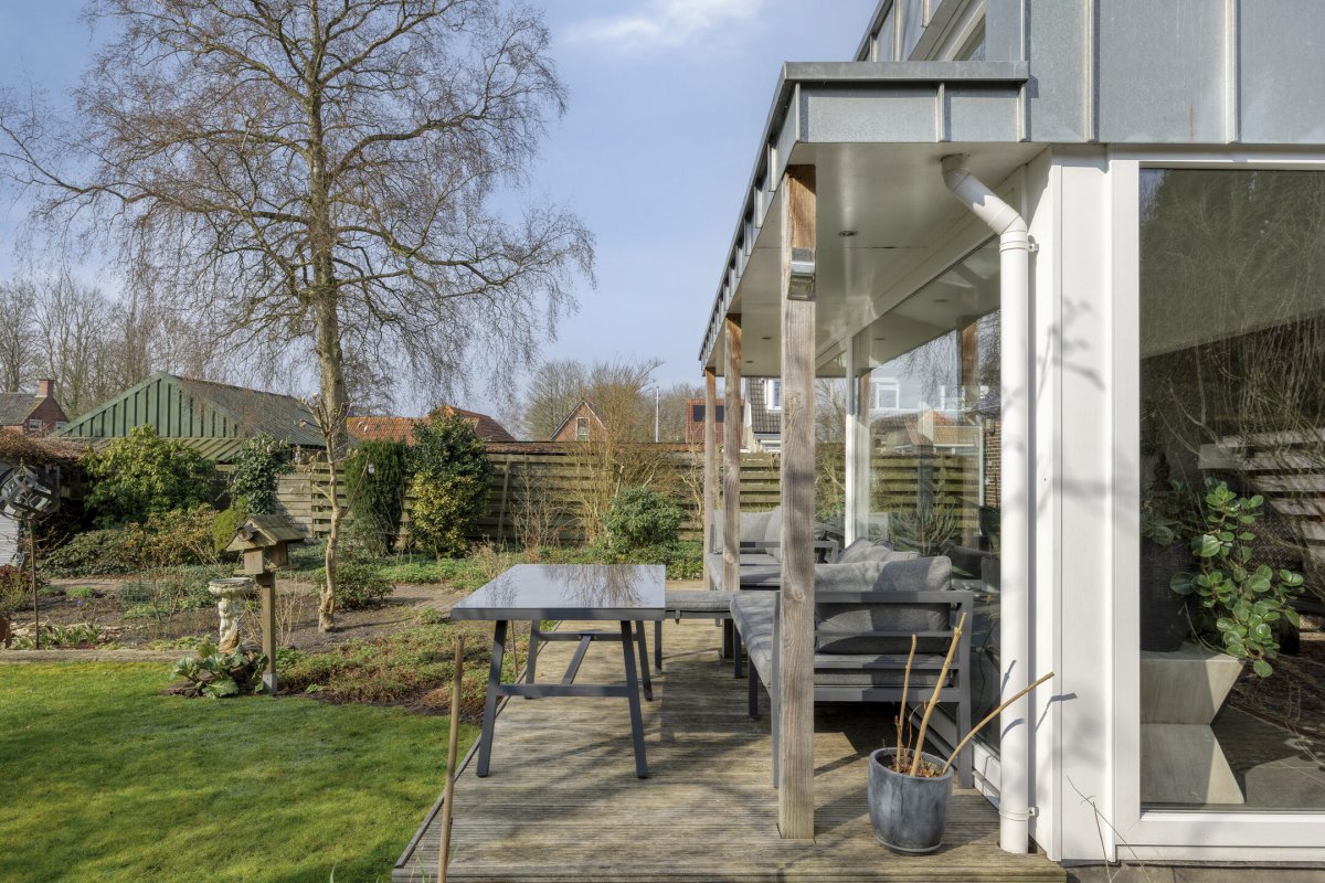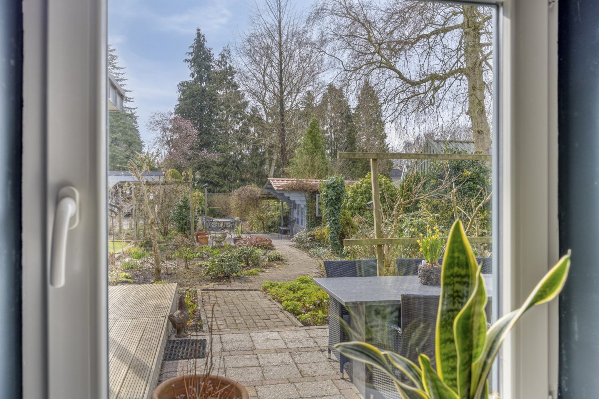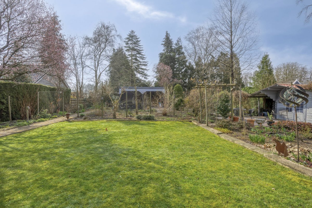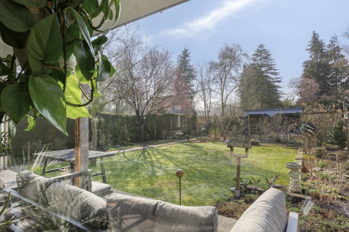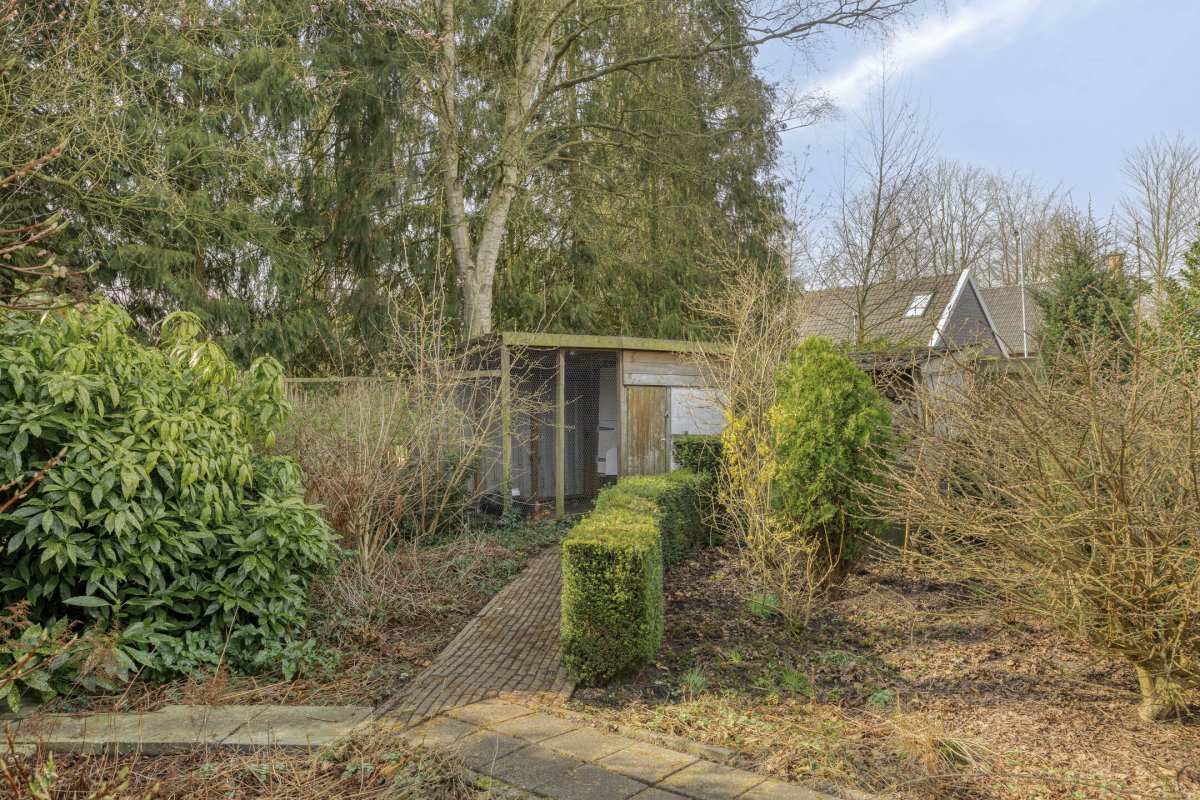Op rustige locatie, beschut gelegen gemoderniseerde vrijstaande woning met carport, houten tuinhuis, terrasoverkapping, volière, erf en fraai aangelegde tuin op het zuiden met vijverpartij en veel privacy.