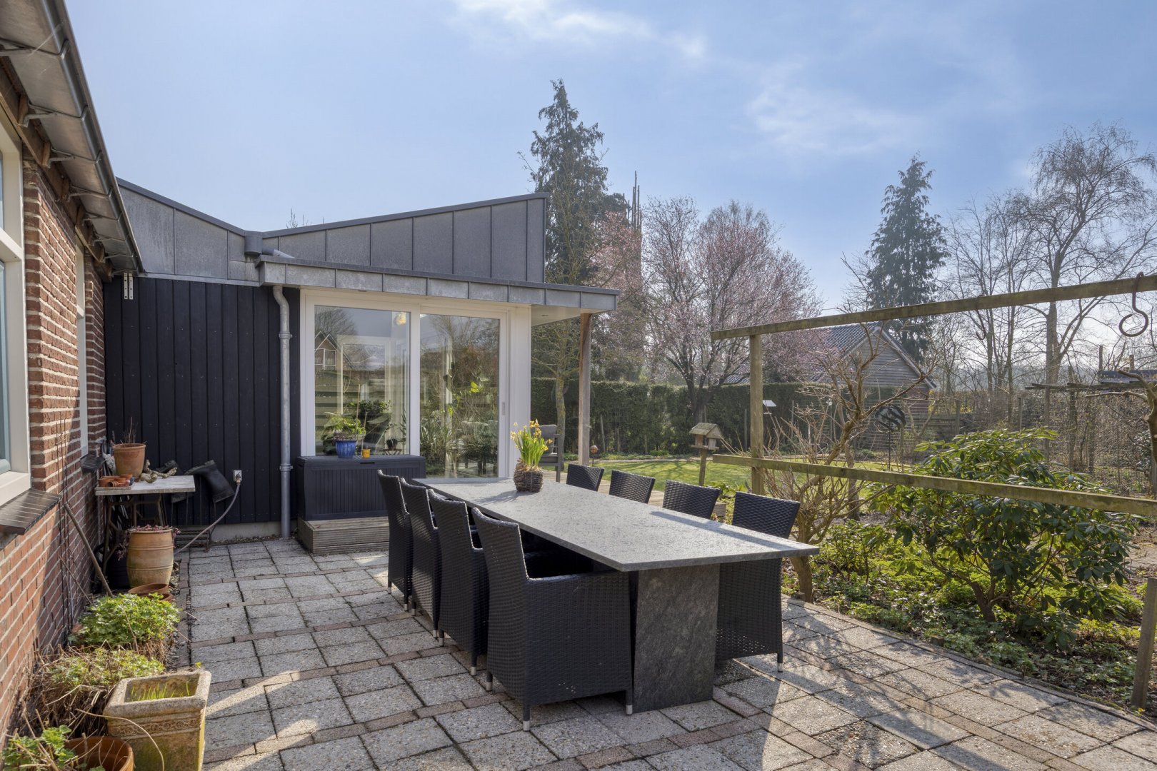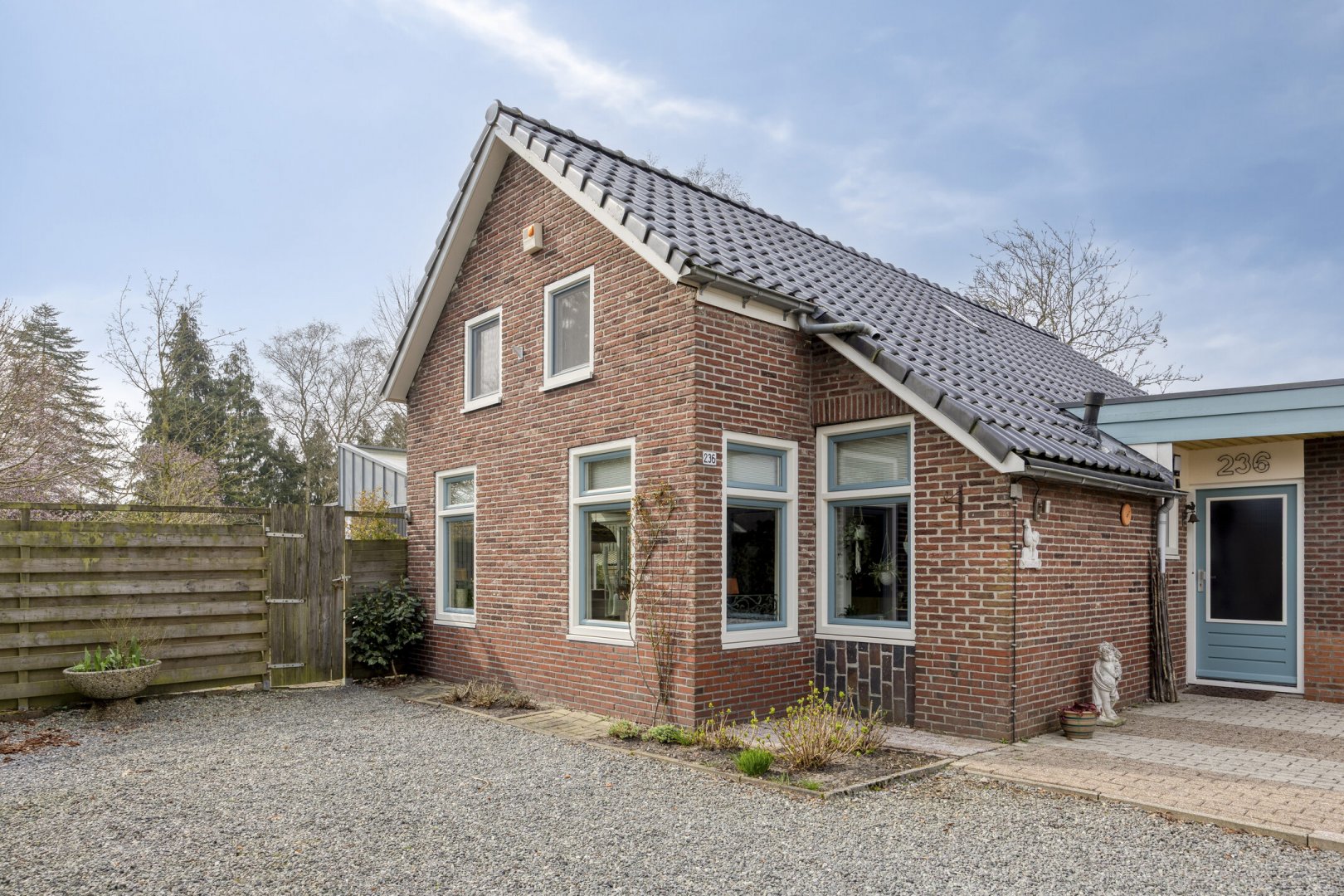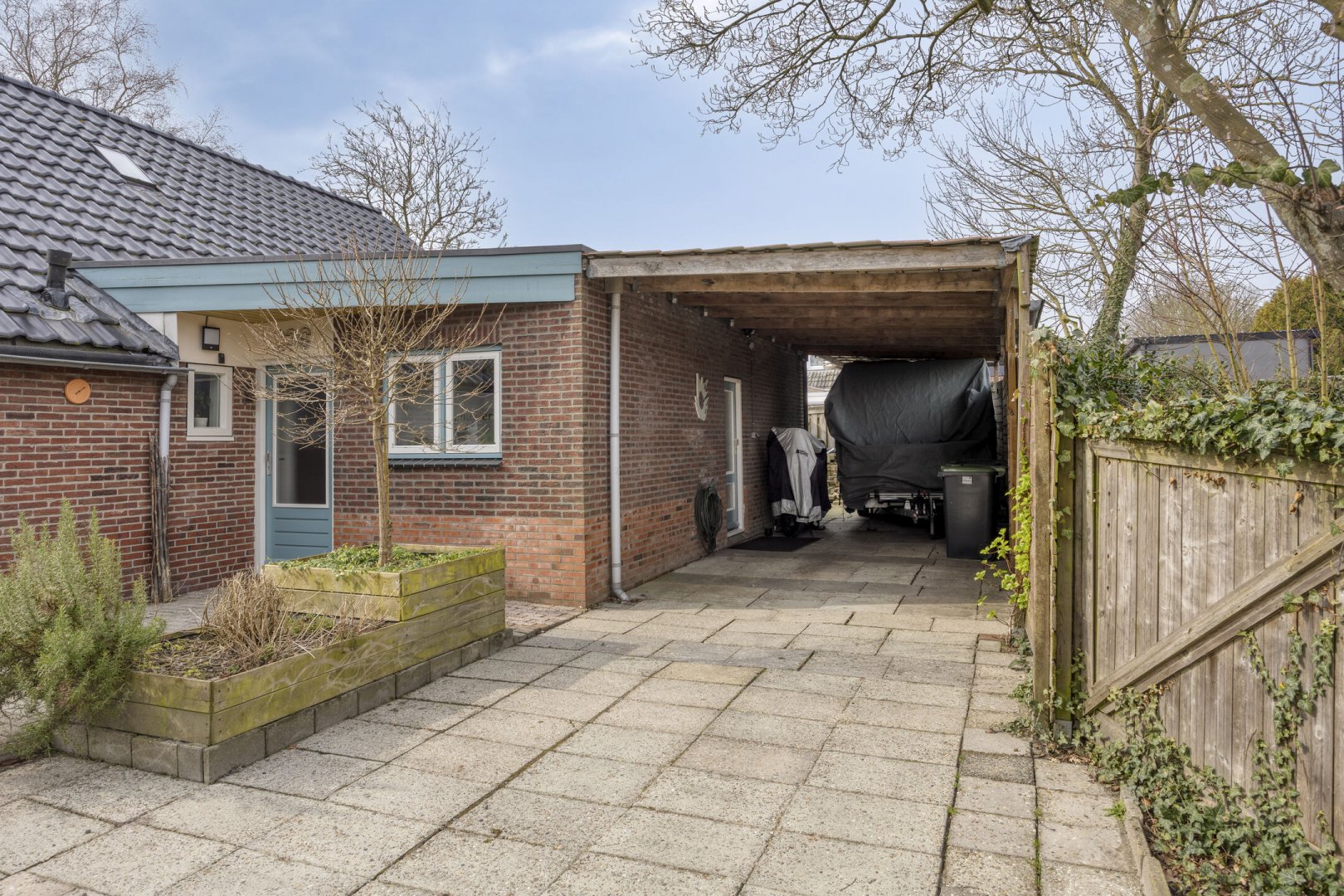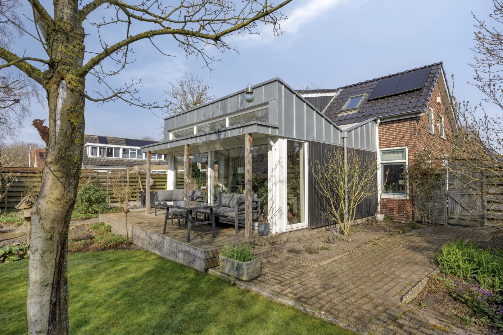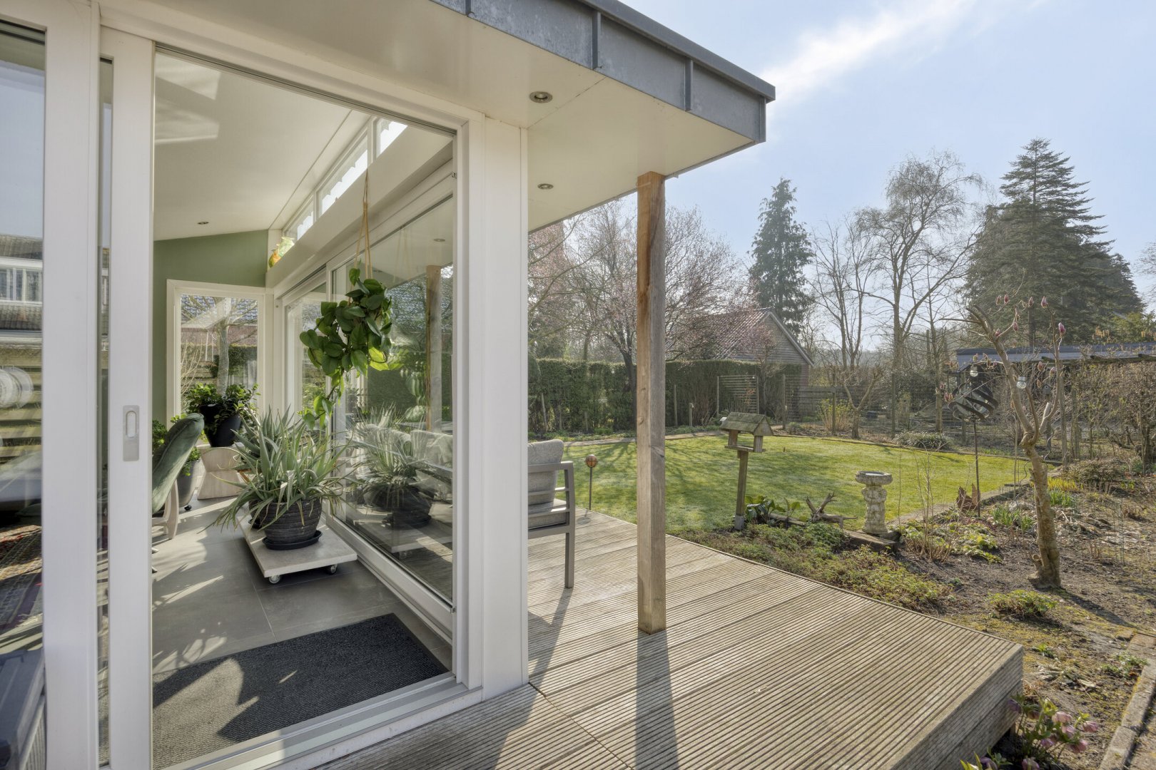Op rustige locatie, beschut gelegen gemoderniseerde vrijstaande woning met carport, houten tuinhuis, terrasoverkapping, volière, erf en fraai aangelegde tuin op het zuiden met vijverpartij en veel privacy.