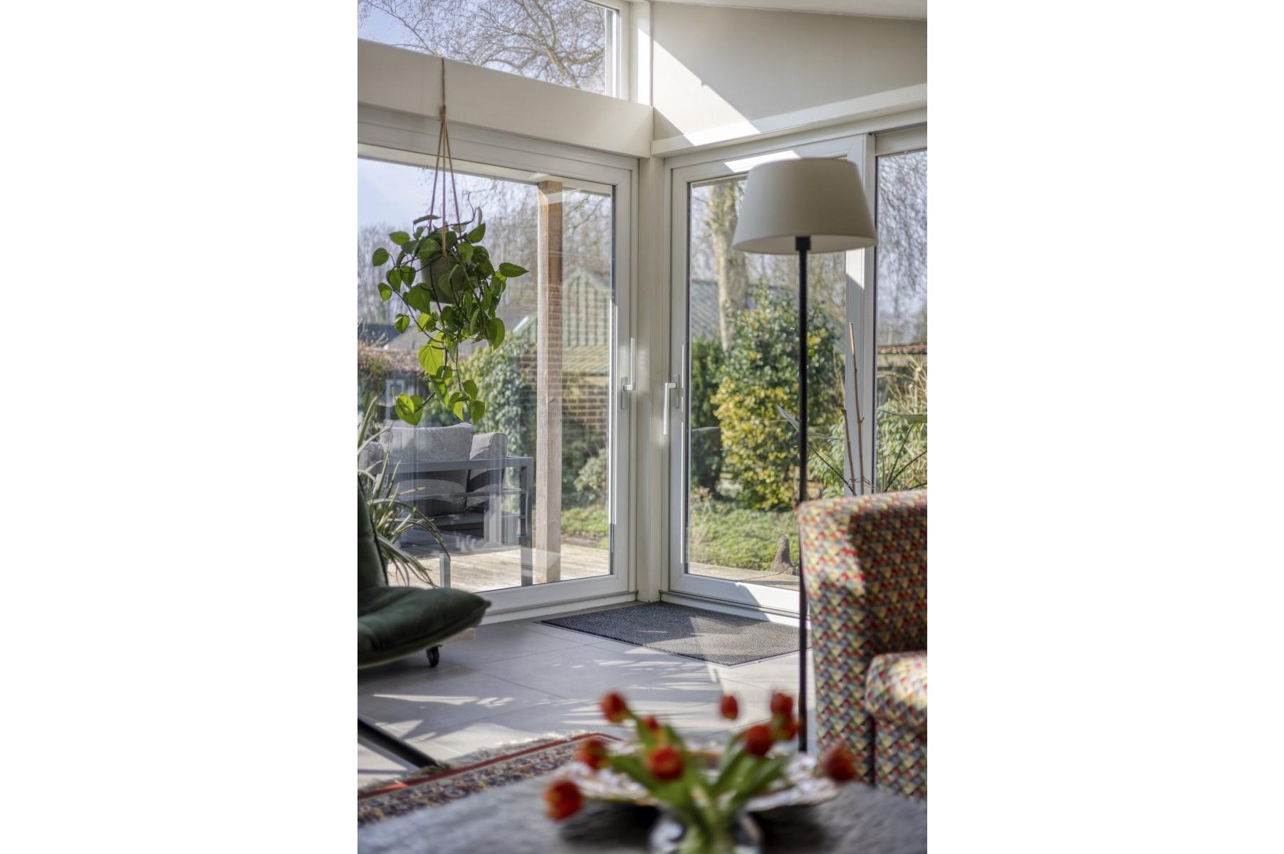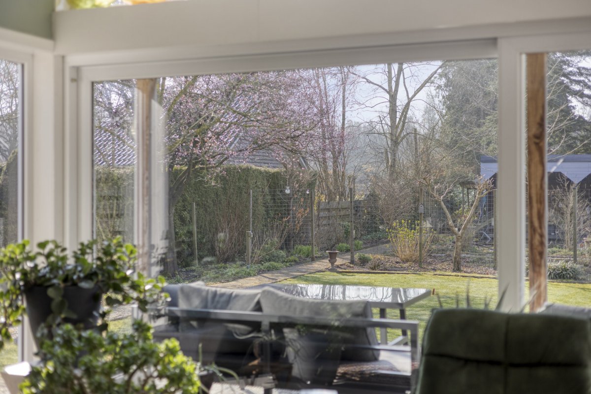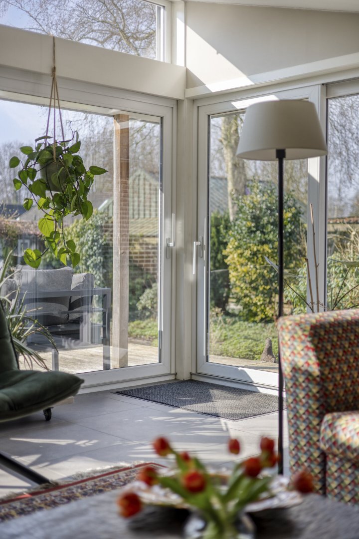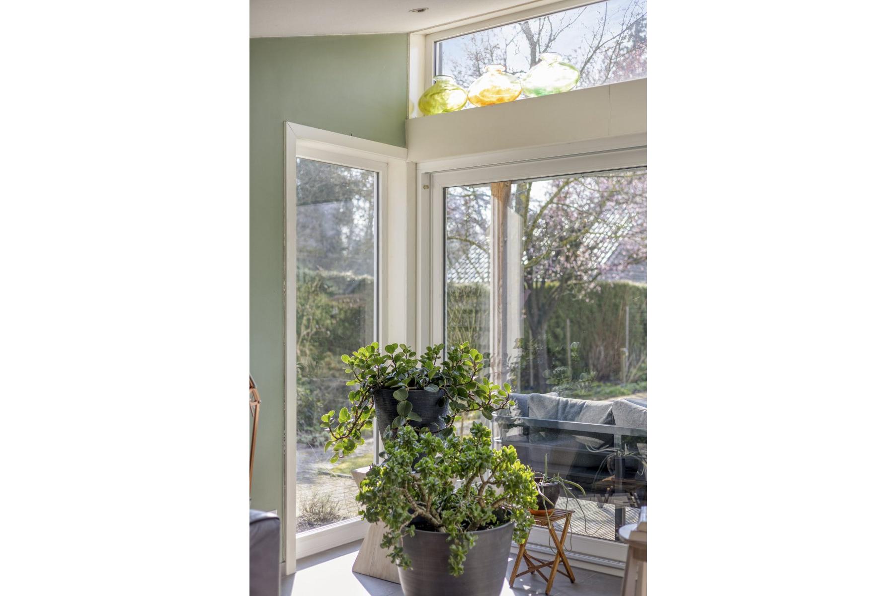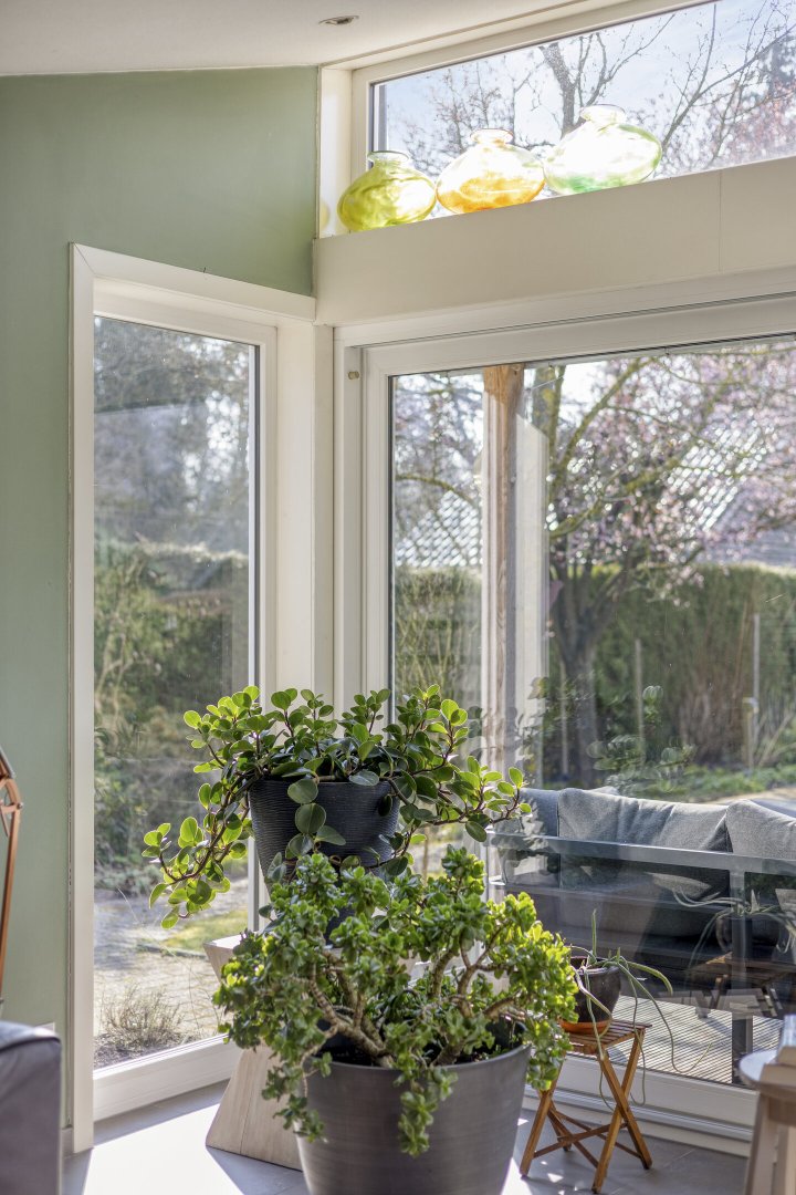 - Grotendeels kunststofkozijnwerk (HR++)