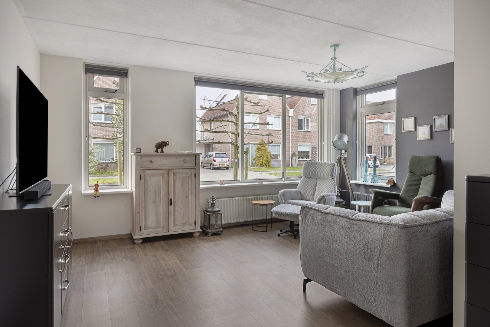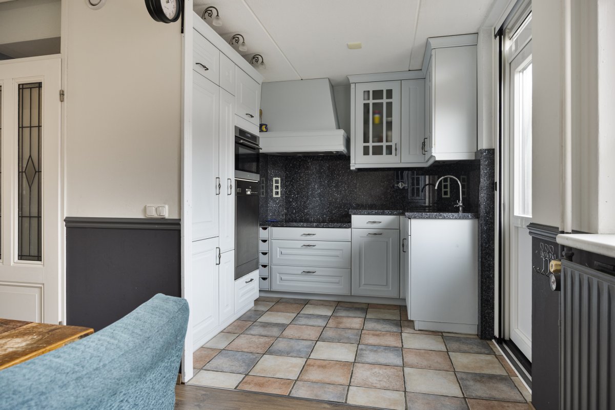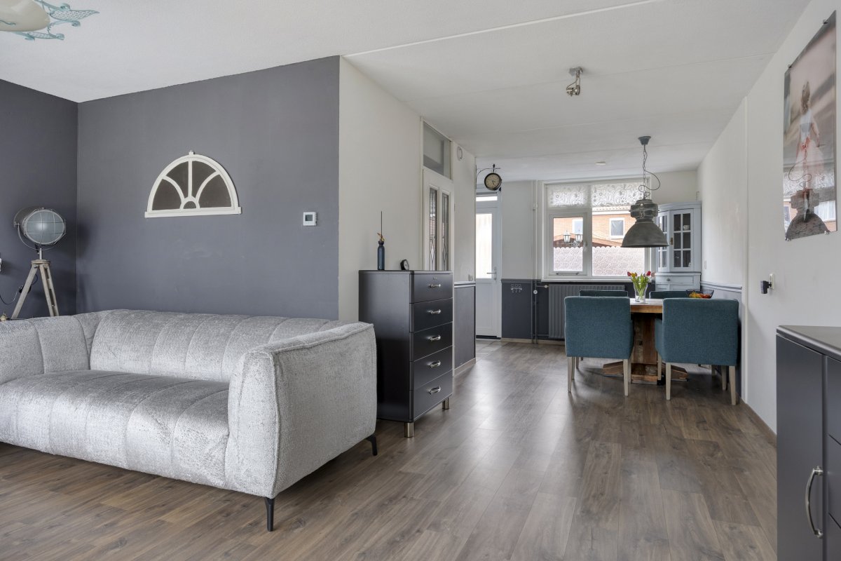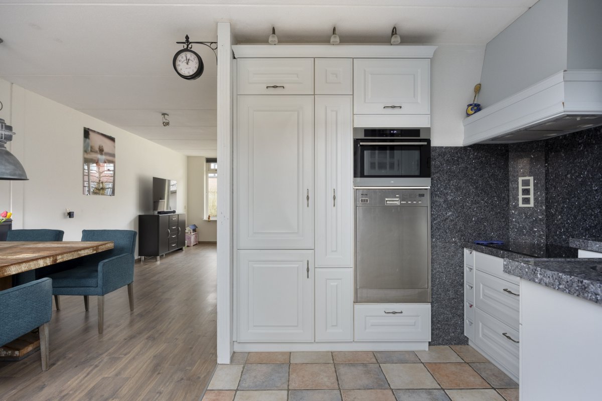 Zijentree, hal ca.4 m² met meterkast met 3 fasen aansluiting en modern hangend toilet met fontein, L-vormige woonkamer ca.25 m² met laminaatvloer, open keuken ca.6m² (plv) de keuken is voorzien van een inductie kookplaat, afzuigkap, koelkast, diepvries, combi-magnetron, vaatwasser, apothekerskast en een natuurstenen aanrechtblad, openslaande deur naar het terras en de tuin.