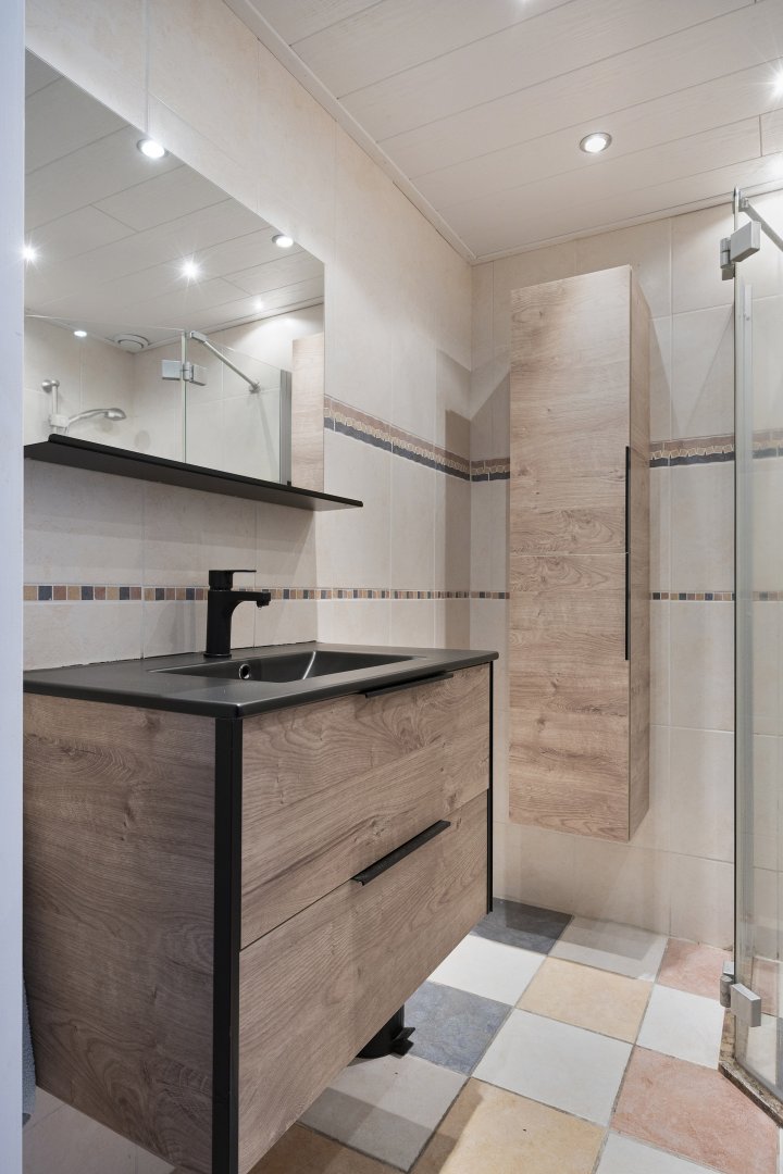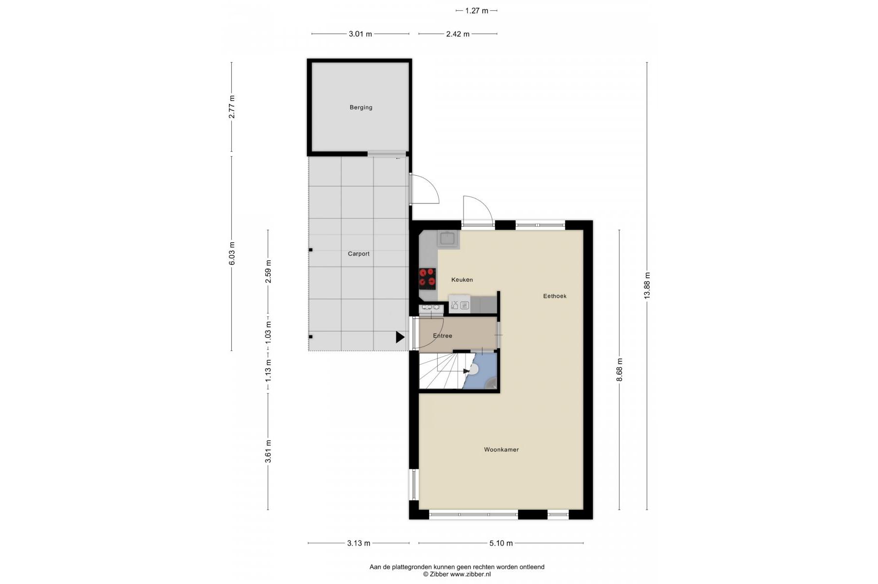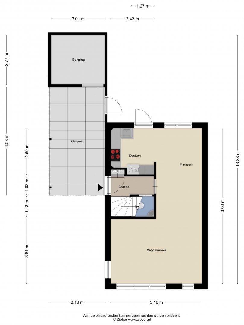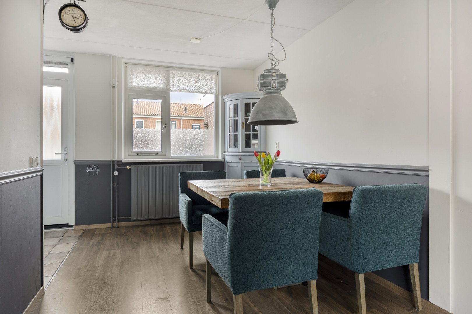 Zijentree, hal ca.4 m² met meterkast met 3 fasen aansluiting en modern hangend toilet met fontein, L-vormige woonkamer ca.25 m² met laminaatvloer, open keuken ca.6m² (plv) de keuken is voorzien van een inductie kookplaat, afzuigkap, koelkast, diepvries, combi-magnetron, vaatwasser, apothekerskast en een natuurstenen aanrechtblad, openslaande deur naar het terras en de tuin.