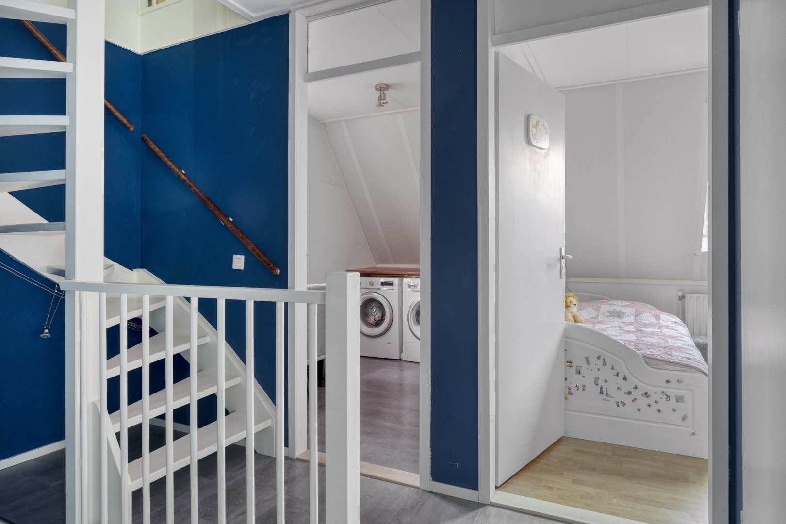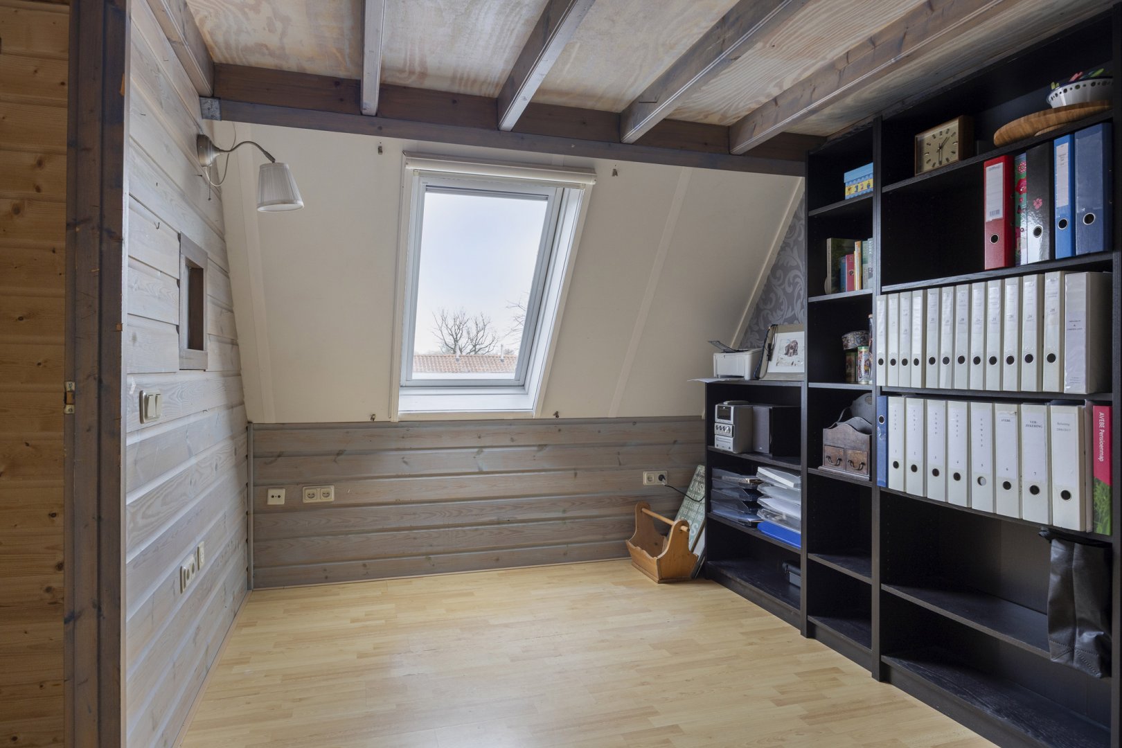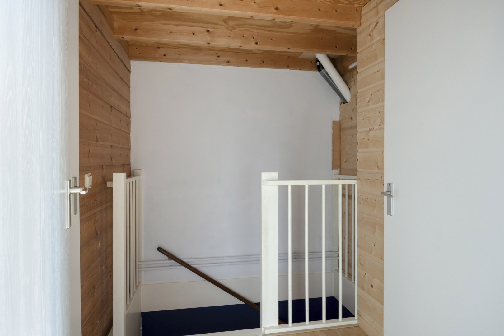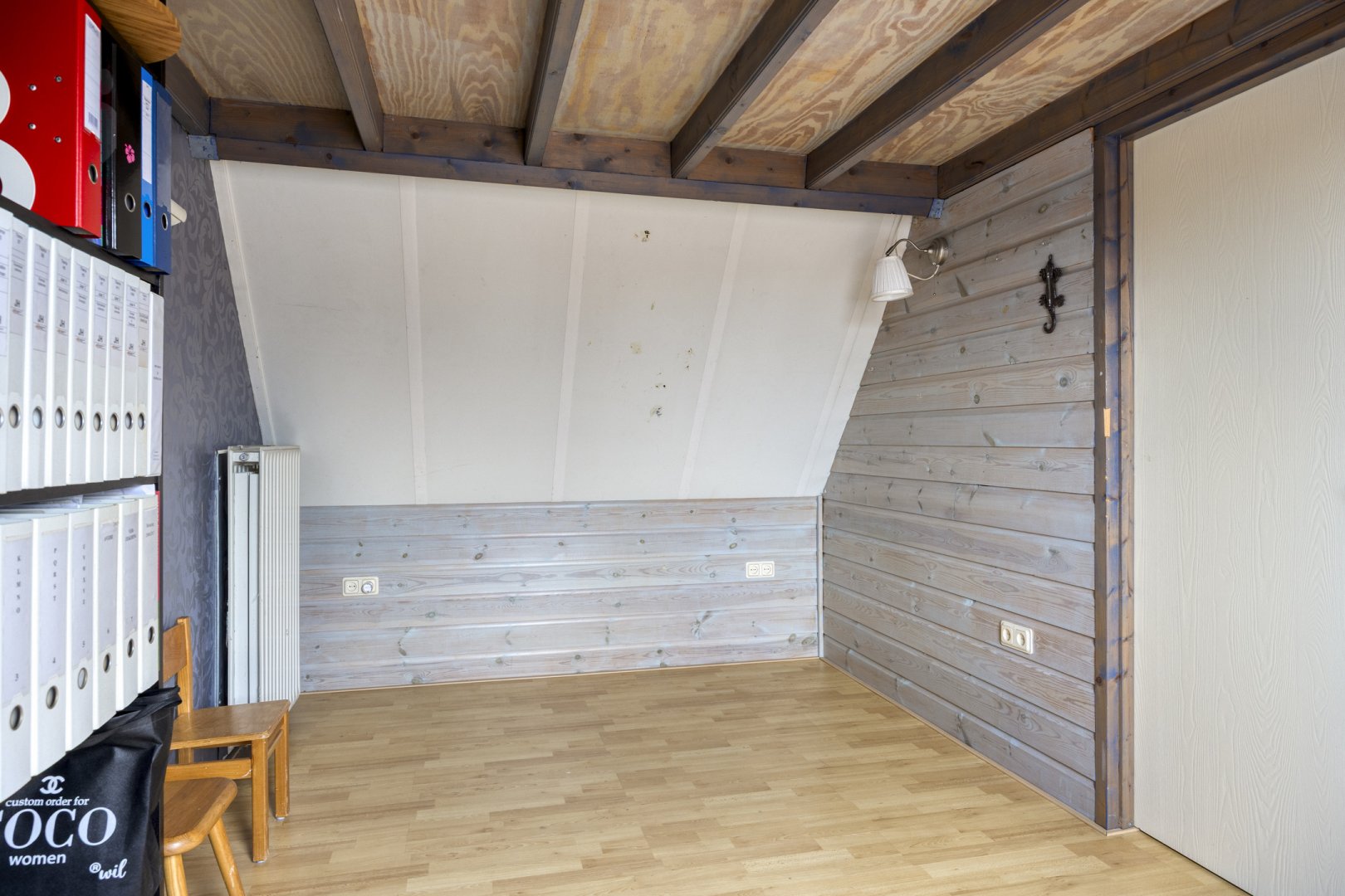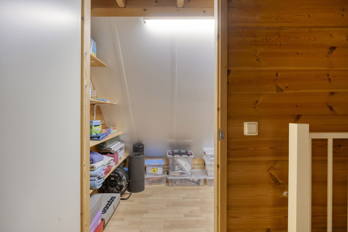 Overloop, berging, c.v. ruimte met witgoed aansluiting, zolder slaapkamer ca.3.65x2.55m, via luik naar een zolderberging.