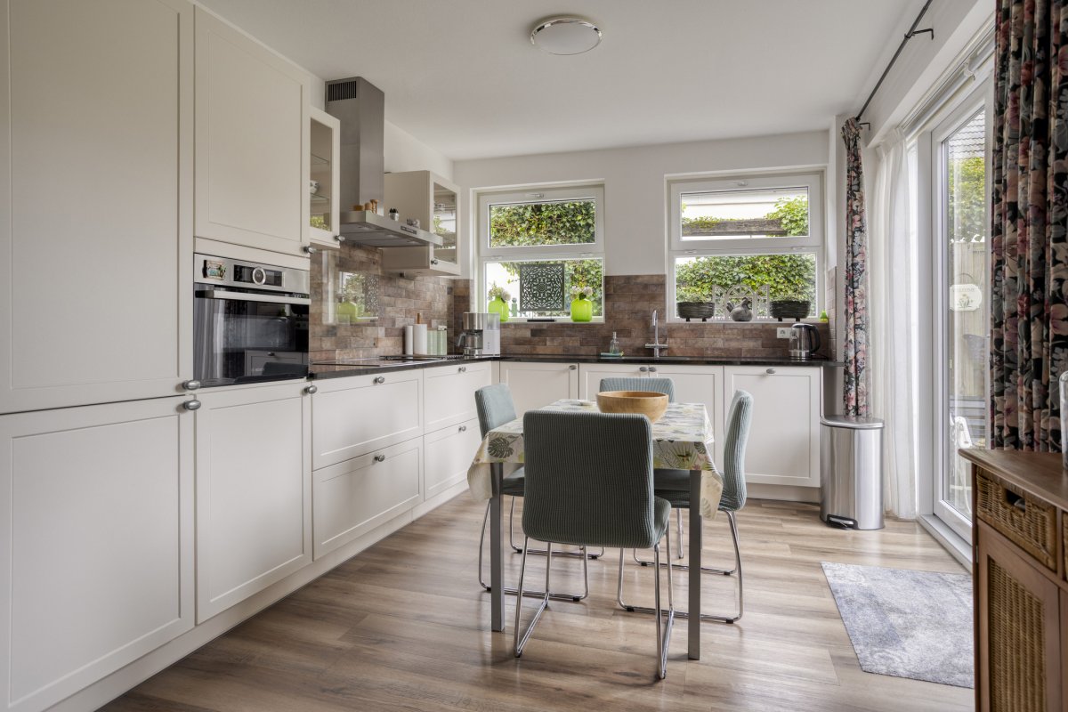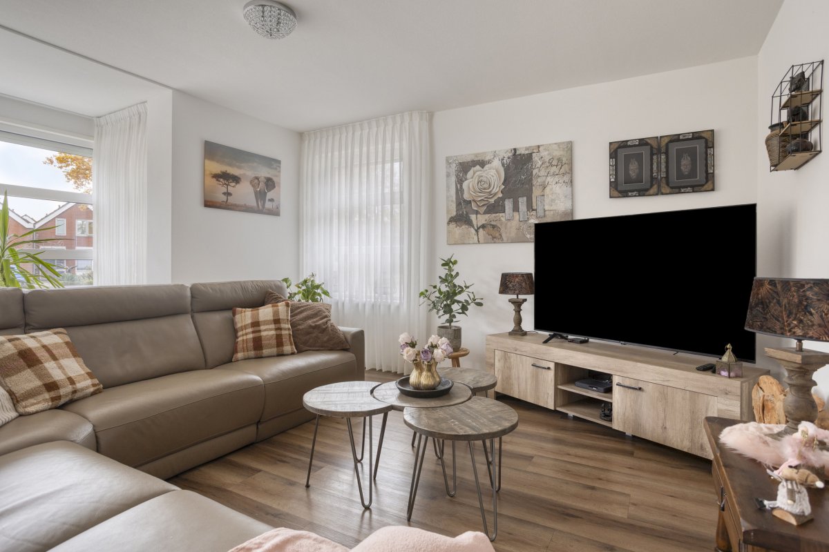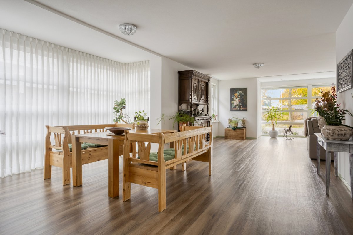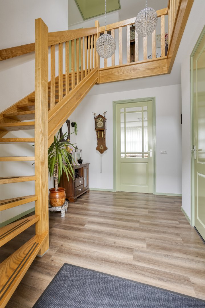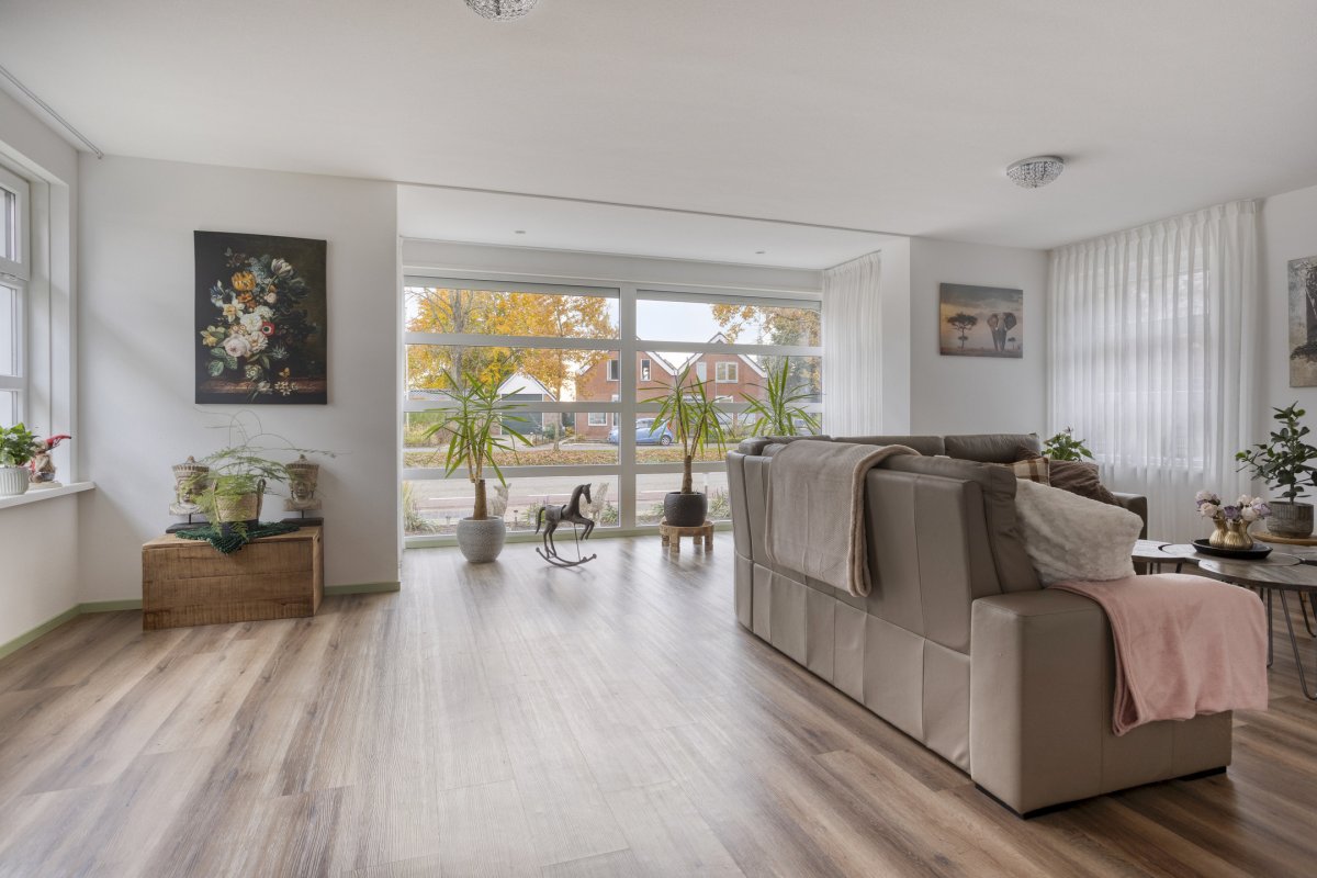 Begane grond: zijentree/hal, modern hangend toilet met fontein, een trap naar de verdieping, een ruime woonkamer ca.64m² (pvc vloer) L-vormig met 2 erkers, open keuken ca.20m² met terras deuren en een moderne hoekinbouwkeuken voorzien van inductie kookplaat, rvs afzuigkap, koelkast, combi oven, vaatwasser en hardstenen aanrechtblad, aangrenzend een royale bijkeuken ca.2.50x1.30m, achterhal, badkamer ca.2.45x2.45m met inloopdouche, wastafelmeubel en toilet en slaapkamer ca.4.20x3.75m met terrasdeuren.