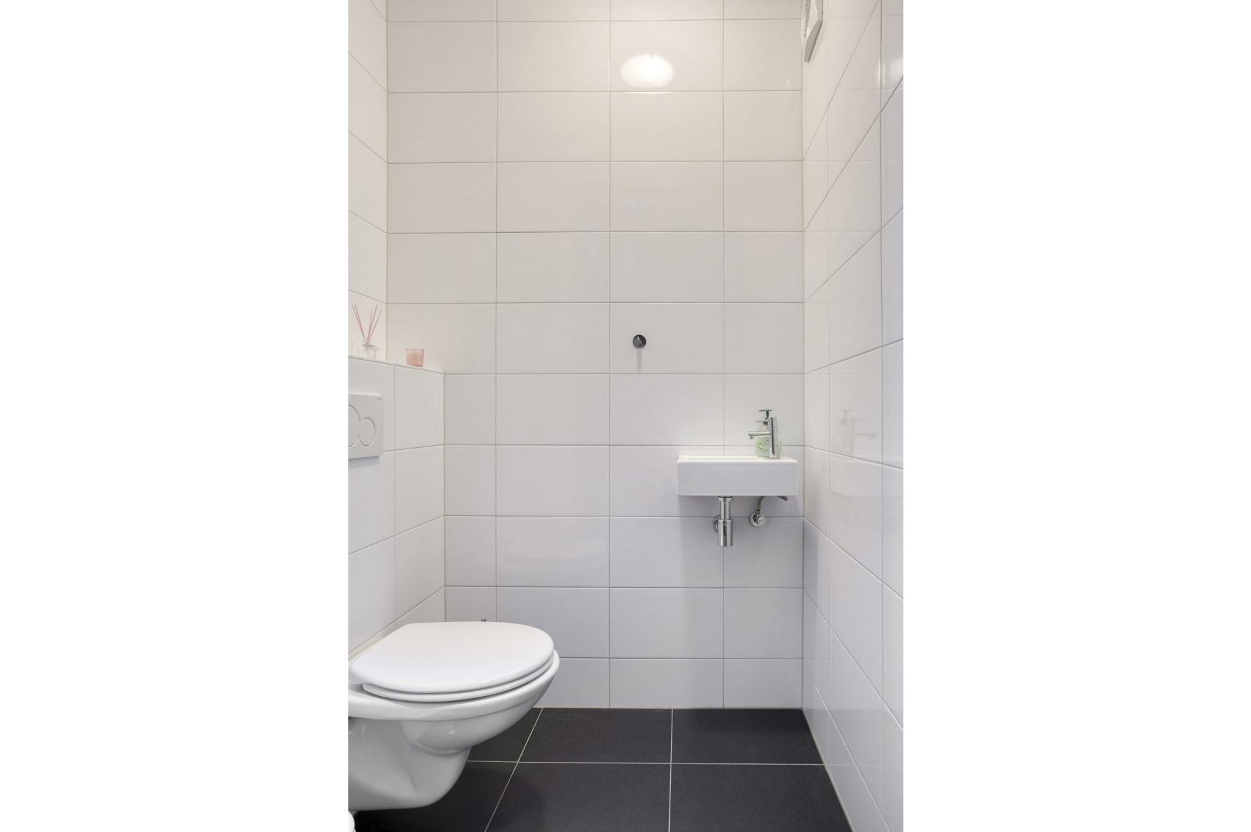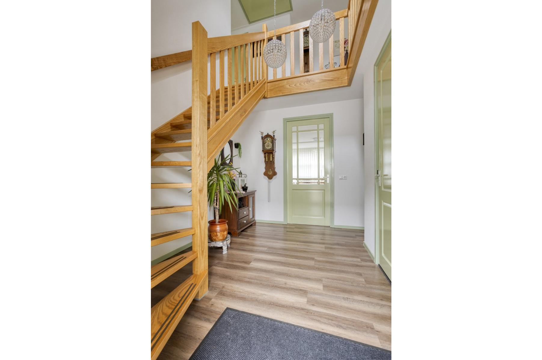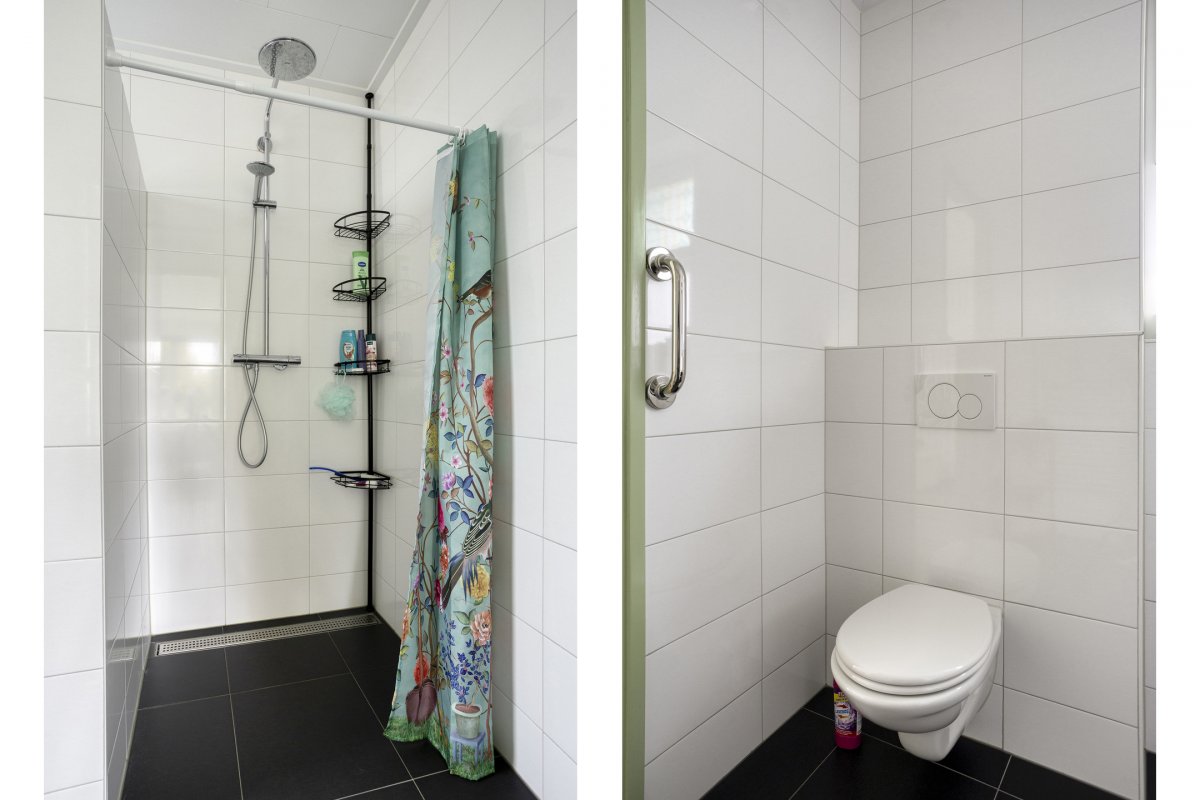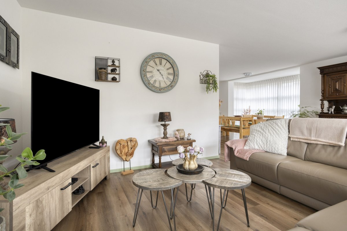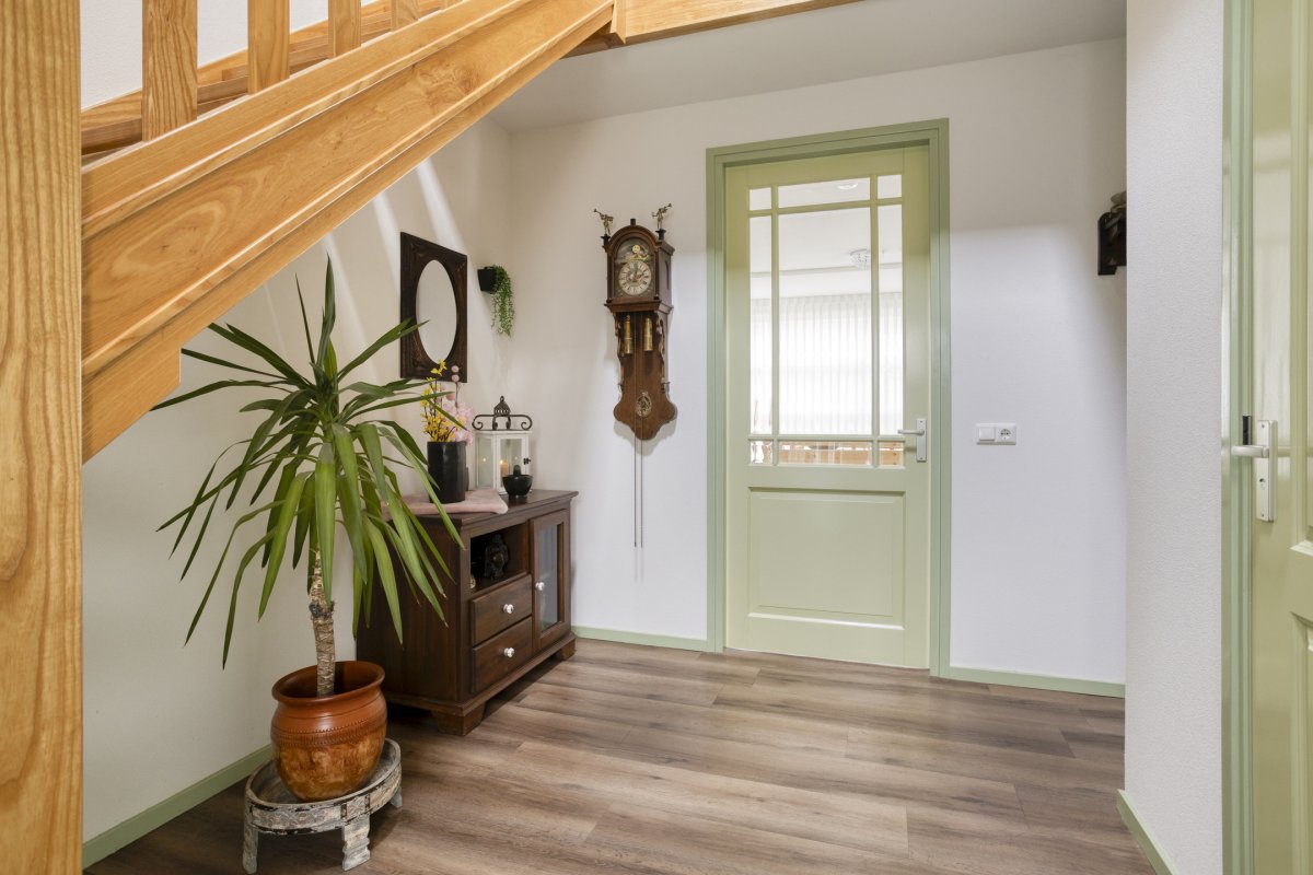 Begane grond: zijentree/hal, modern hangend toilet met fontein, een trap naar de verdieping, een ruime woonkamer ca.64m² (pvc vloer) L-vormig met 2 erkers, open keuken ca.20m² met terras deuren en een moderne hoekinbouwkeuken voorzien van inductie kookplaat, rvs afzuigkap, koelkast, combi oven, vaatwasser en hardstenen aanrechtblad, aangrenzend een royale bijkeuken ca.2.50x1.30m, achterhal, badkamer ca.2.45x2.45m met inloopdouche, wastafelmeubel en toilet en slaapkamer ca.4.20x3.75m met terrasdeuren.