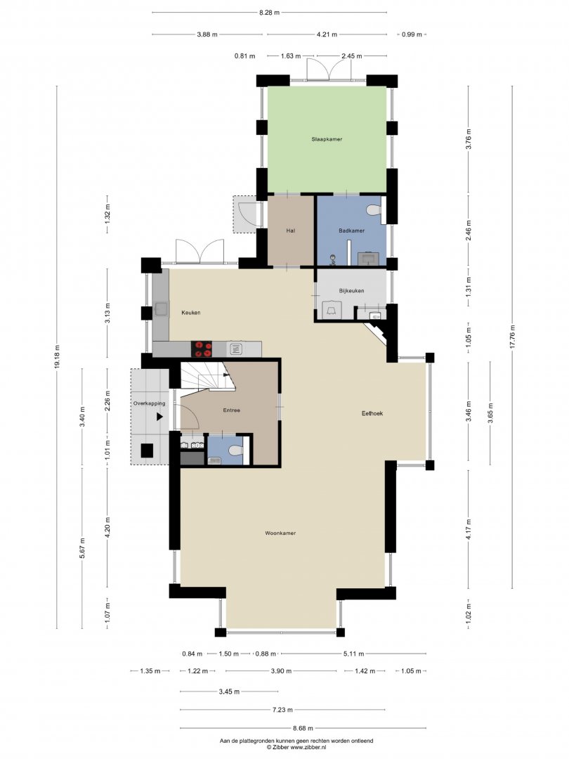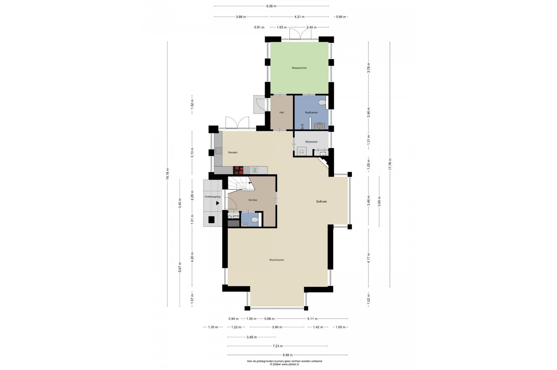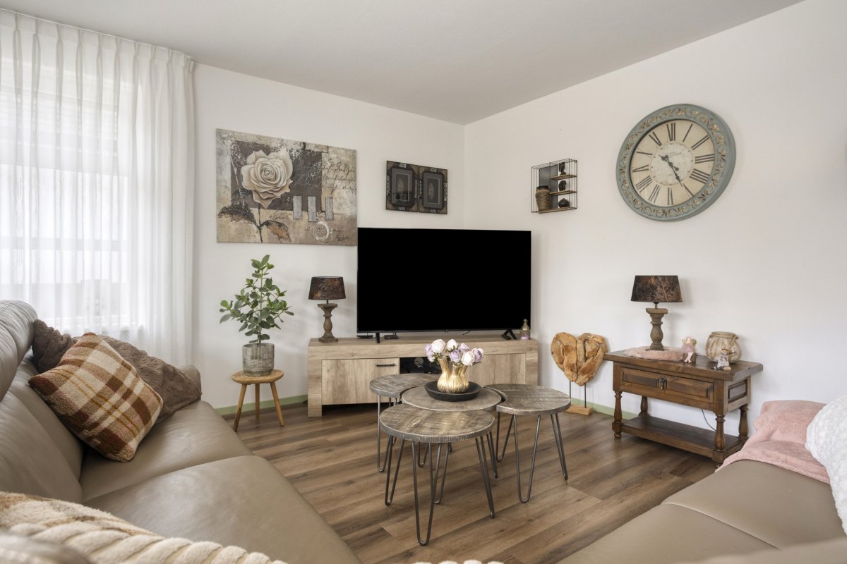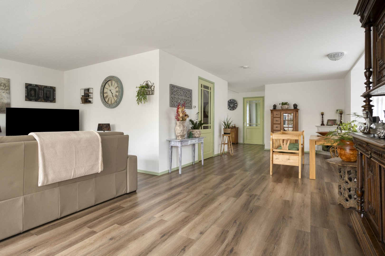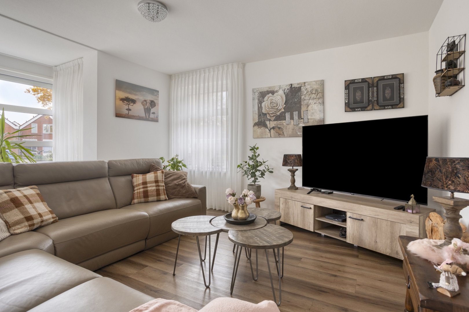 Begane grond: zijentree/hal, modern hangend toilet met fontein, een trap naar de verdieping, een ruime woonkamer ca.64m² (pvc vloer) L-vormig met 2 erkers, open keuken ca.20m² met terras deuren en een moderne hoekinbouwkeuken voorzien van inductie kookplaat, rvs afzuigkap, koelkast, combi oven, vaatwasser en hardstenen aanrechtblad, aangrenzend een royale bijkeuken ca.2.50x1.30m, achterhal, badkamer ca.2.45x2.45m met inloopdouche, wastafelmeubel en toilet en slaapkamer ca.4.20x3.75m met terrasdeuren.