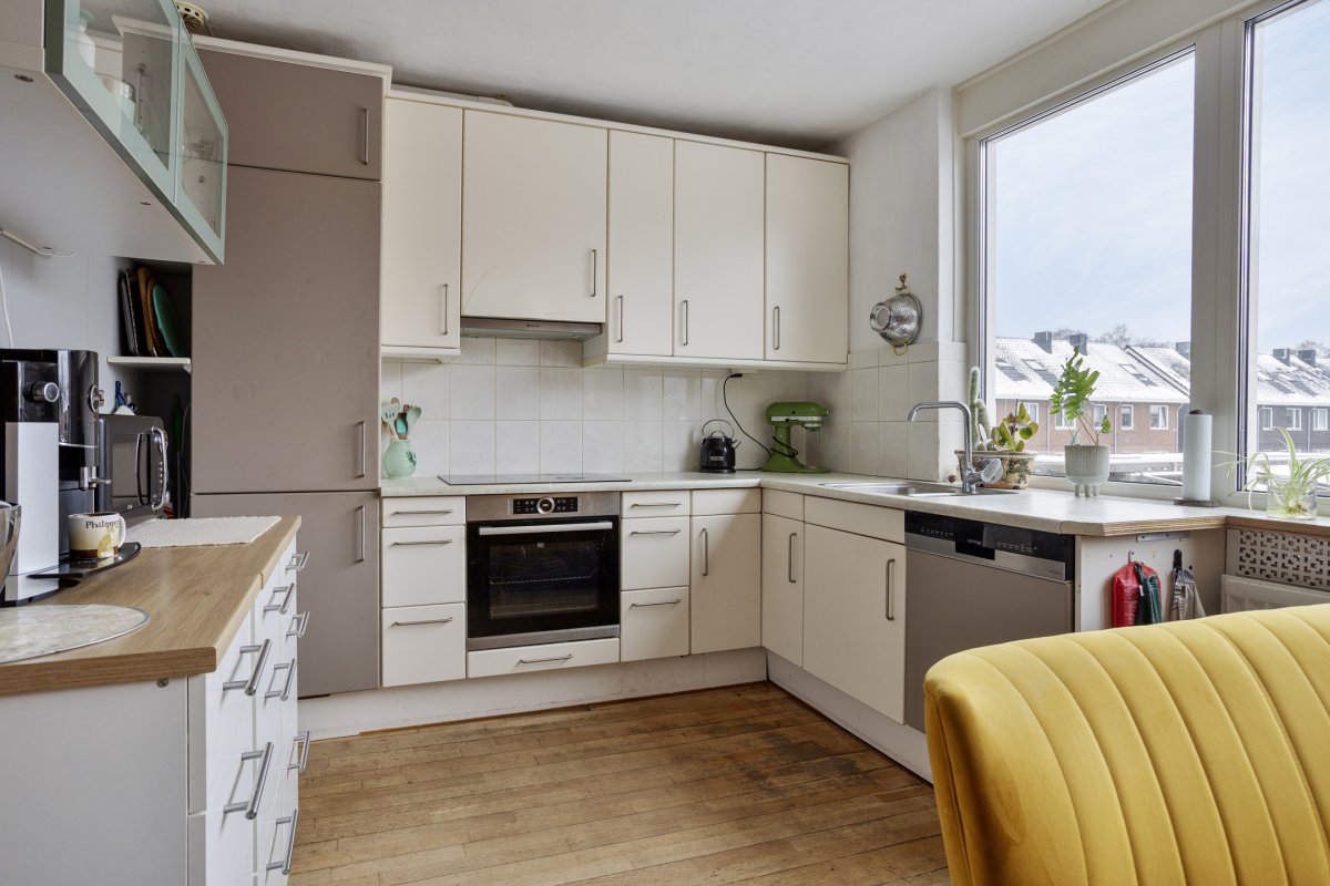 1e Verdieping: royale zonnige woonkamer ca.38m² (parketvloer) met balkon op het zuiden, semi-open keuken ca.15m² (parketvloer) in hoekopstelling voorzien van diverse apparatuur waaronder inductie kookplaat, afzuigkap, oven, koel/vries combinatie en vaatwasser.
