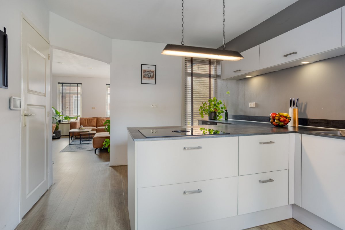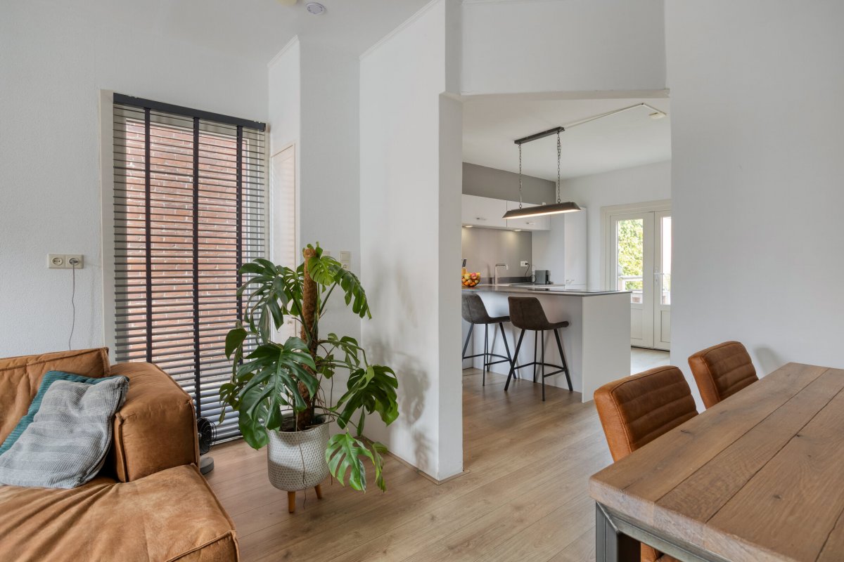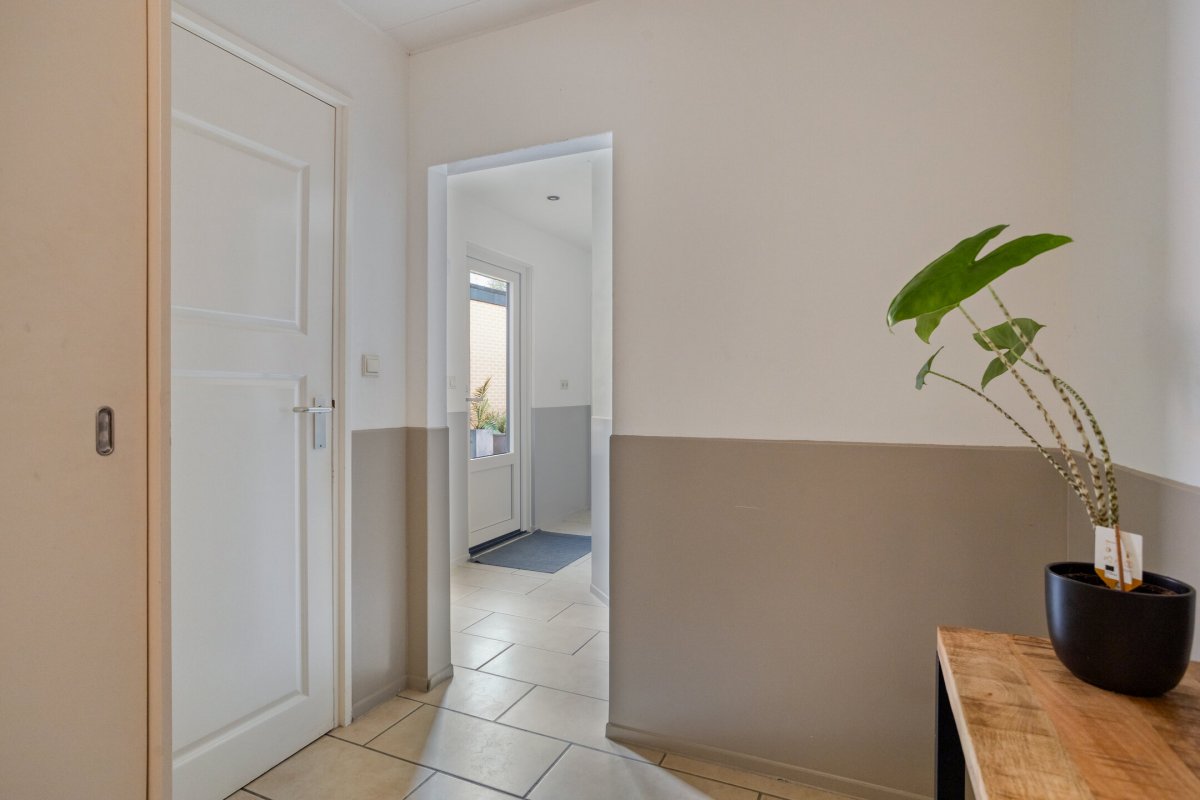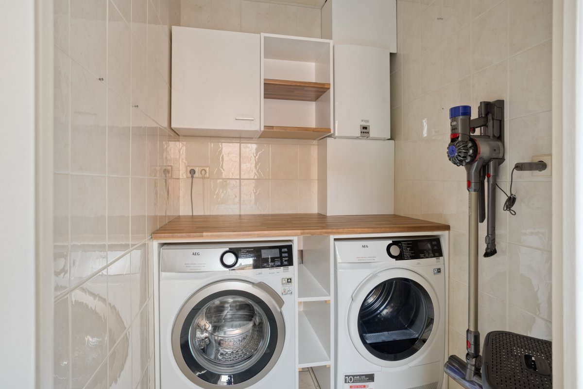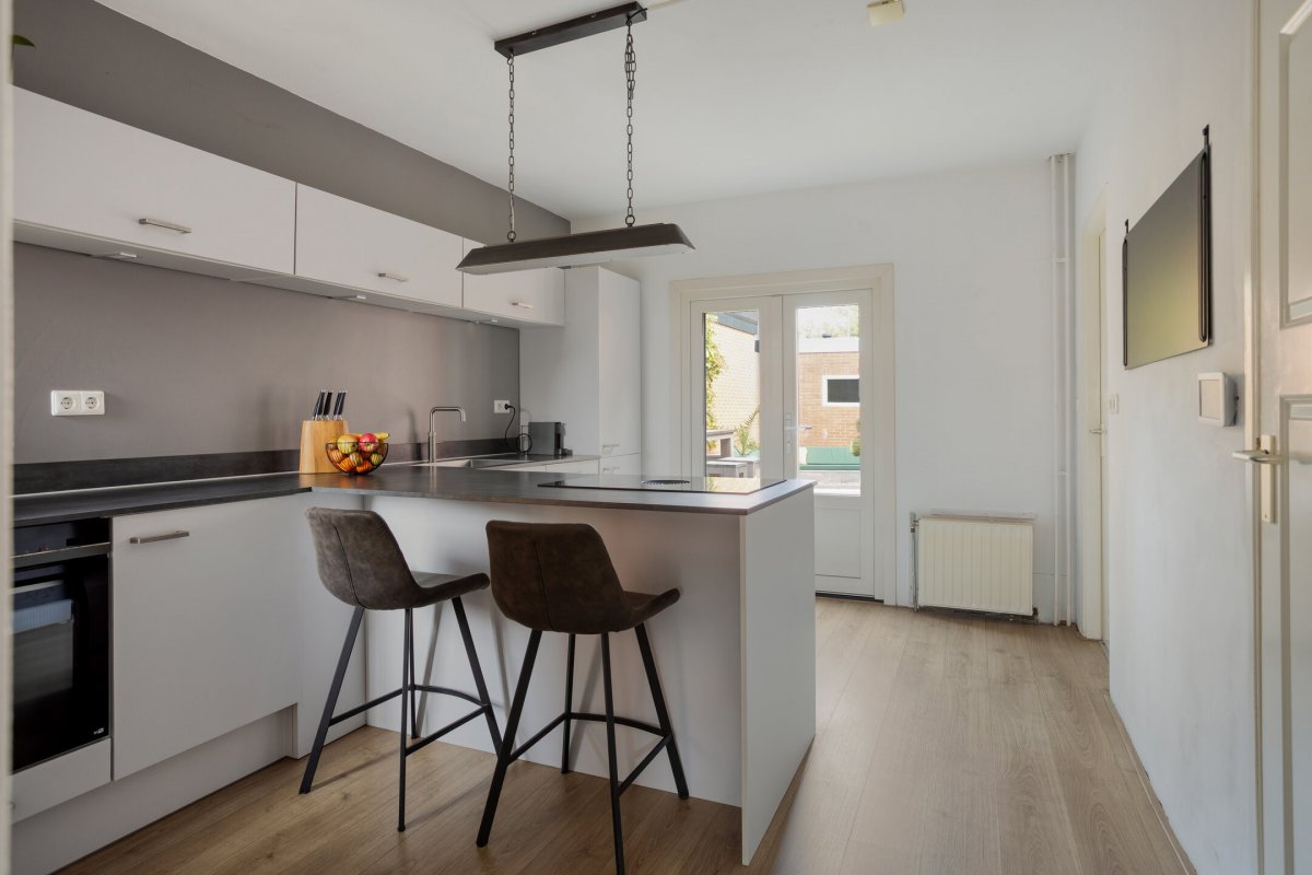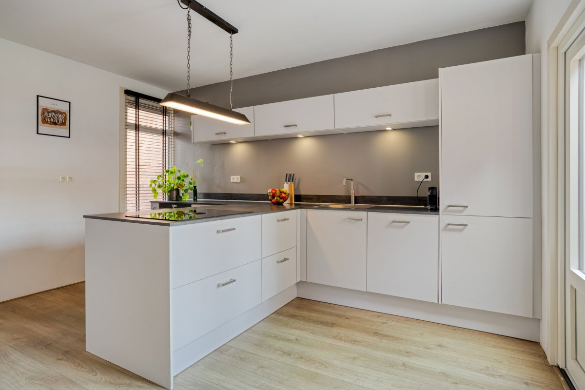 Indeling: Achterentree/hal (plavuizen) met vloerverwarming, garderobenis, hangend toilet met fonteintje en vloerverwarming, woonkamer ca. 25m (laminaatvloer), woonkeuken ca. 4.50x3.25m (laminaatvloer) met provisieruimte, openslaande terrasdeuren en lichte inbouwkeuken (2020) met semi-kookeiland voorzien van een inductie kookplaat met afzuiging (Bora), electrische combi-oven, vaatwasser, koelkast, vriezer en Quooker, bijkeuken (ca. 5m²) met vaste kastenwand, separate ruimte met witgoedaansluiting, c.v.-opstelling, royale licht betegelde badkamer met vloerverwarming en lichtkoepel, daarnaast een ligbad, aparte doucheruimte en een badkamermeubel met dubbele wastafel.