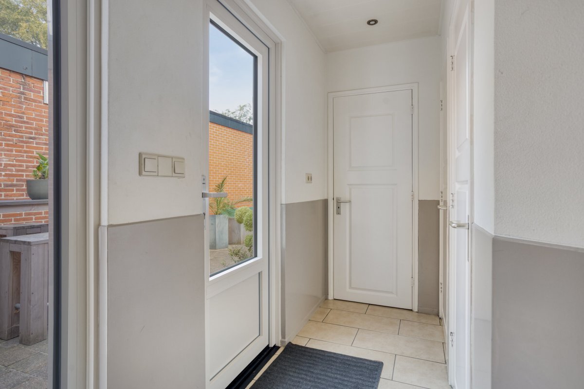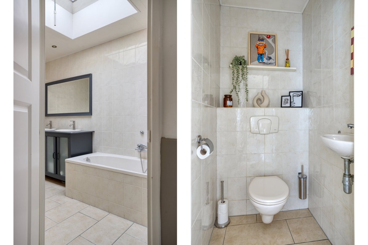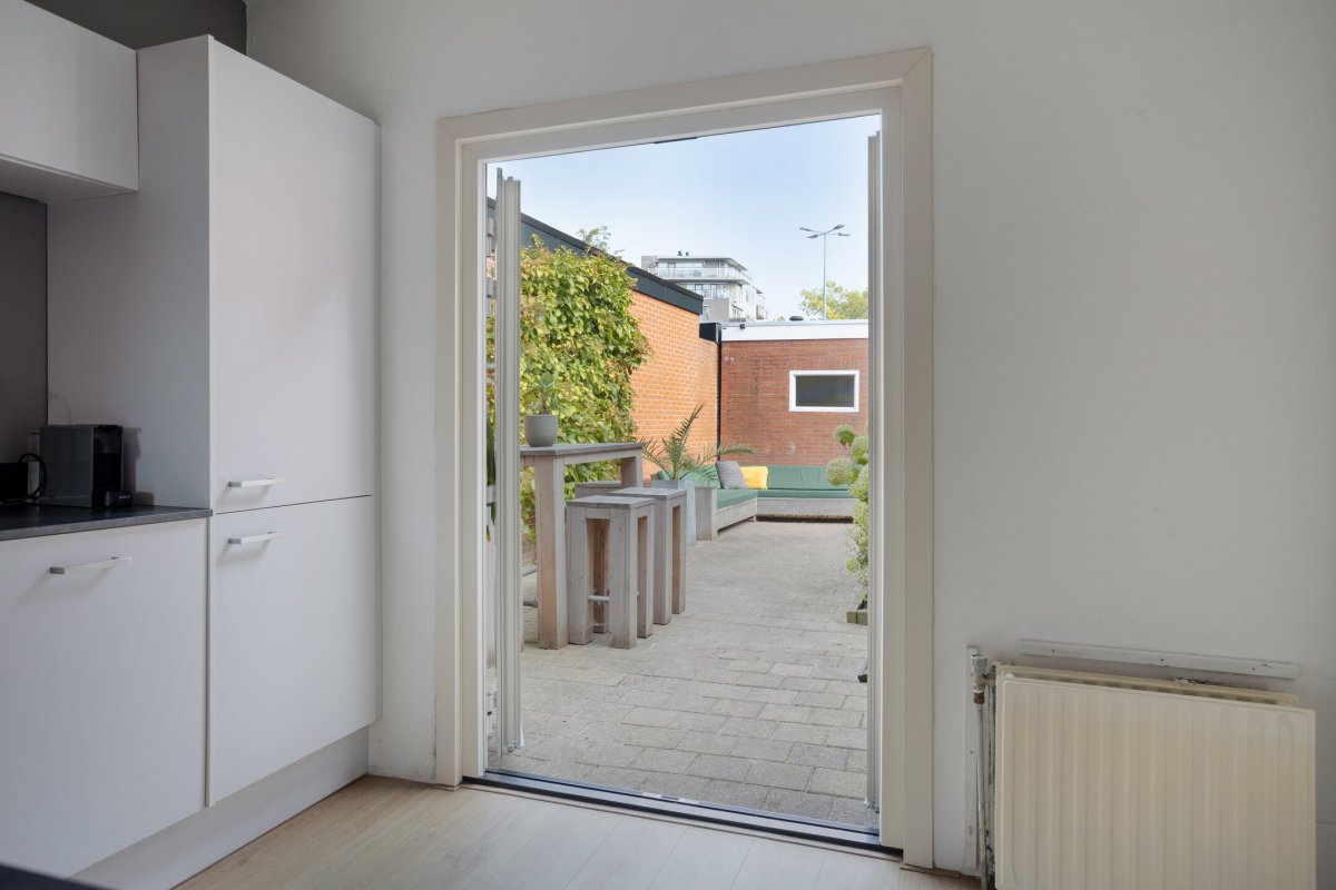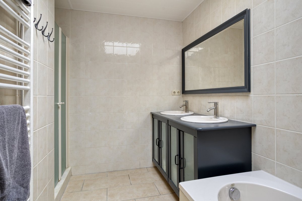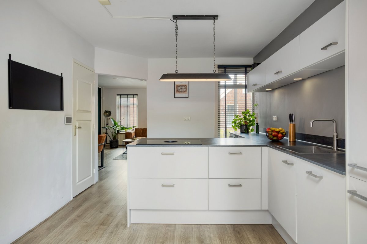 Indeling: Achterentree/hal (plavuizen) met vloerverwarming, garderobenis, hangend toilet met fonteintje en vloerverwarming, woonkamer ca. 25m (laminaatvloer), woonkeuken ca. 4.50x3.25m (laminaatvloer) met provisieruimte, openslaande terrasdeuren en lichte inbouwkeuken (2020) met semi-kookeiland voorzien van een inductie kookplaat met afzuiging (Bora), electrische combi-oven, vaatwasser, koelkast, vriezer en Quooker, bijkeuken (ca. 5m²) met vaste kastenwand, separate ruimte met witgoedaansluiting, c.v.-opstelling, royale licht betegelde badkamer met vloerverwarming en lichtkoepel, daarnaast een ligbad, aparte doucheruimte en een badkamermeubel met dubbele wastafel.