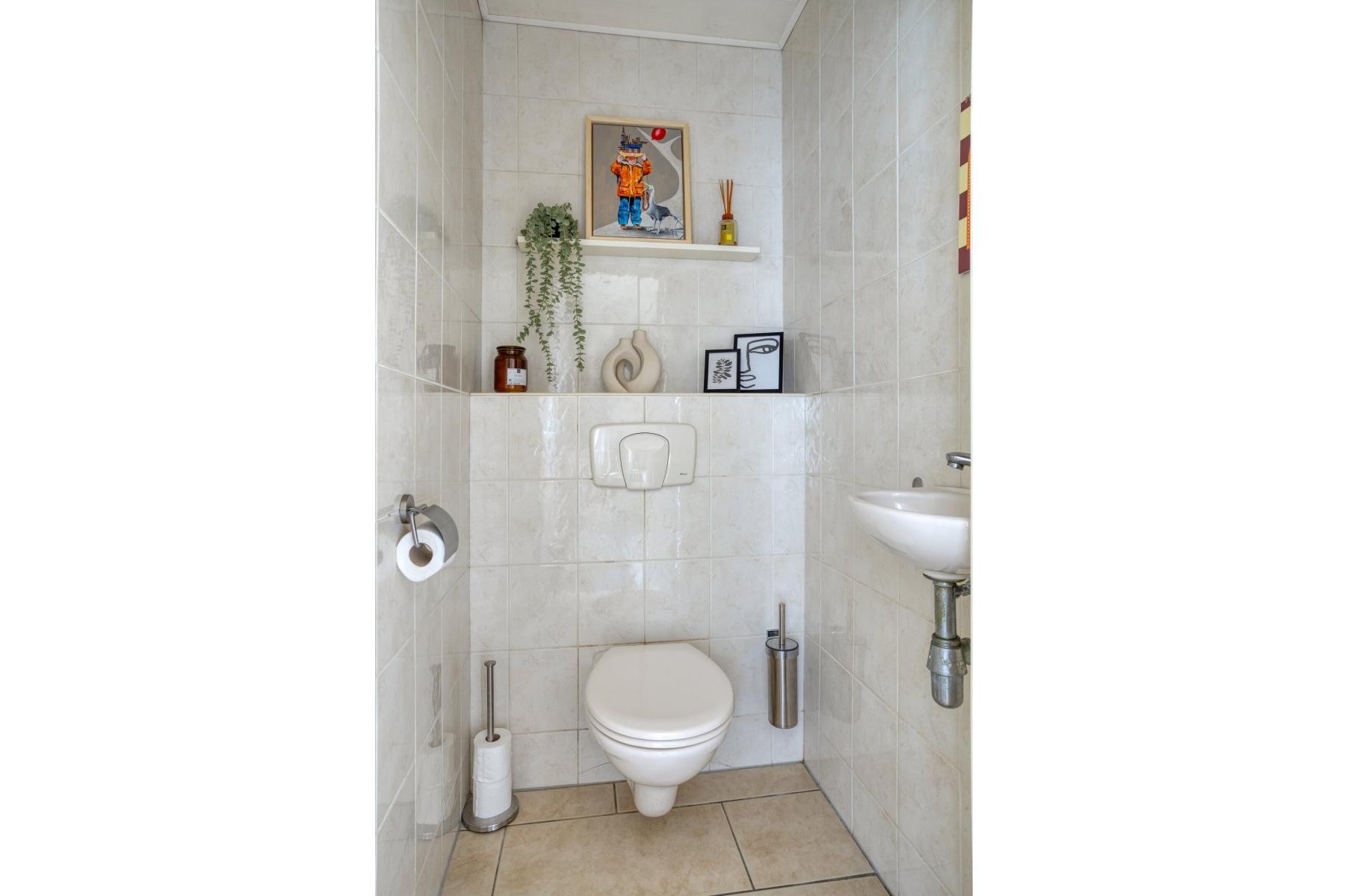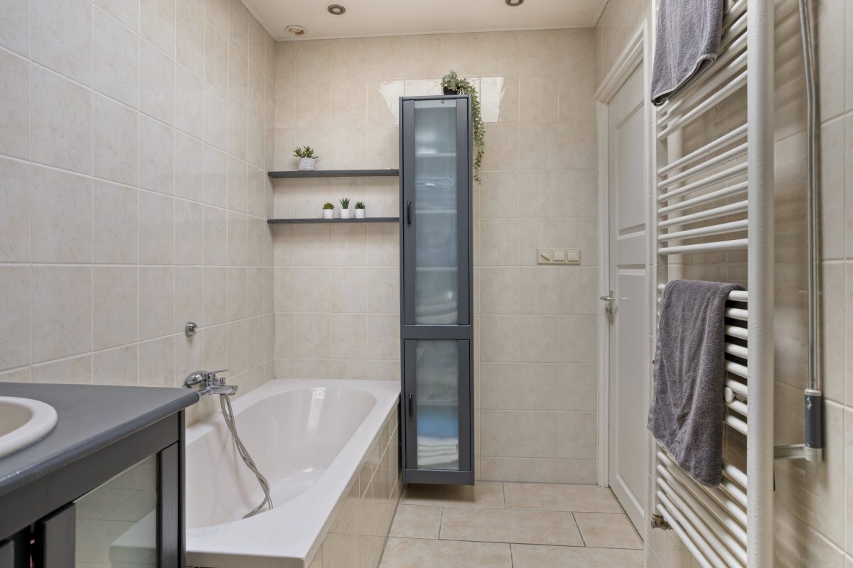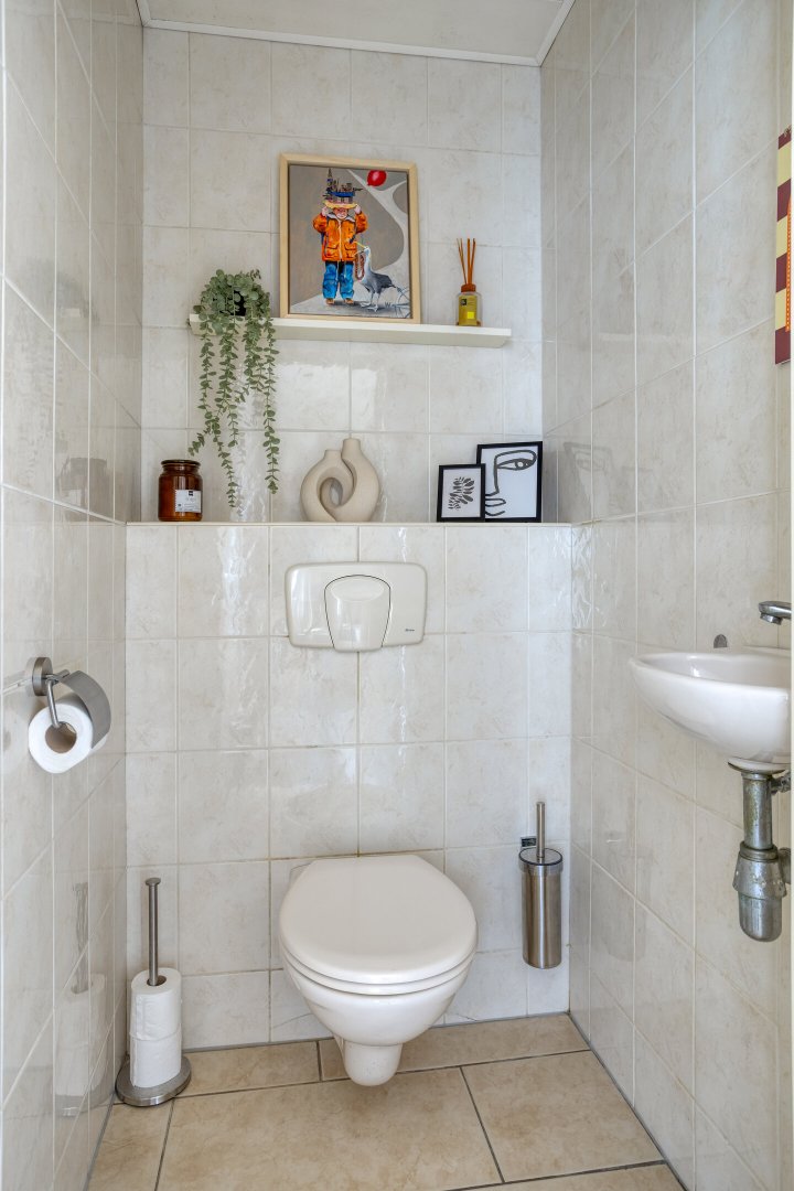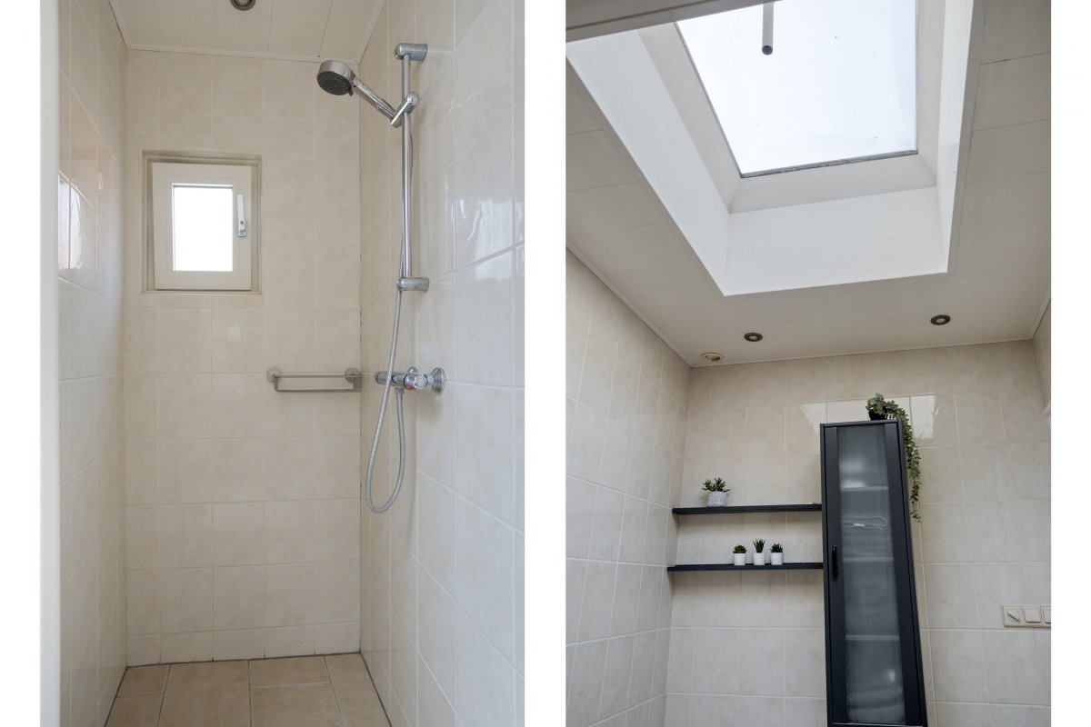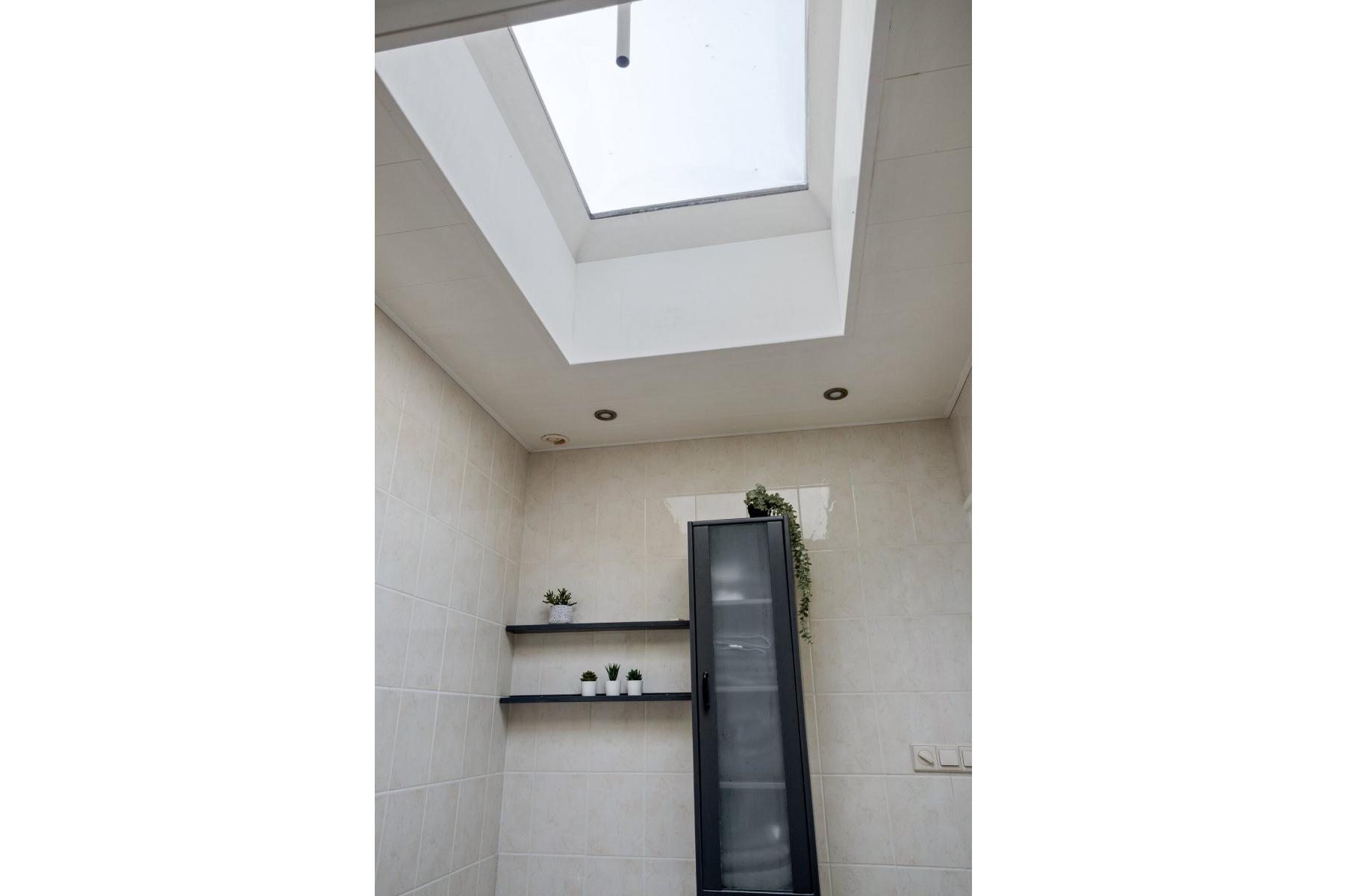 Indeling: Achterentree/hal (plavuizen) met vloerverwarming, garderobenis, hangend toilet met fonteintje en vloerverwarming, woonkamer ca. 25m (laminaatvloer), woonkeuken ca. 4.50x3.25m (laminaatvloer) met provisieruimte, openslaande terrasdeuren en lichte inbouwkeuken (2020) met semi-kookeiland voorzien van een inductie kookplaat met afzuiging (Bora), electrische combi-oven, vaatwasser, koelkast, vriezer en Quooker, bijkeuken (ca. 5m²) met vaste kastenwand, separate ruimte met witgoedaansluiting, c.v.-opstelling, royale licht betegelde badkamer met vloerverwarming en lichtkoepel, daarnaast een ligbad, aparte doucheruimte en een badkamermeubel met dubbele wastafel.