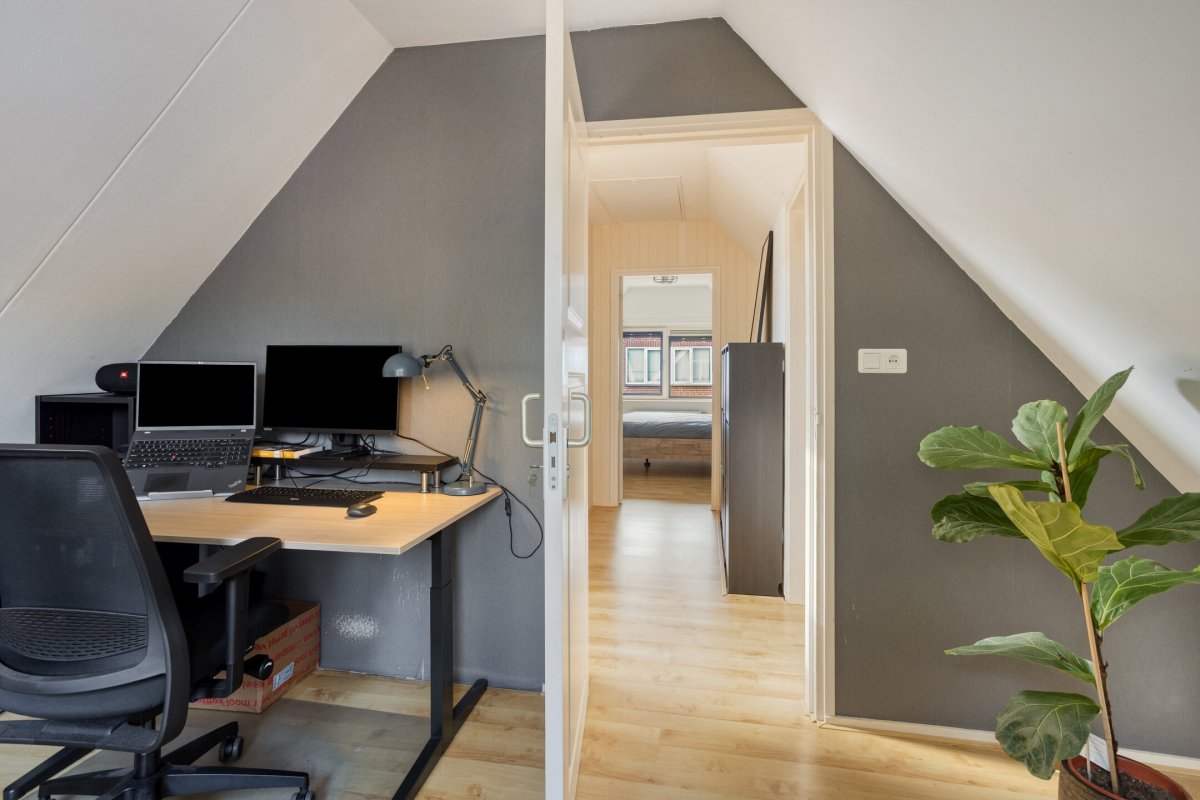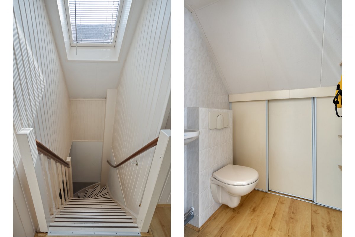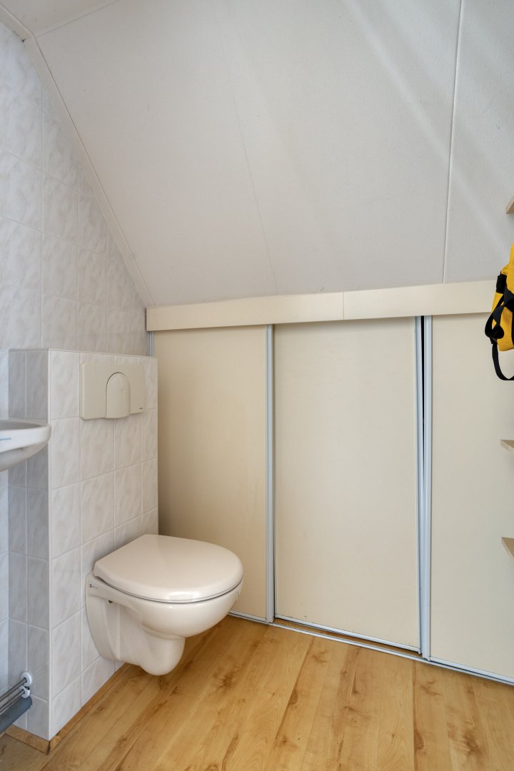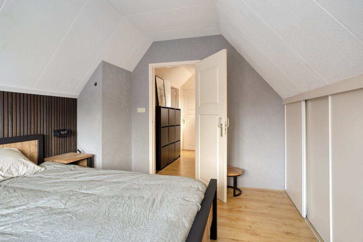 Verdieping: overloop met inloopkast, tweede hangend toilet met fonteintje, 3 slaapkamers (resp. ca. 8m² (met zgn. "hooizolder"), ca.10m² (met inbouwkast) en ca.12m² (voorzien van berging achter de knieschotten) alle met laminaatvloer.